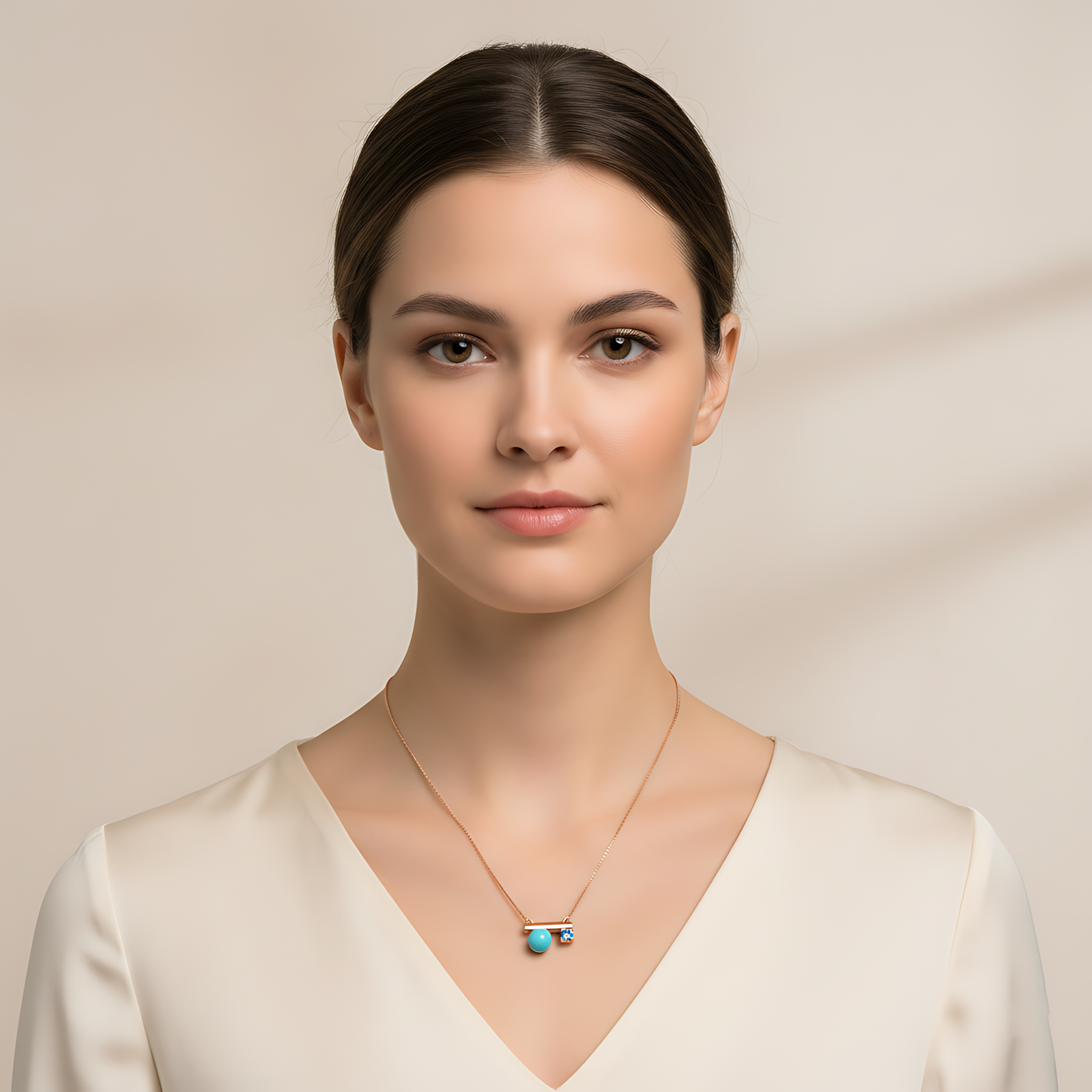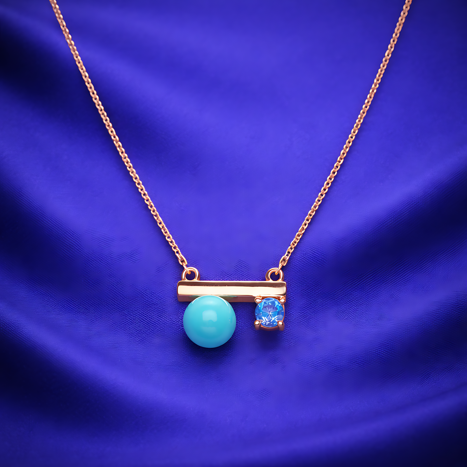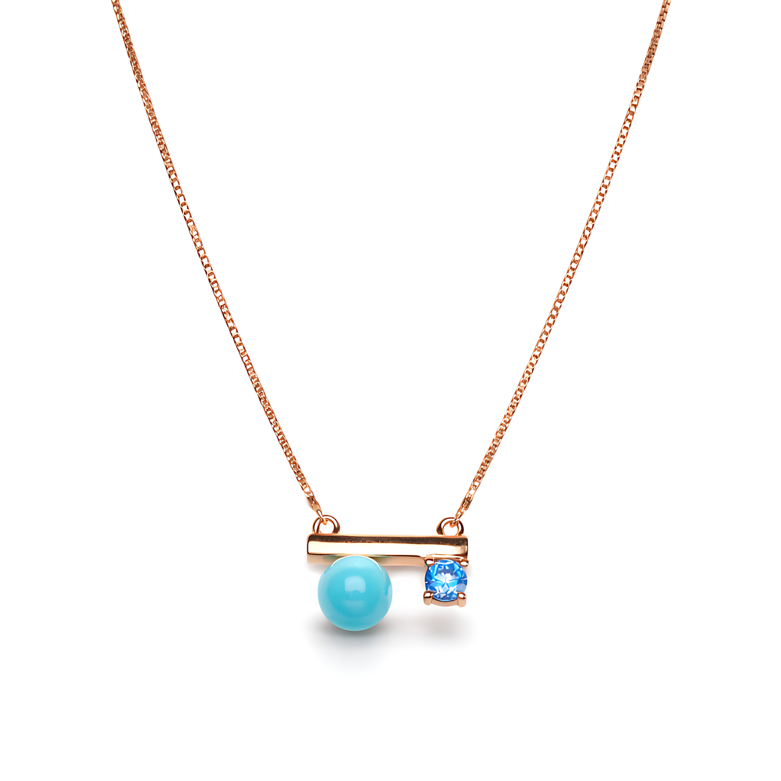 A modern rose gold-toned necklace featuring a horizontal bar pendant adorned with a large turquoise-colored sphere and a small, square-cut blue crystal.