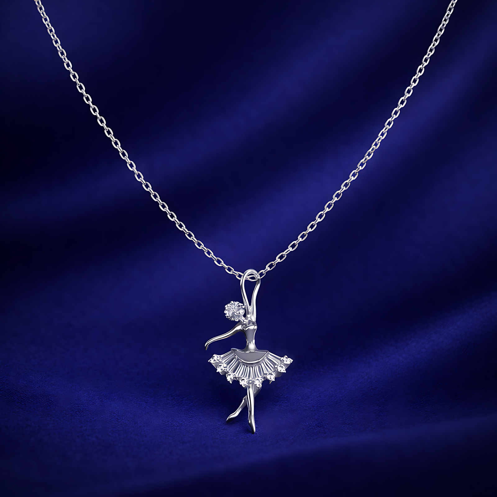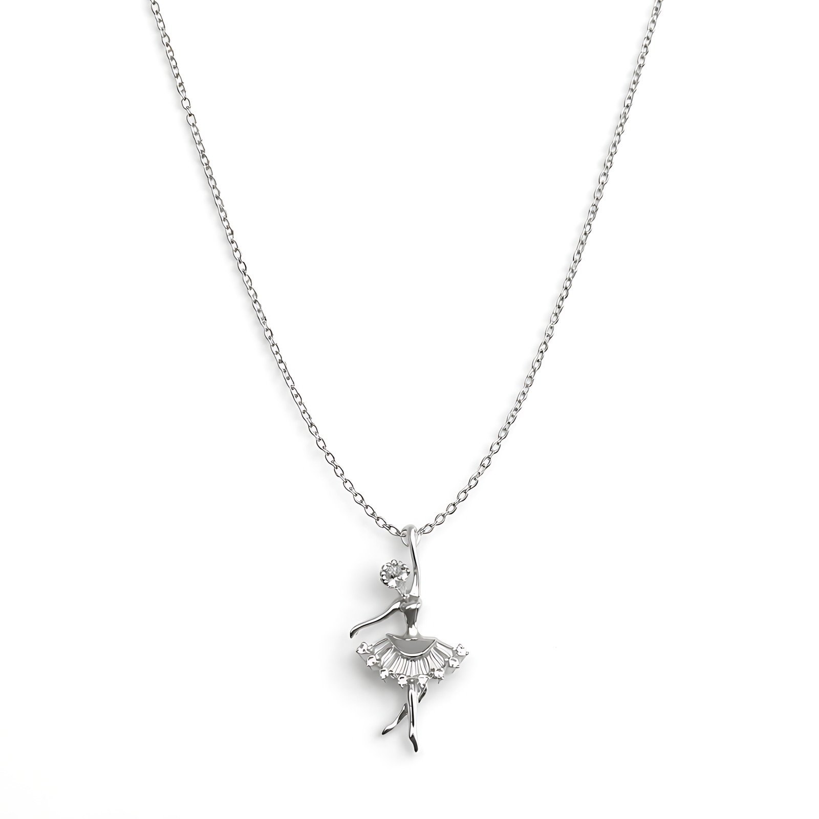 A graceful silver-toned necklace featuring a ballerina pendant in a dance pose, with her tutu shimmering in pavé-set crystals.
