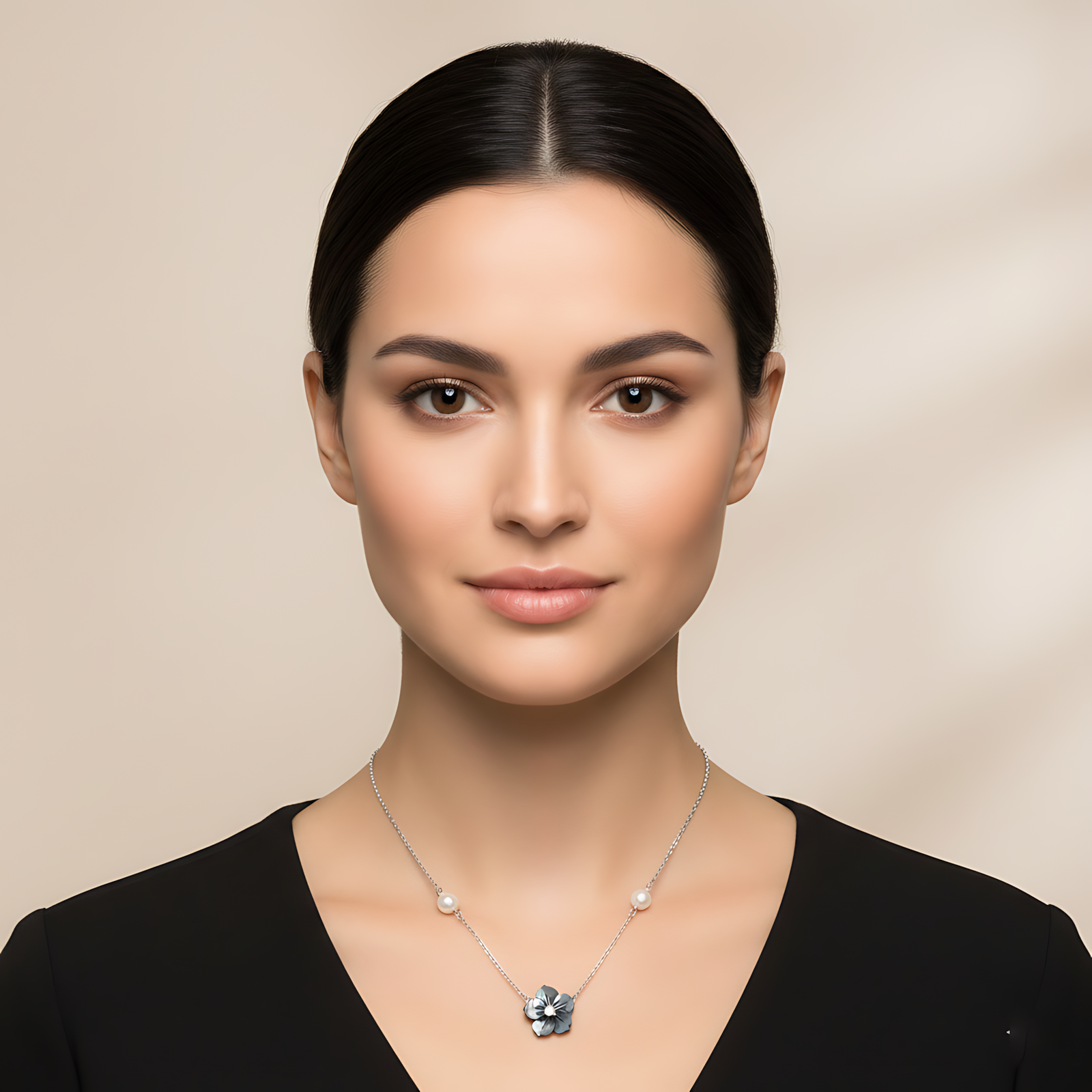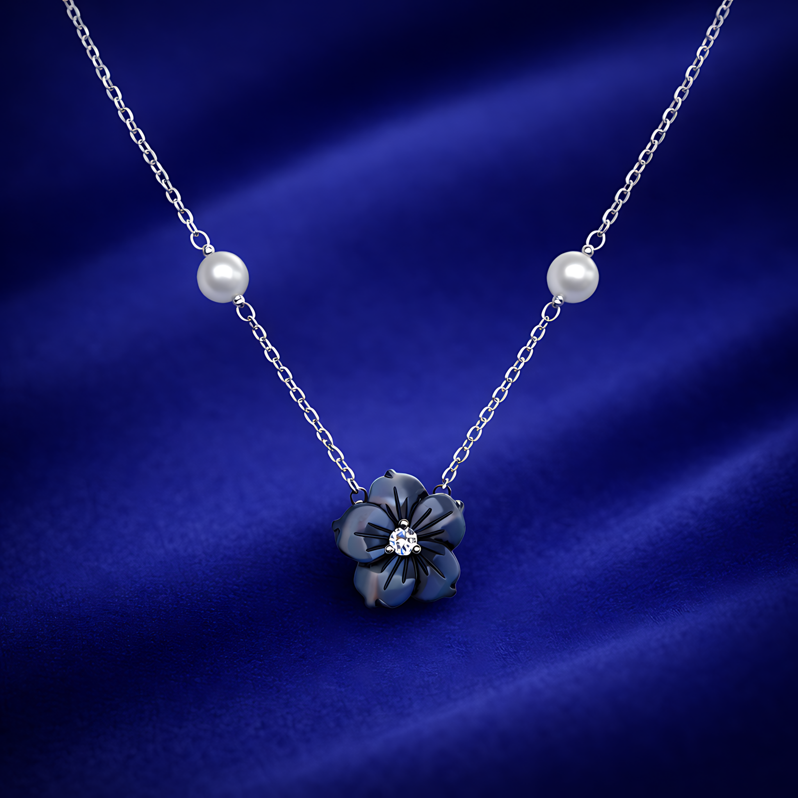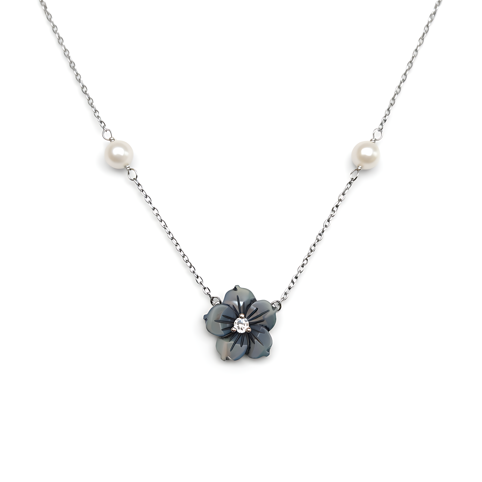 An elegant silver-toned necklace featuring a central carved black mother of pearl flower pendant with a crystal center, flanked by two small white pearls on the chain.