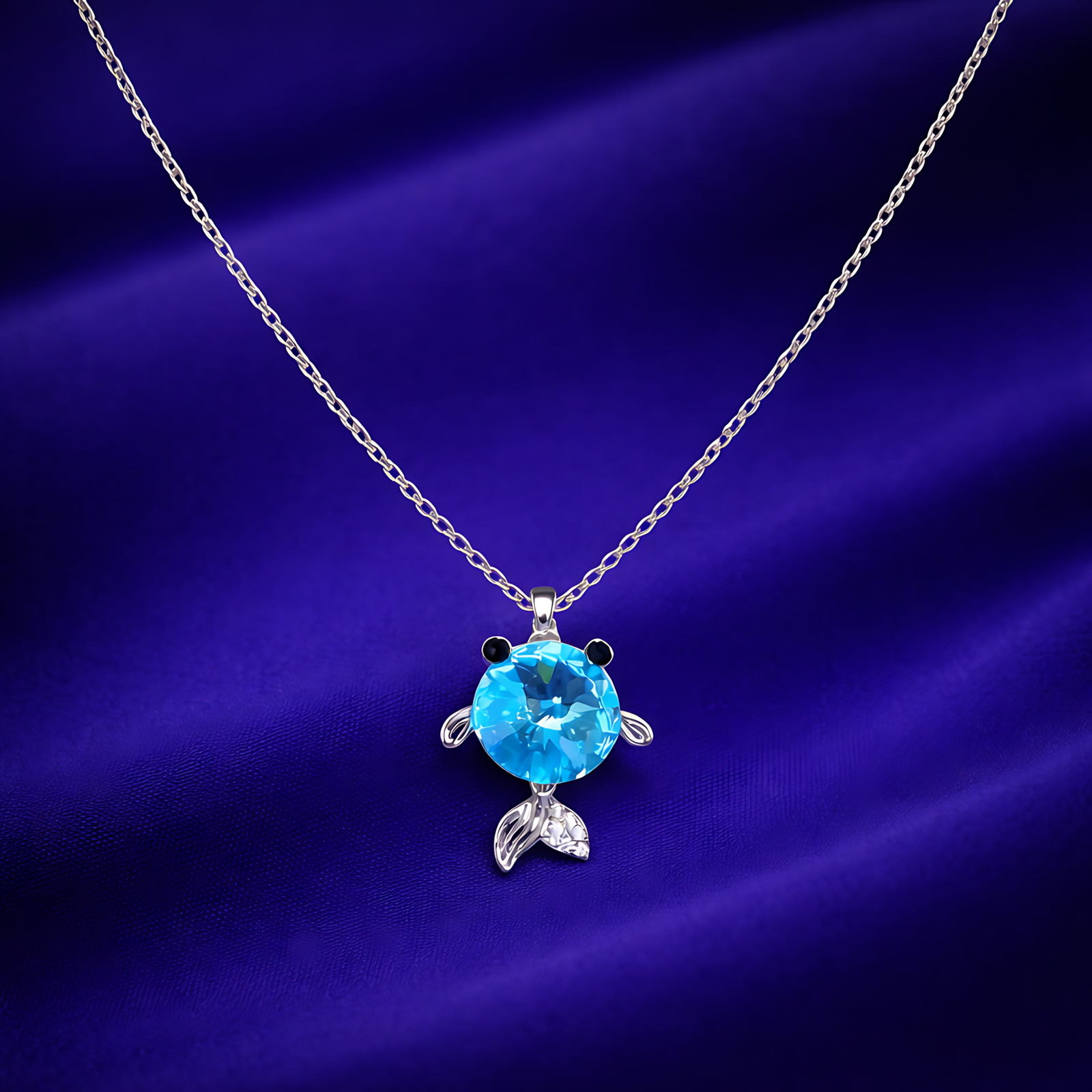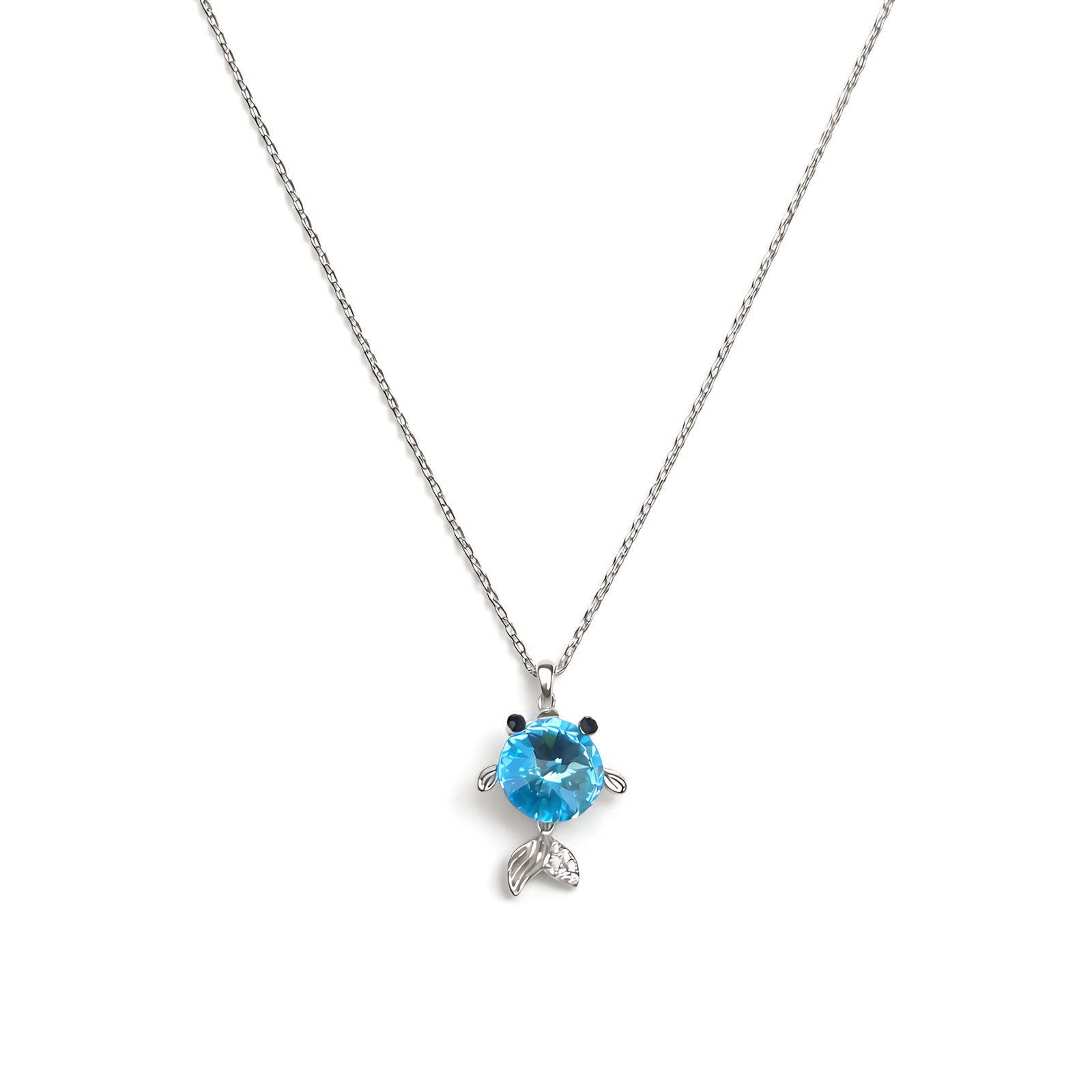 A charming silver-toned necklace featuring a fish-shaped pendant with a large, brilliant blue round-cut stone body and polished silver accents.
