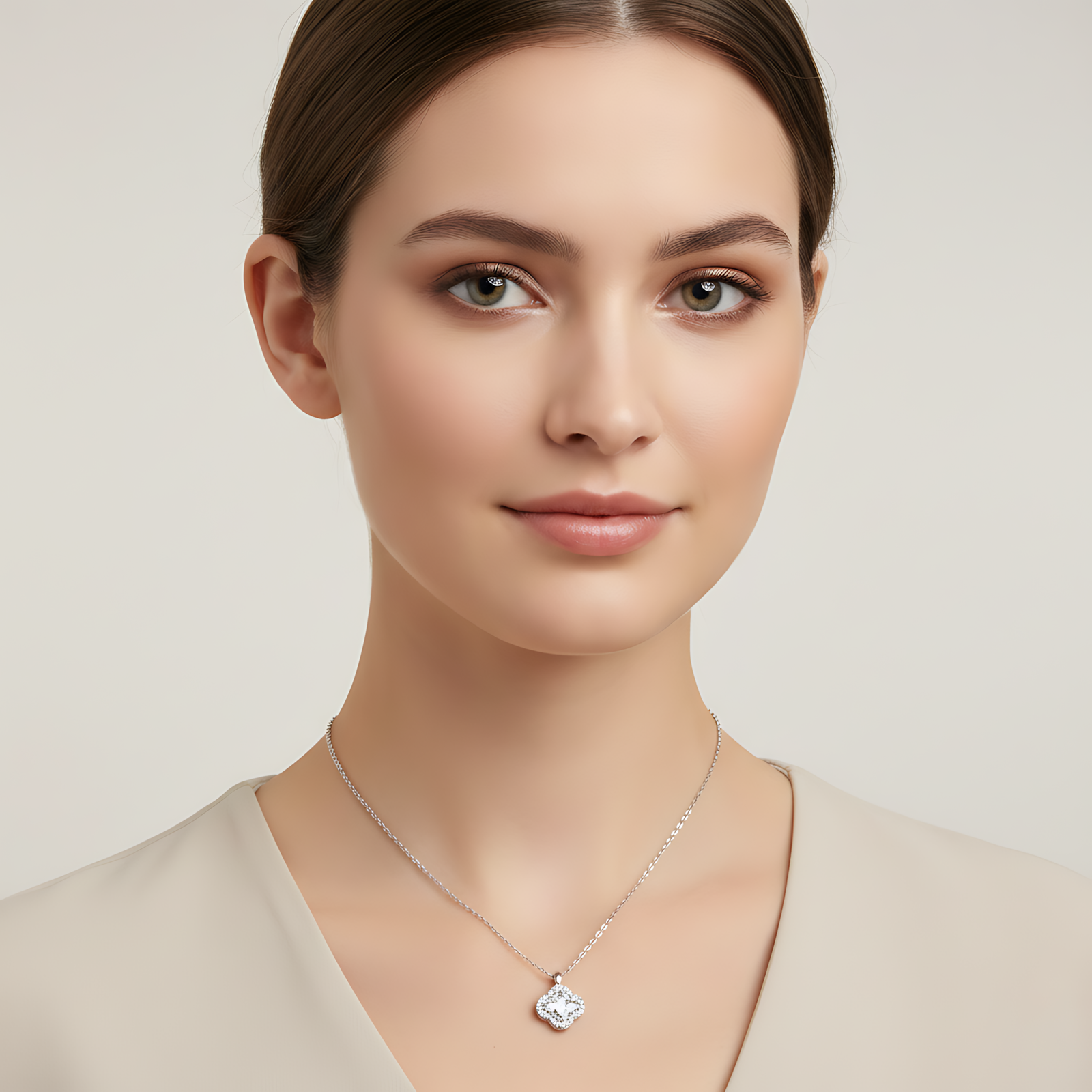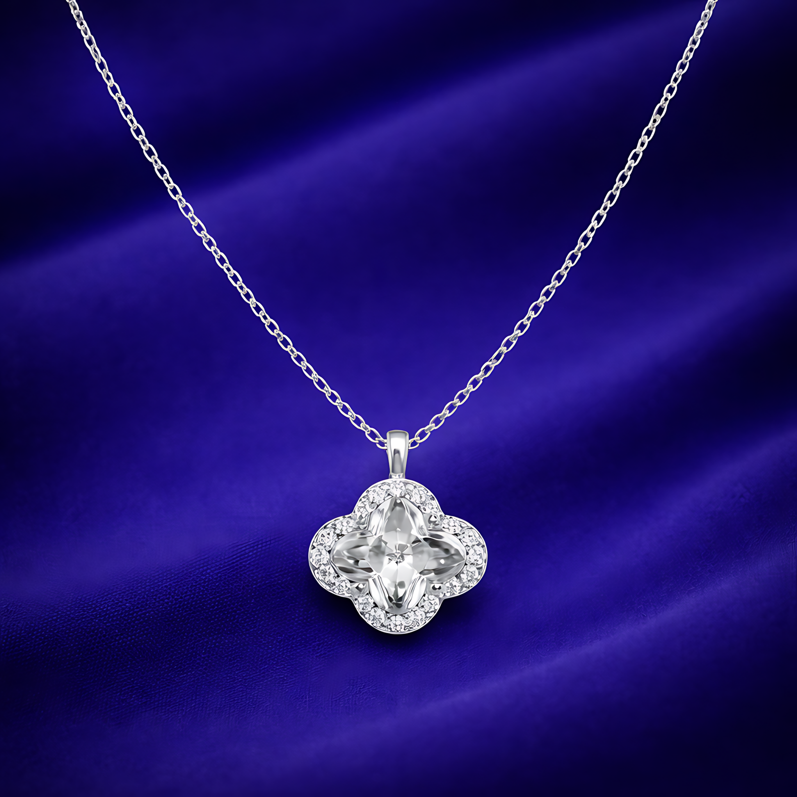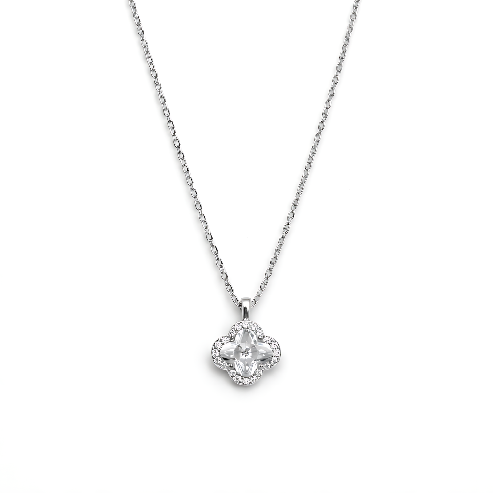 A delicate silver-toned necklace featuring a four-leaf clover pendant with a brilliant central stone and a shimmering pavé halo.