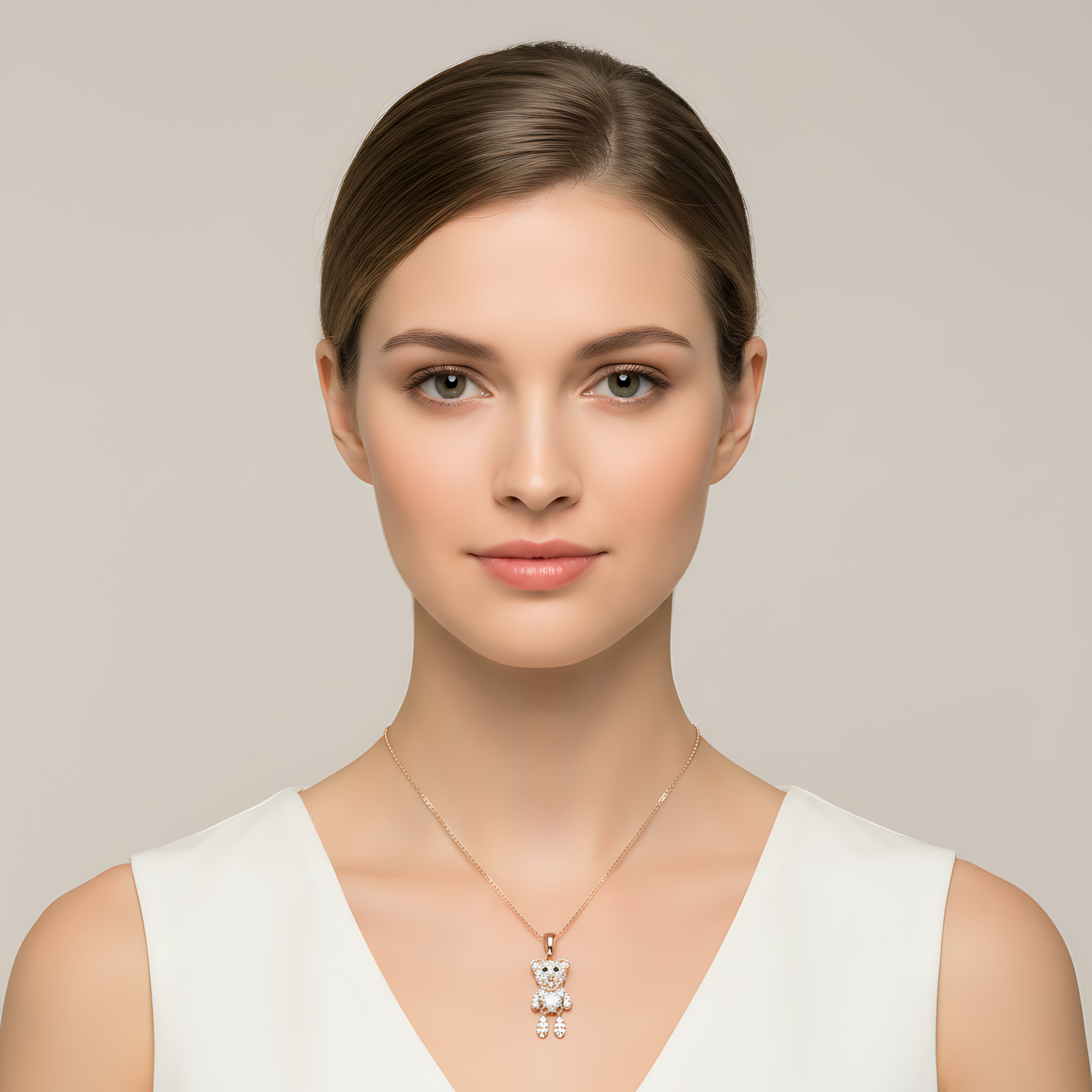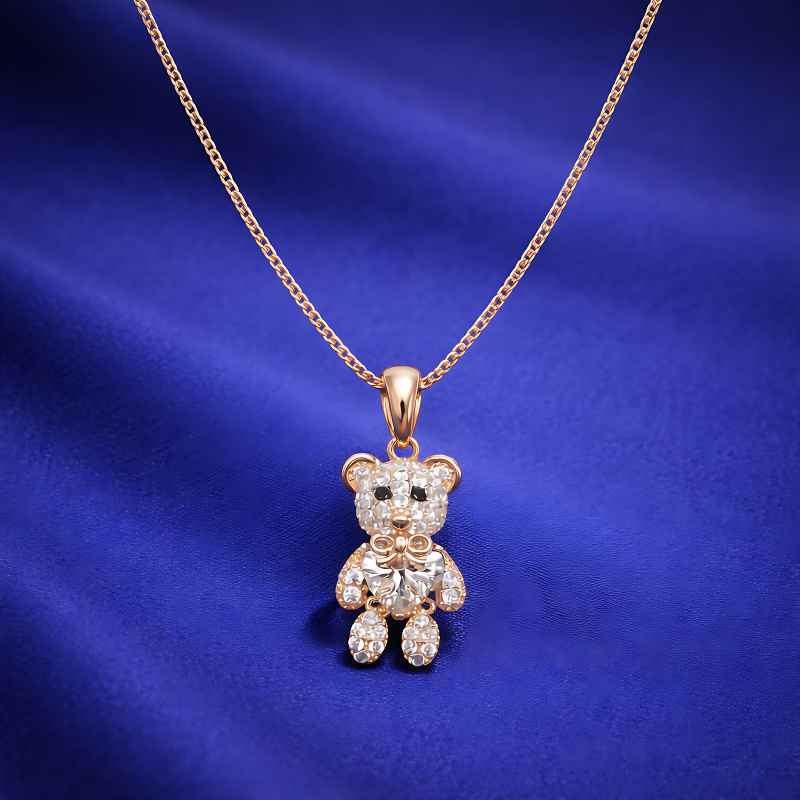 A whimsical rose gold-toned necklace featuring a fully articulated teddy bear pendant encrusted with pavé crystals and a central heart-shaped stone.