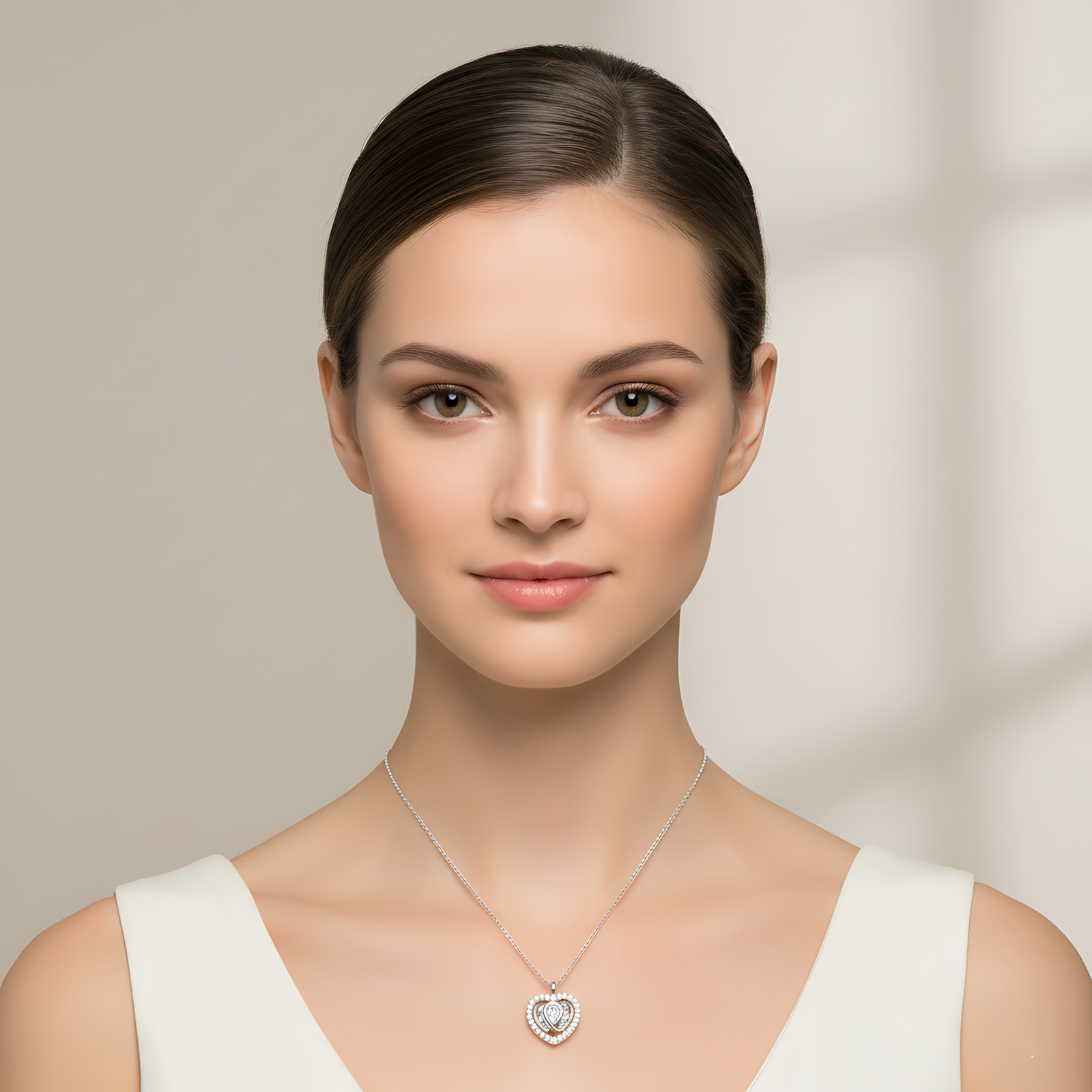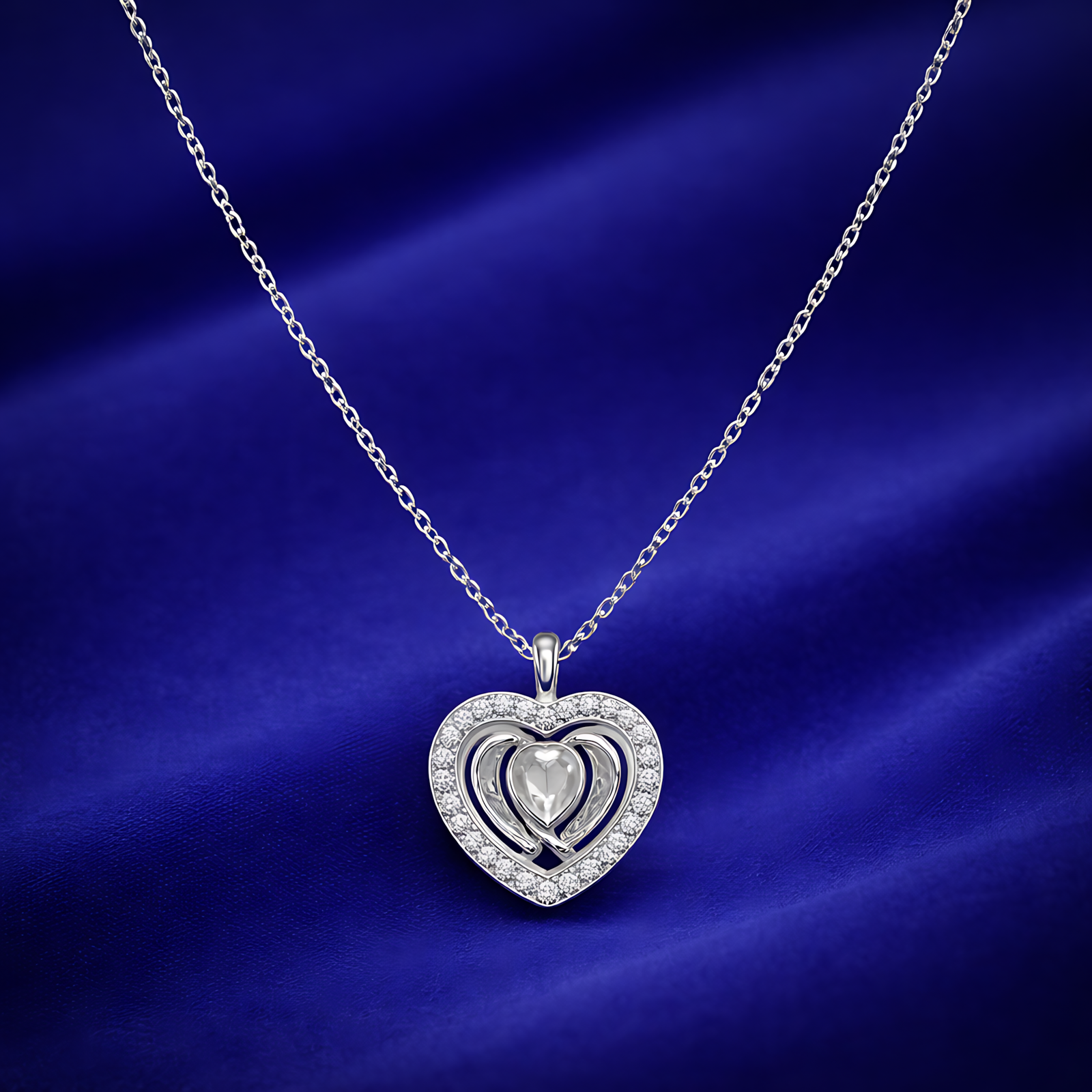 A romantic silver-toned necklace featuring a heart-shaped pendant with a sparkling pavé border and a “dancing” pear-cut crystal suspended in the center.