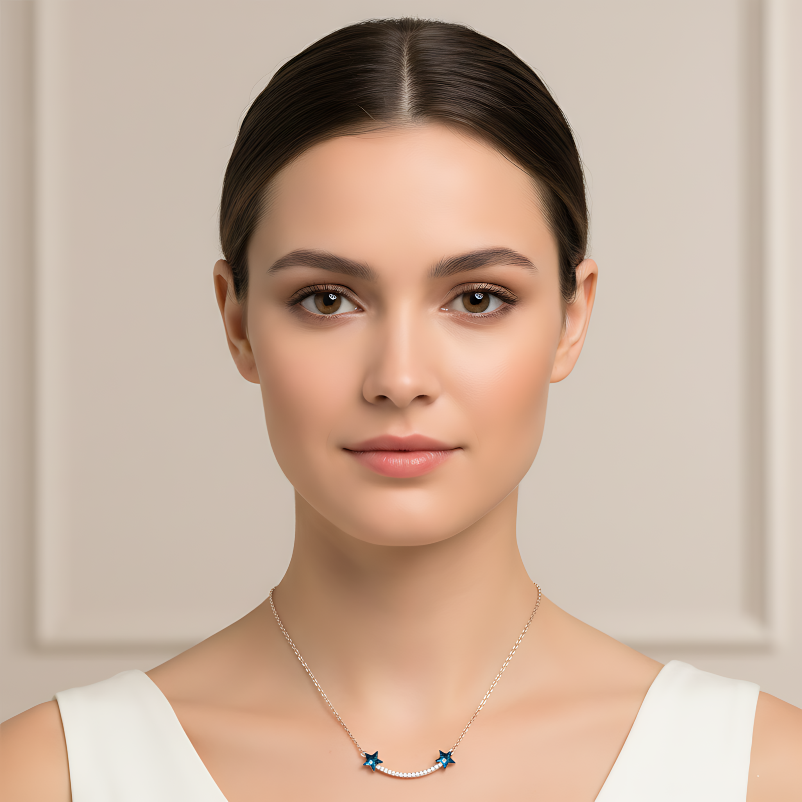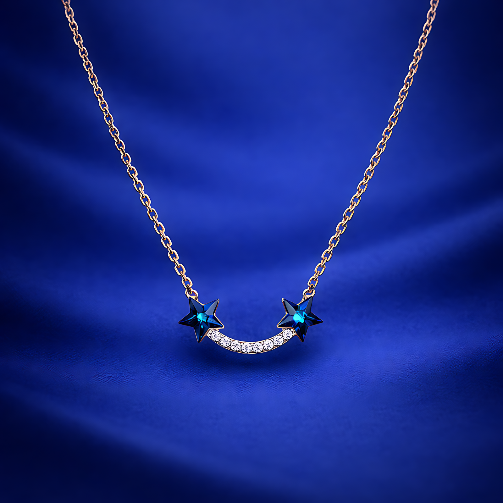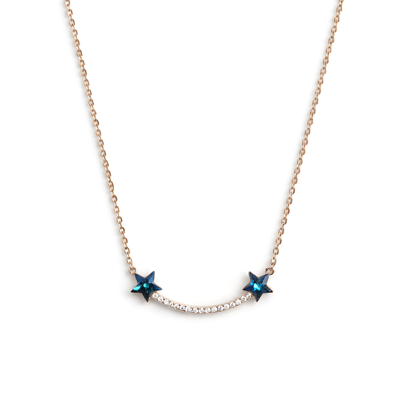 A celestial-inspired rose gold-toned necklace featuring a curved bar of pavé crystals bookended by two deep blue star-shaped pendants.