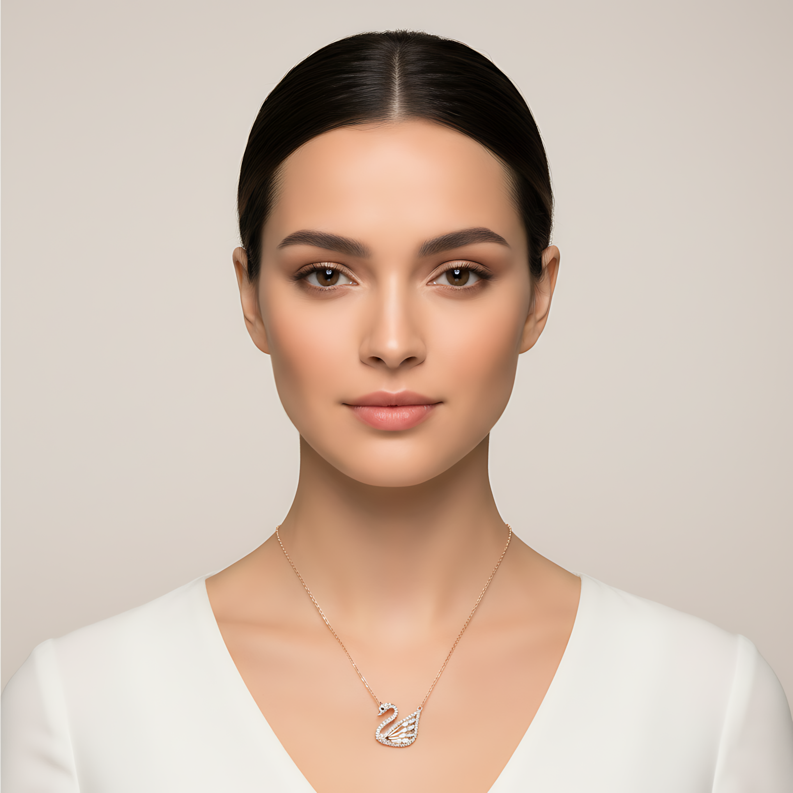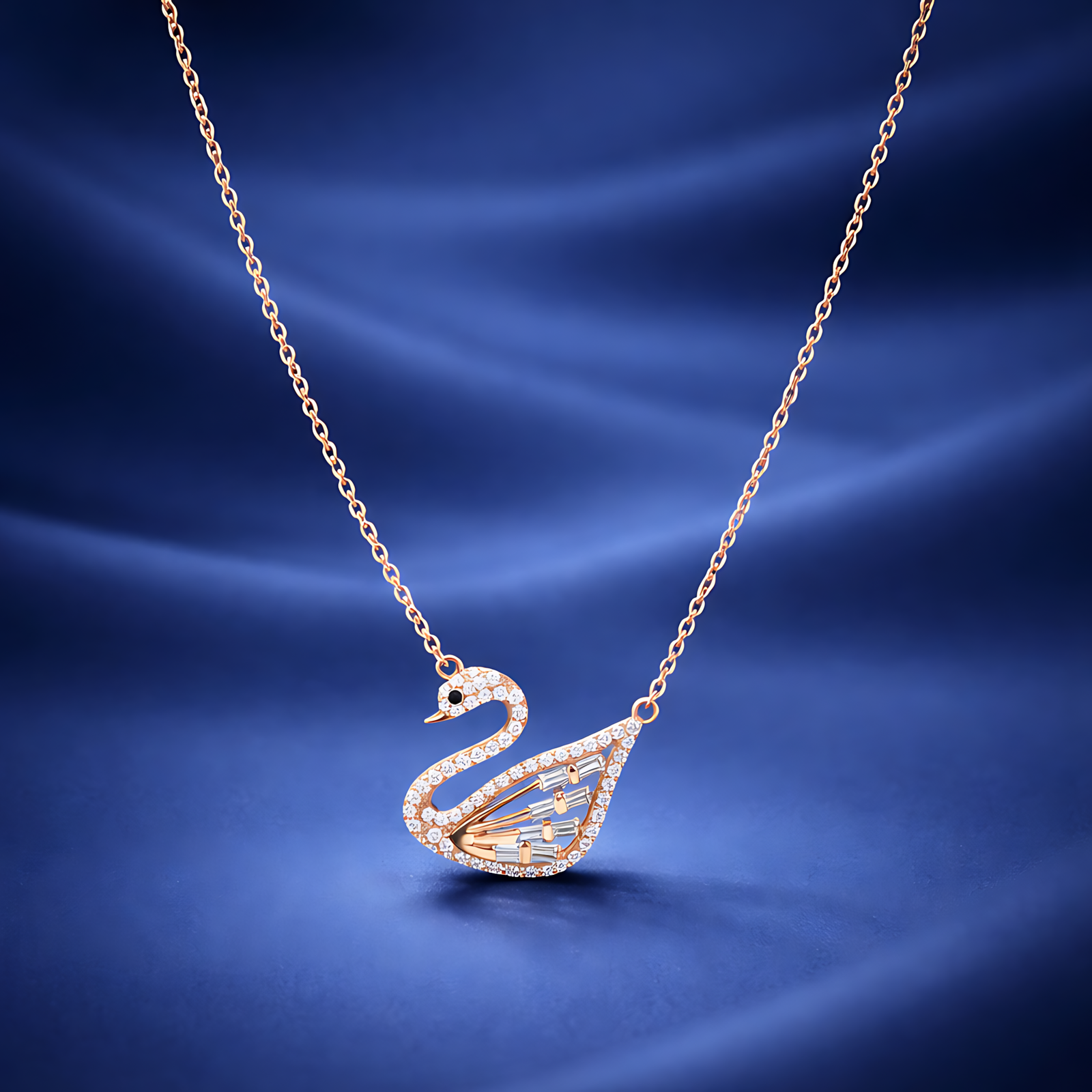 A sophisticated rose gold-toned necklace featuring a detailed swan pendant encrusted with pavé crystals.