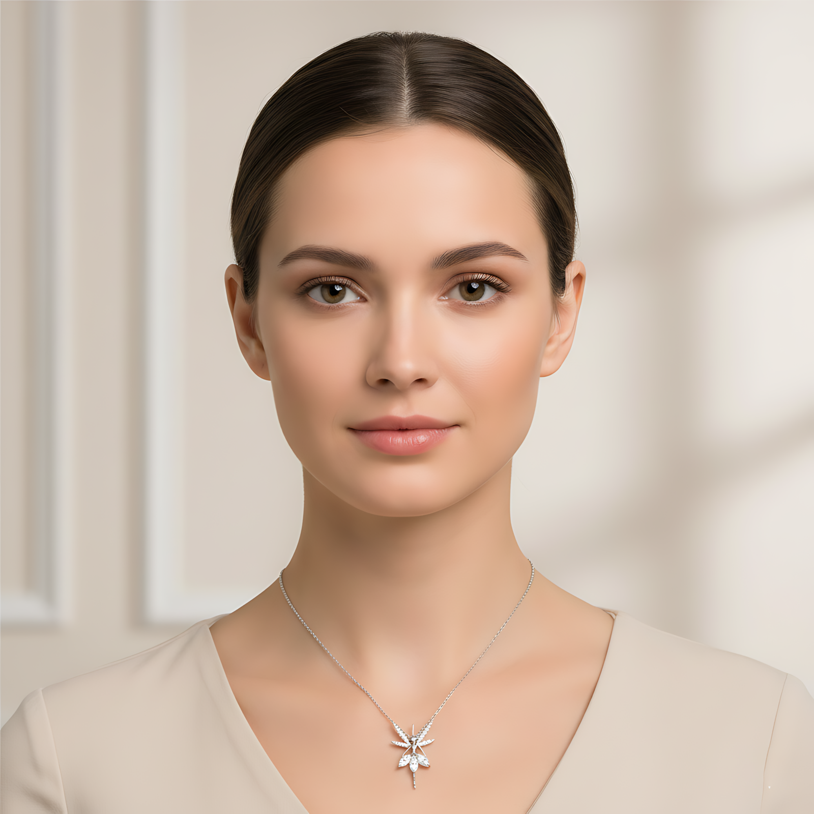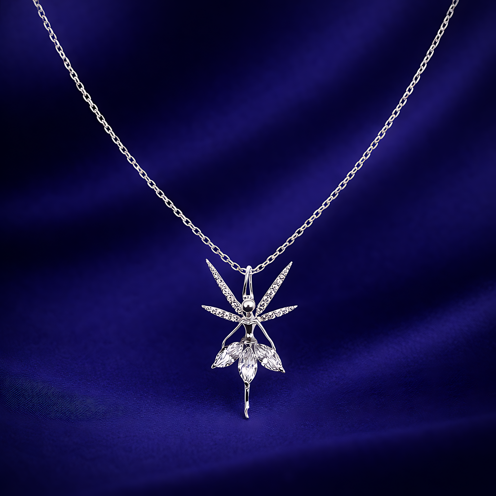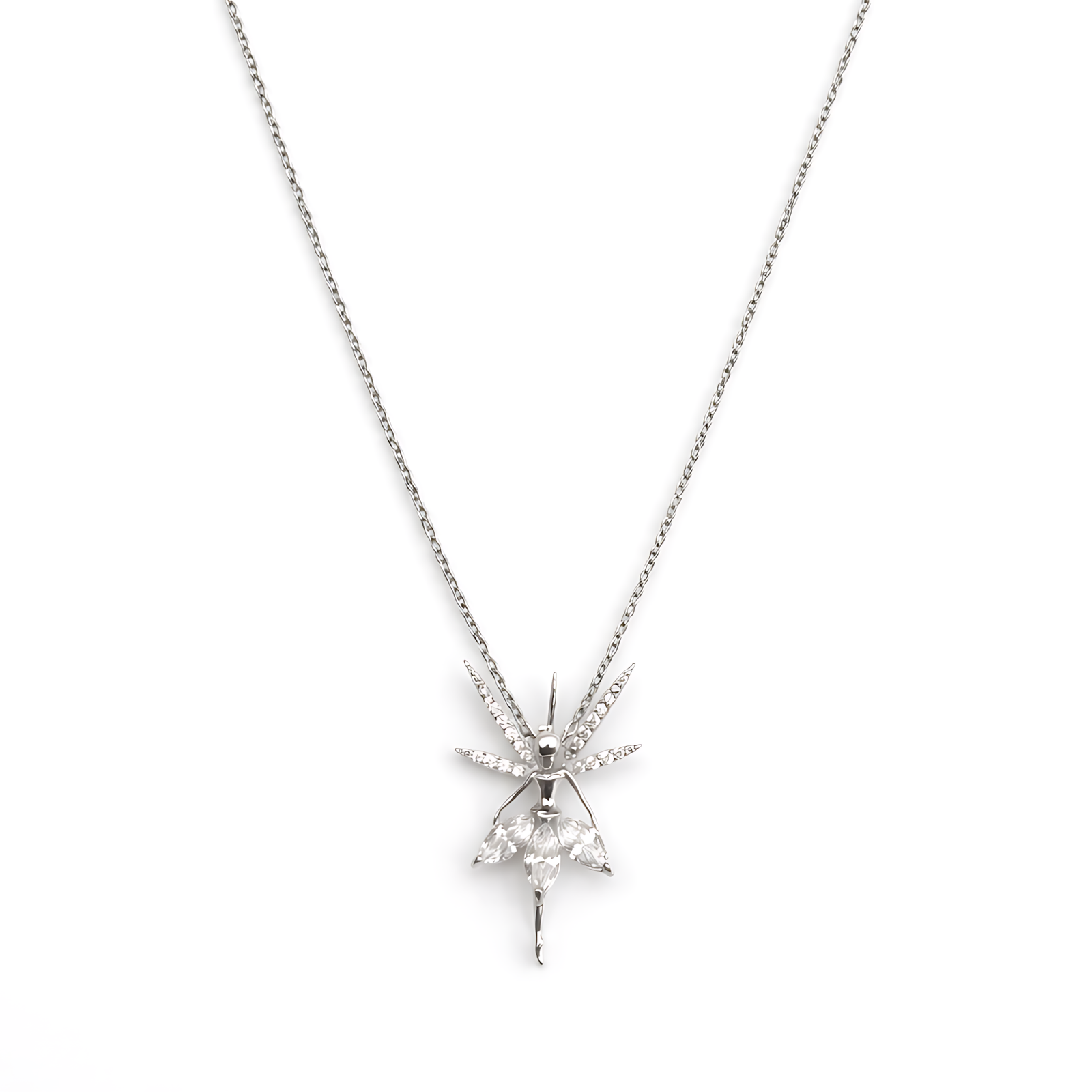 A whimsical silver-toned necklace featuring a delicate fairy pendant with shimmering wings and a crystal-accented dress.