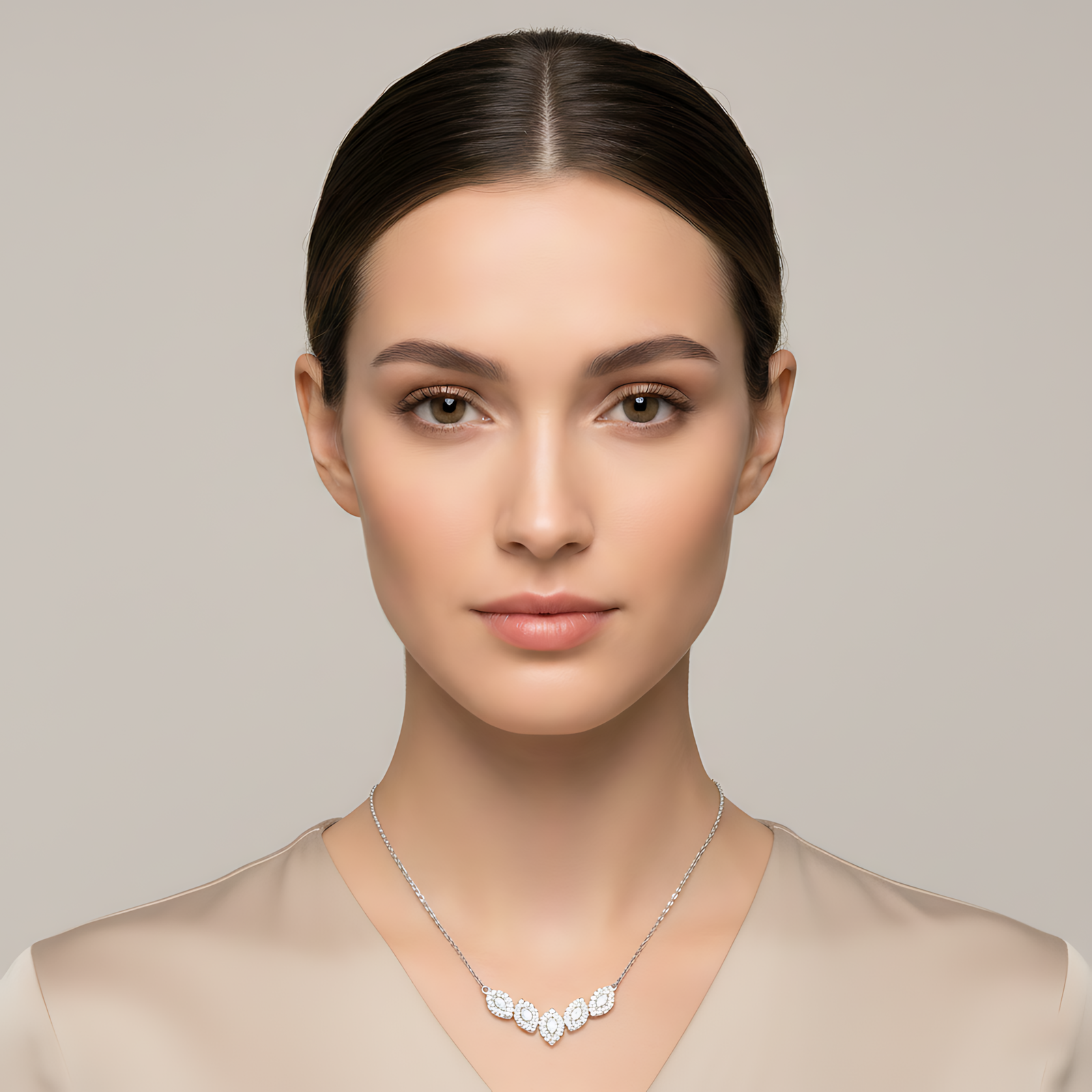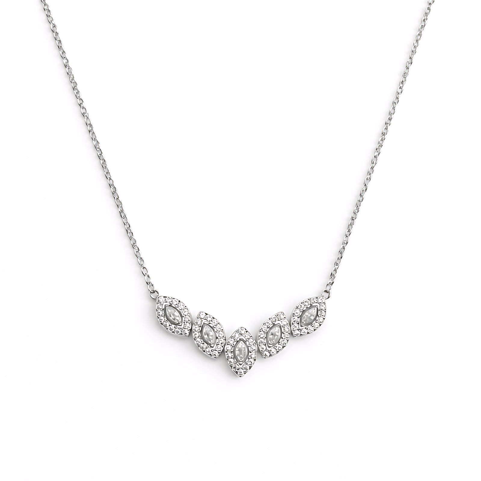 A striking silver-toned necklace featuring a V-shaped arrangement of five marquise-cut crystal clusters.