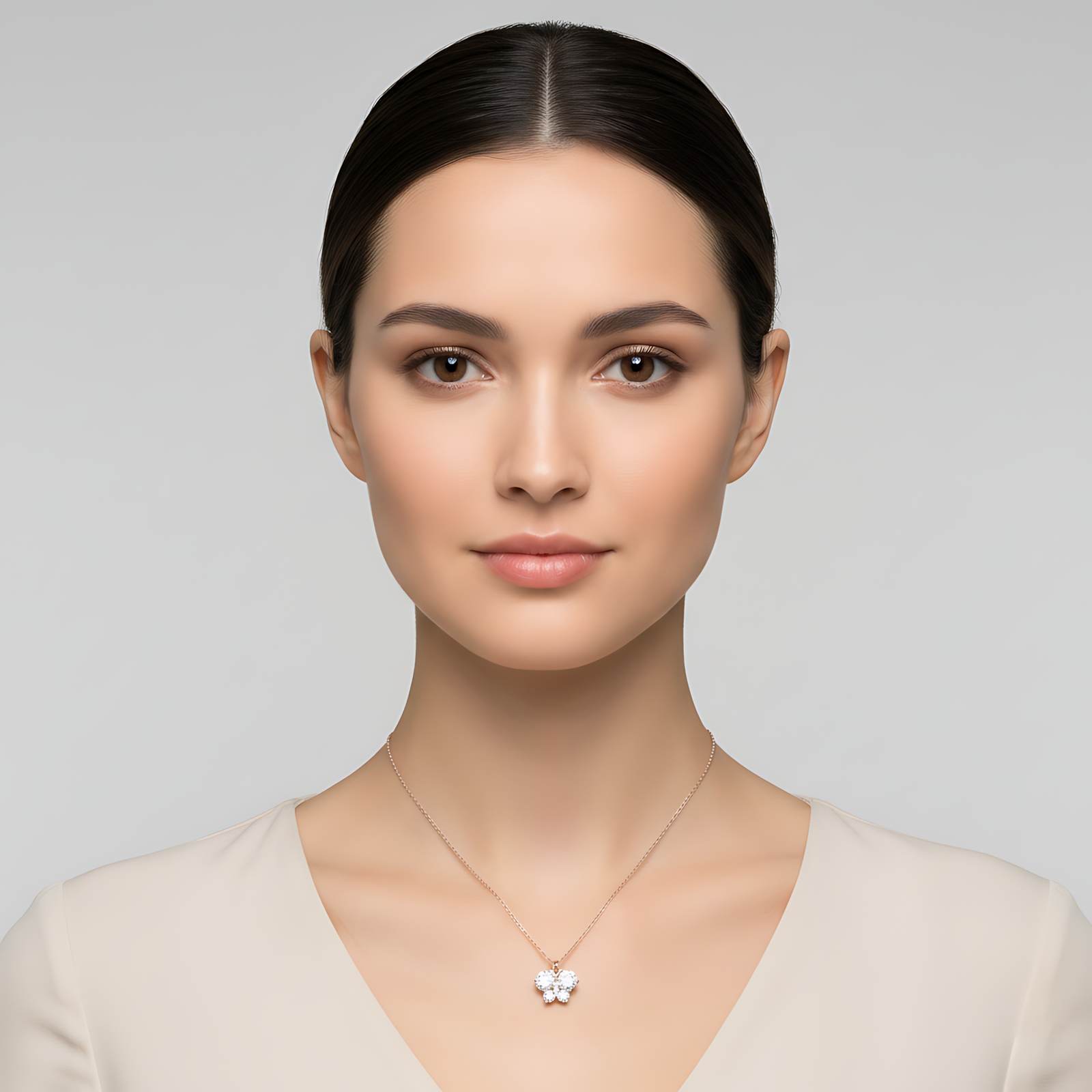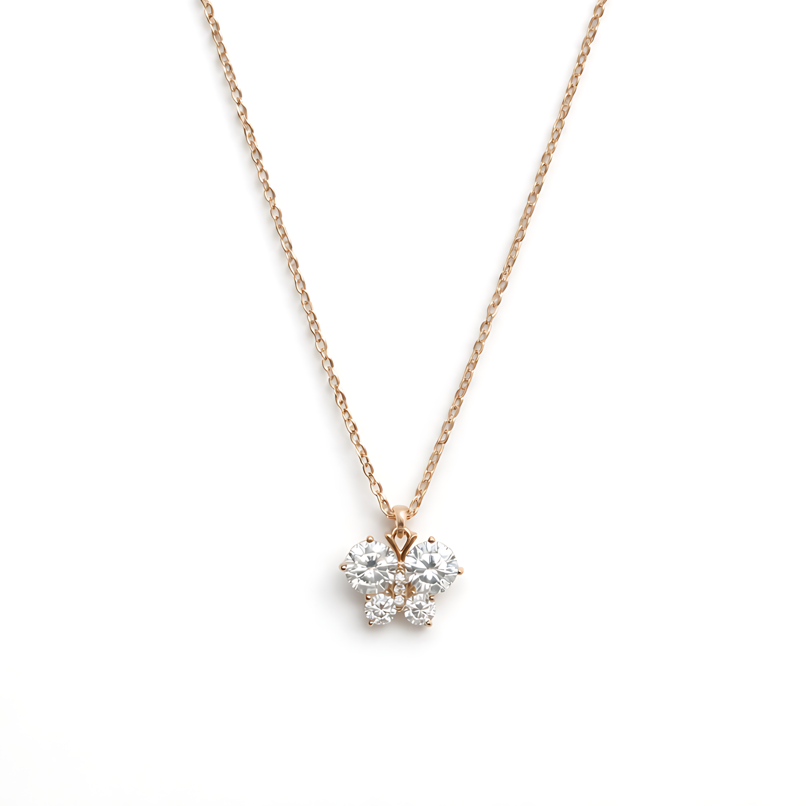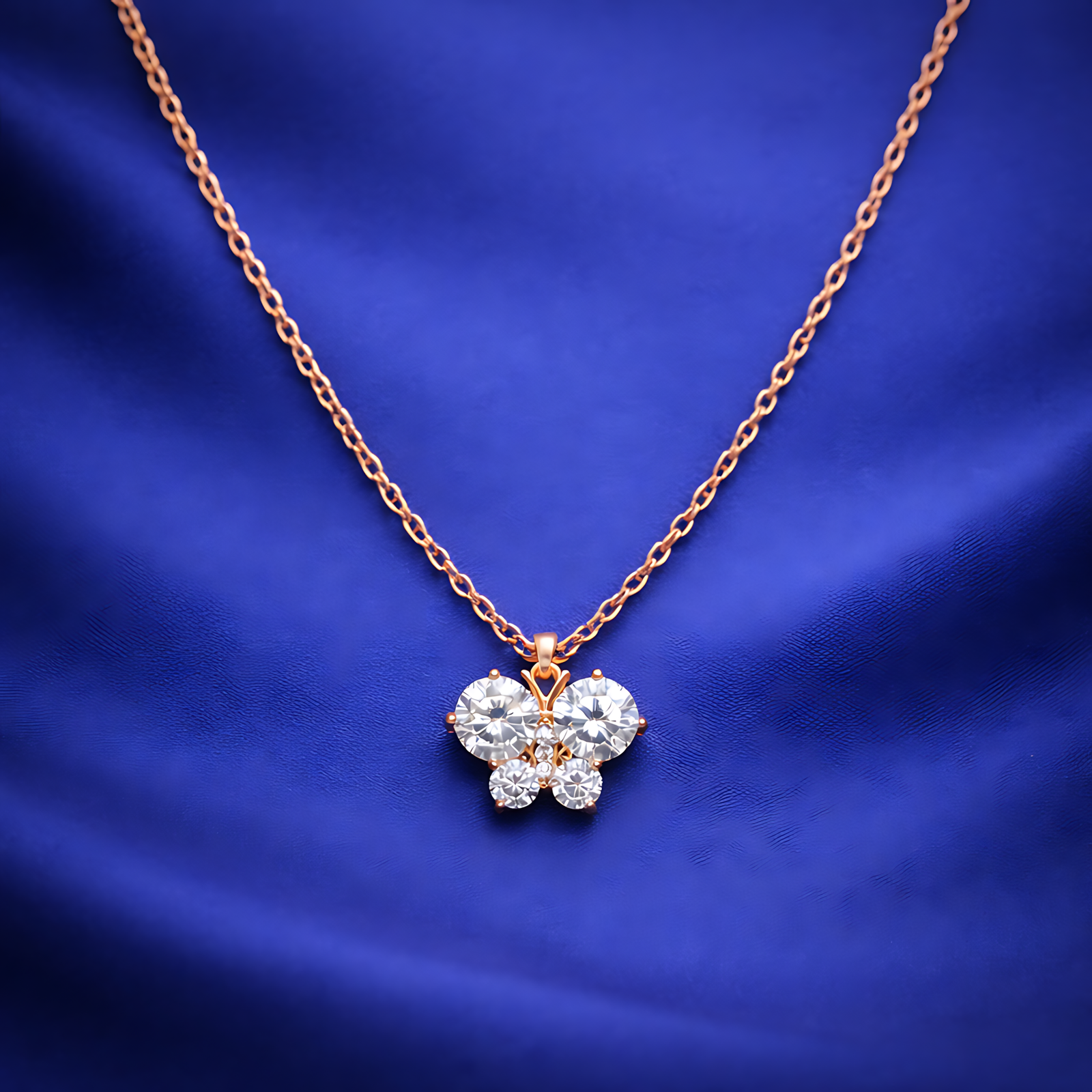 A dainty rose gold-toned necklace featuring a butterfly pendant crafted from four shimmering marquise-cut crystals.