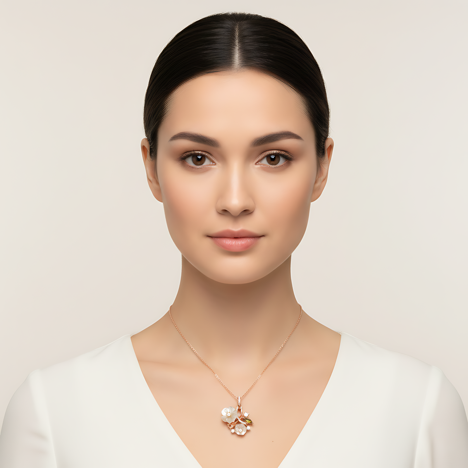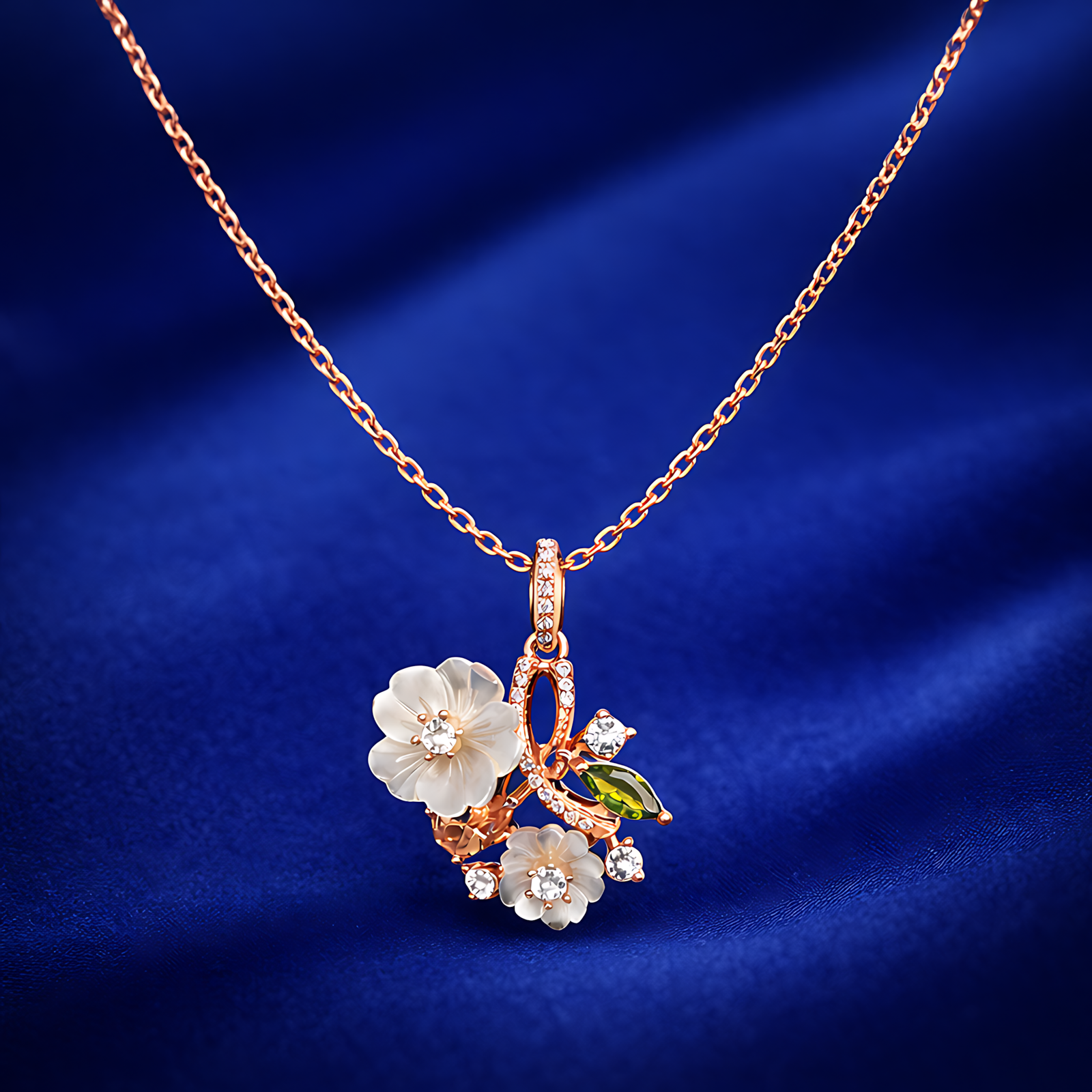 An exquisite rose gold-toned necklace featuring a cluster of mother of pearl flowers accented with a single green marquise stone and shimmering crystals.