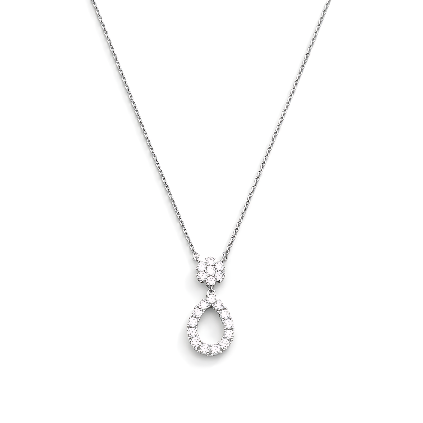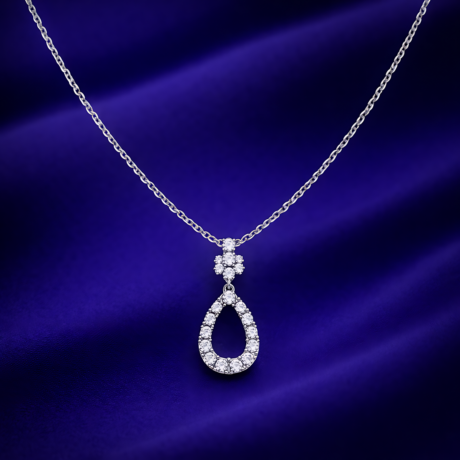 A graceful silver-toned necklace featuring an open teardrop pendant fully set with shimmering crystals, suspended from a small circular crystal cluster.