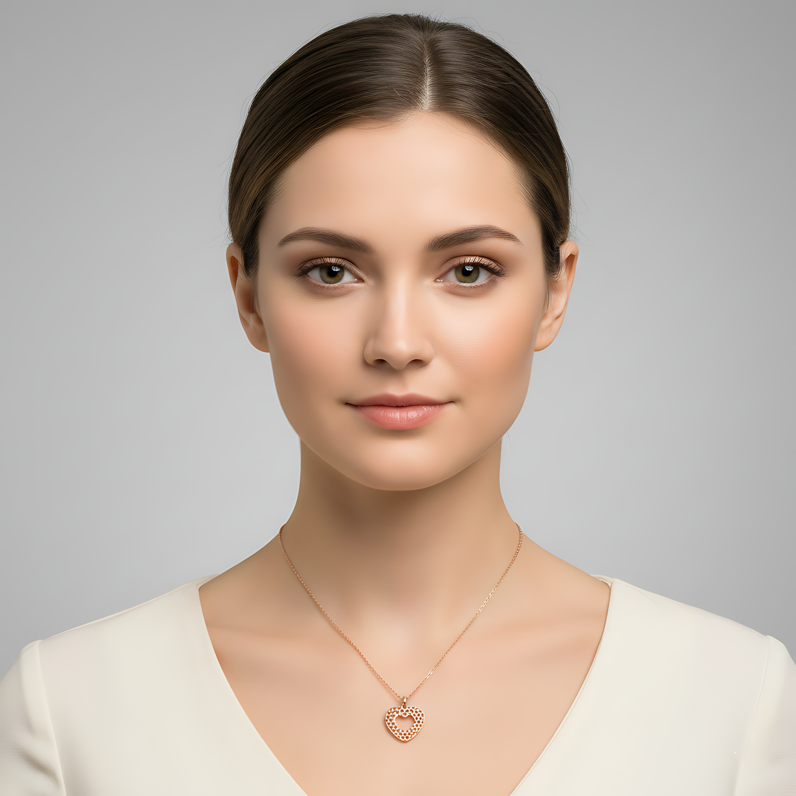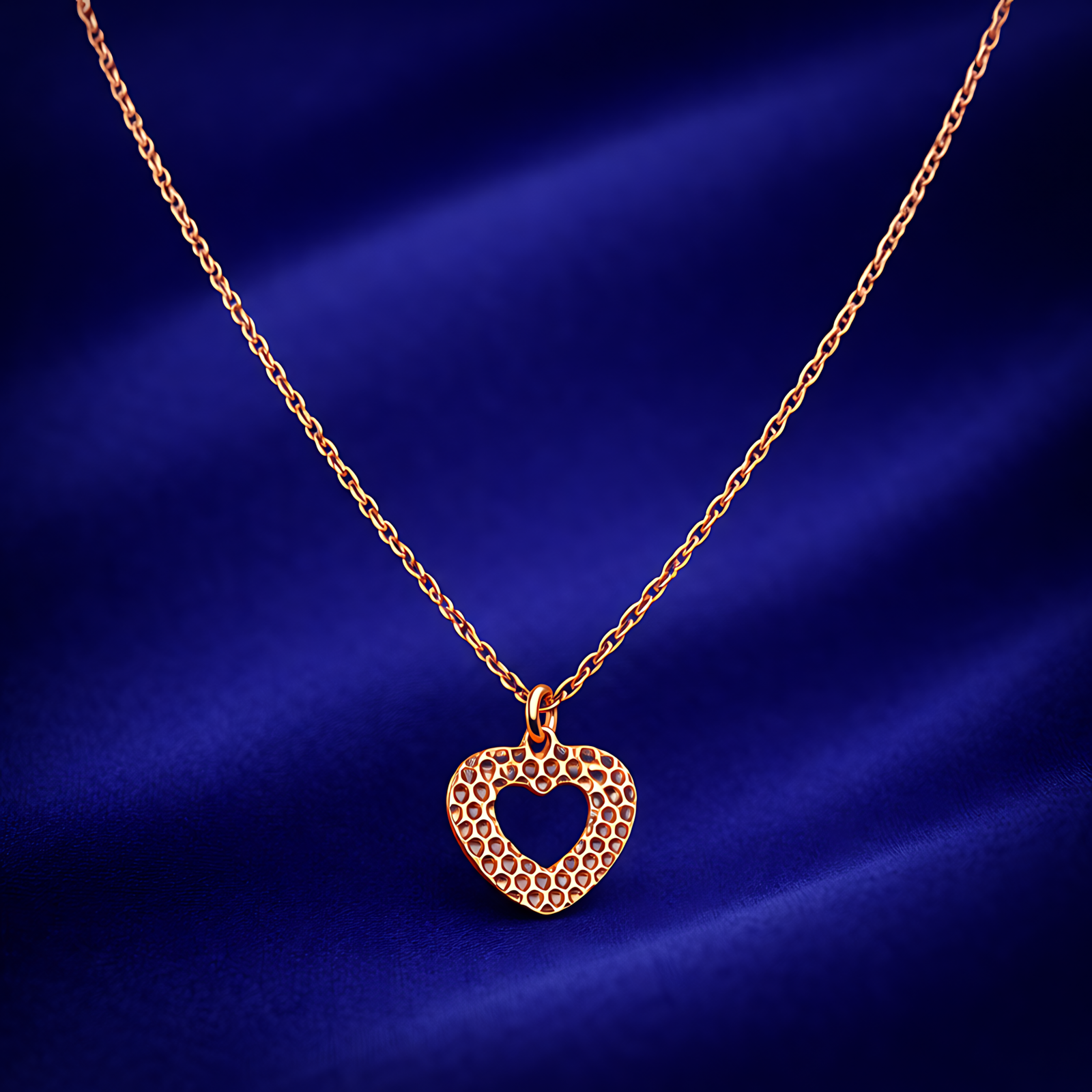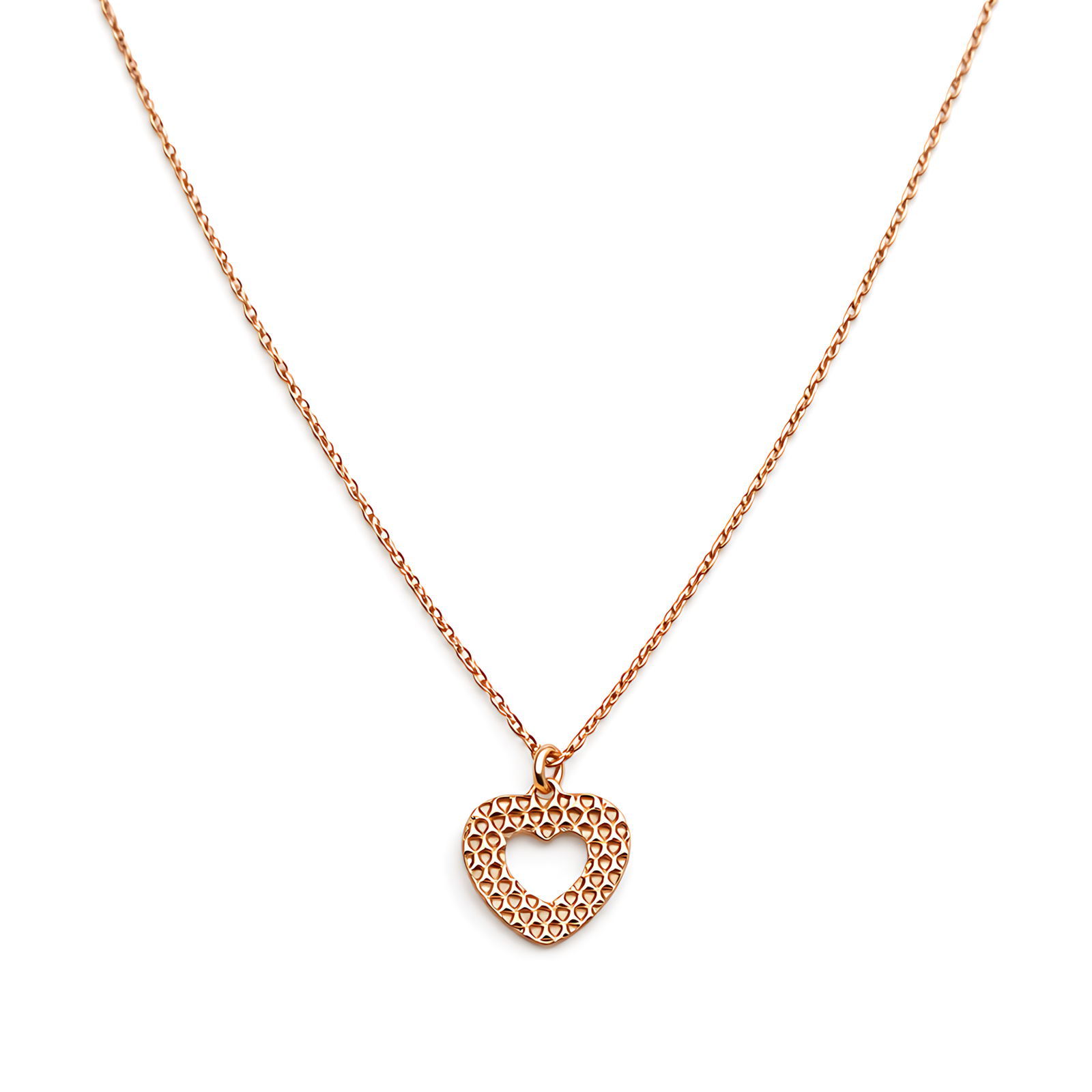 A romantic rose gold-toned necklace featuring a central open-heart pendant with a delicate mesh texture and a shimmering pavé crystal border.