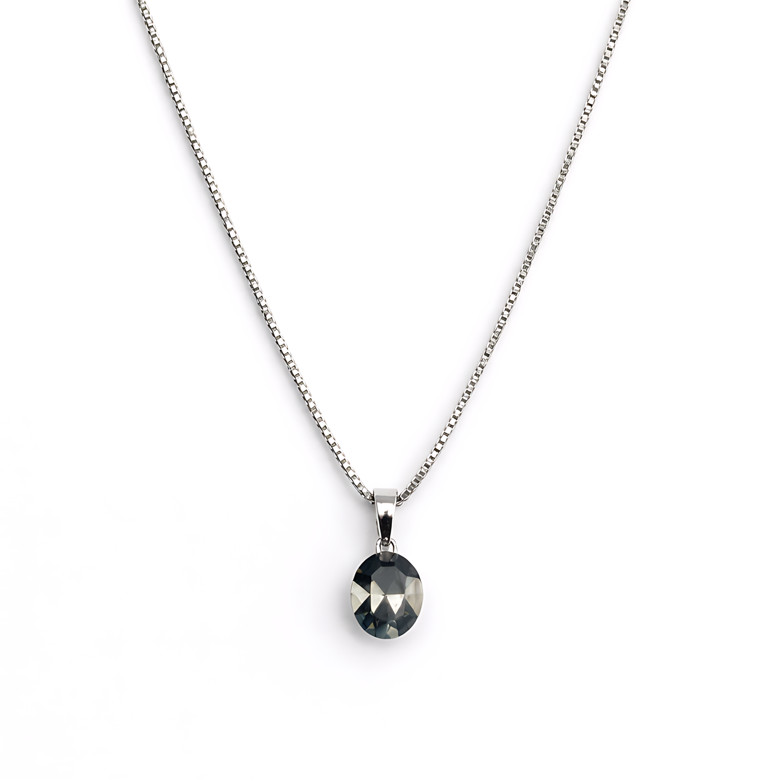 A minimalist silver-toned necklace featuring a single, faceted oval-cut pendant in a deep smokey or charcoal grey hue.