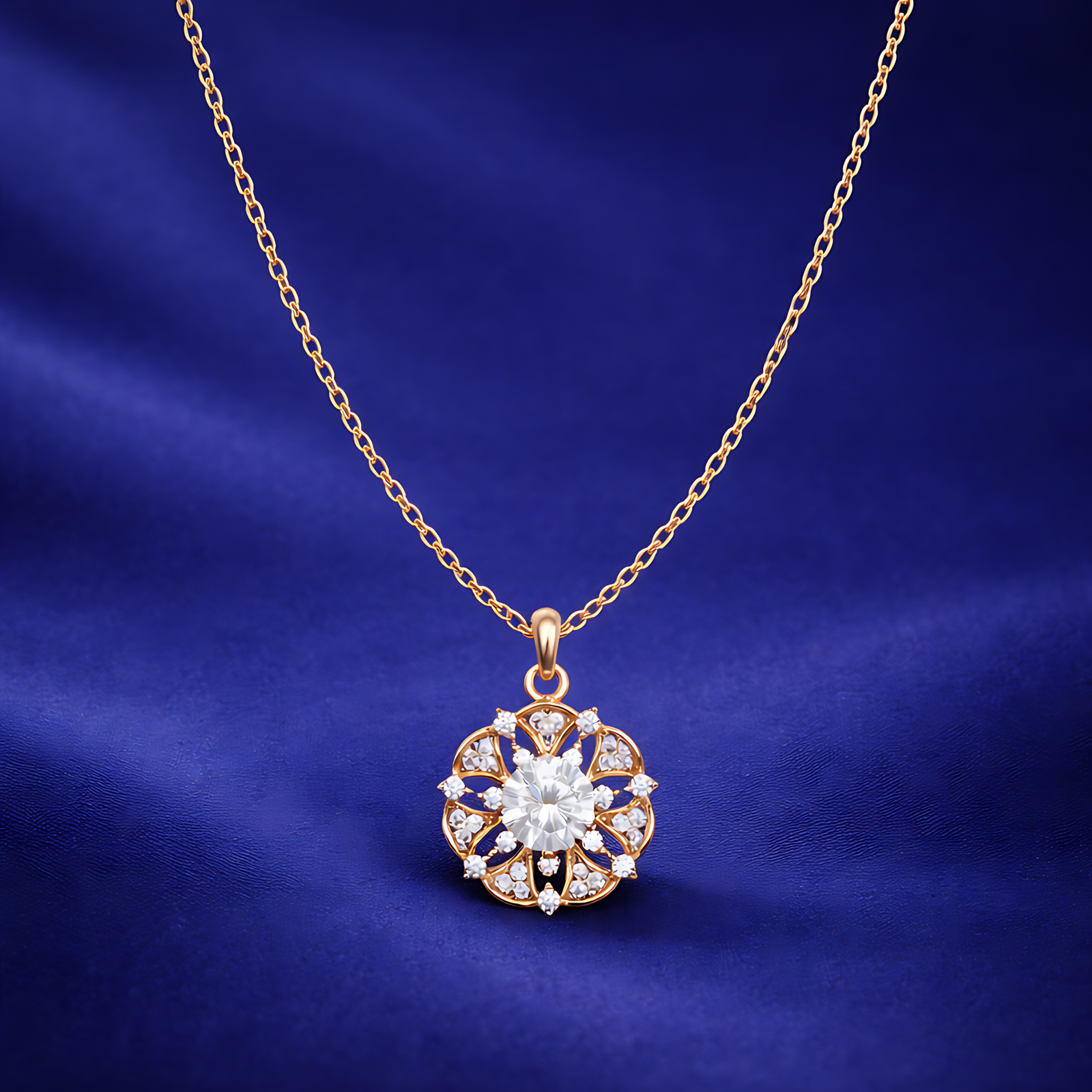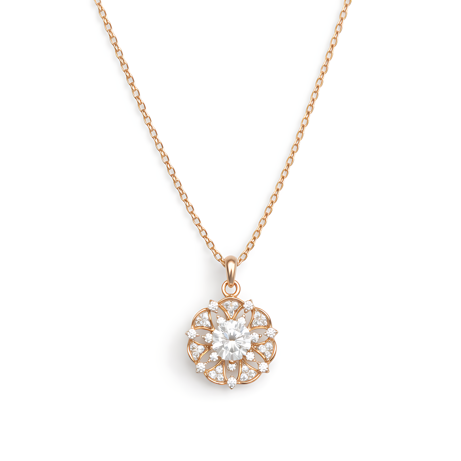 An ornate rose gold-toned necklace featuring a circular medallion pendant with intricate openwork and a central brilliant stone.