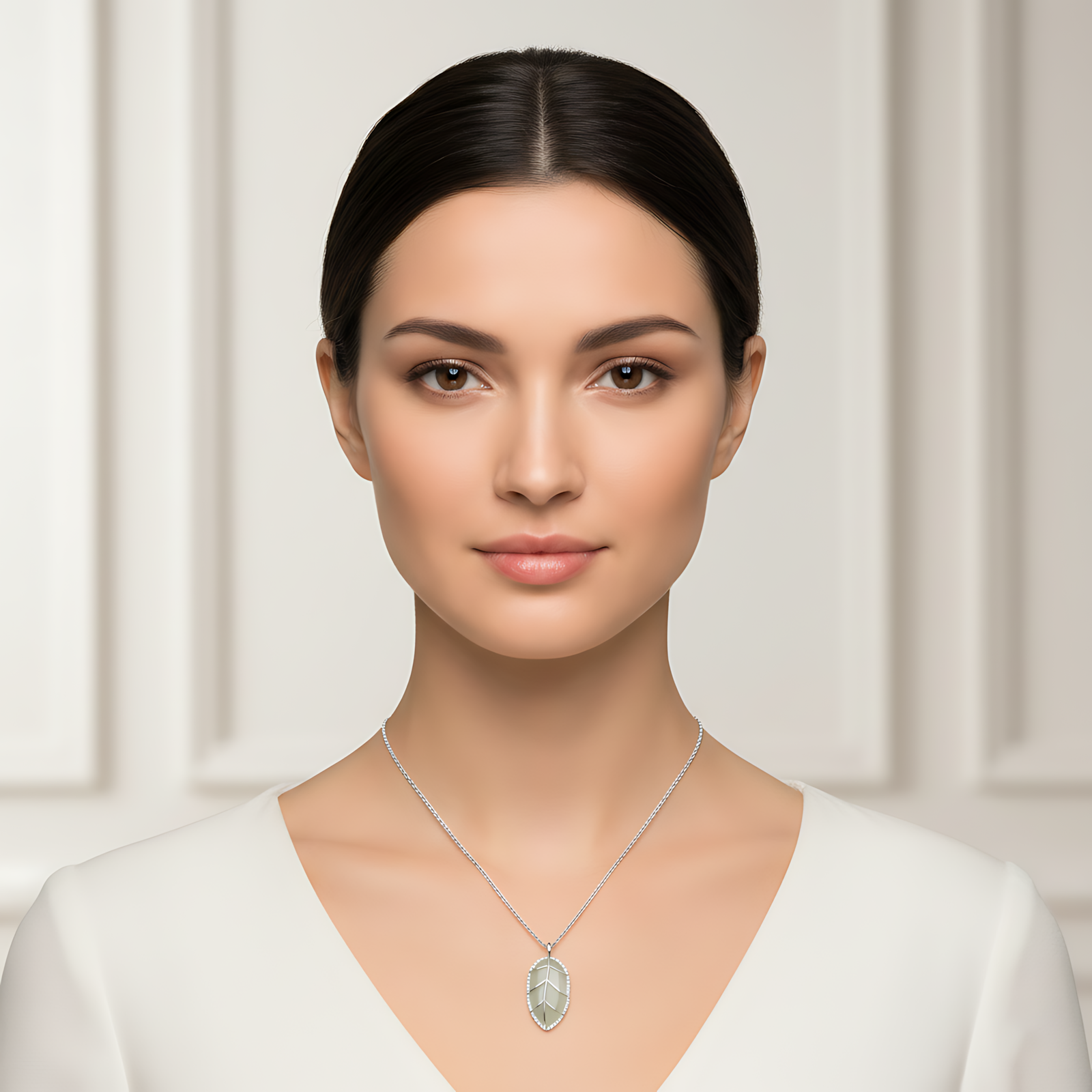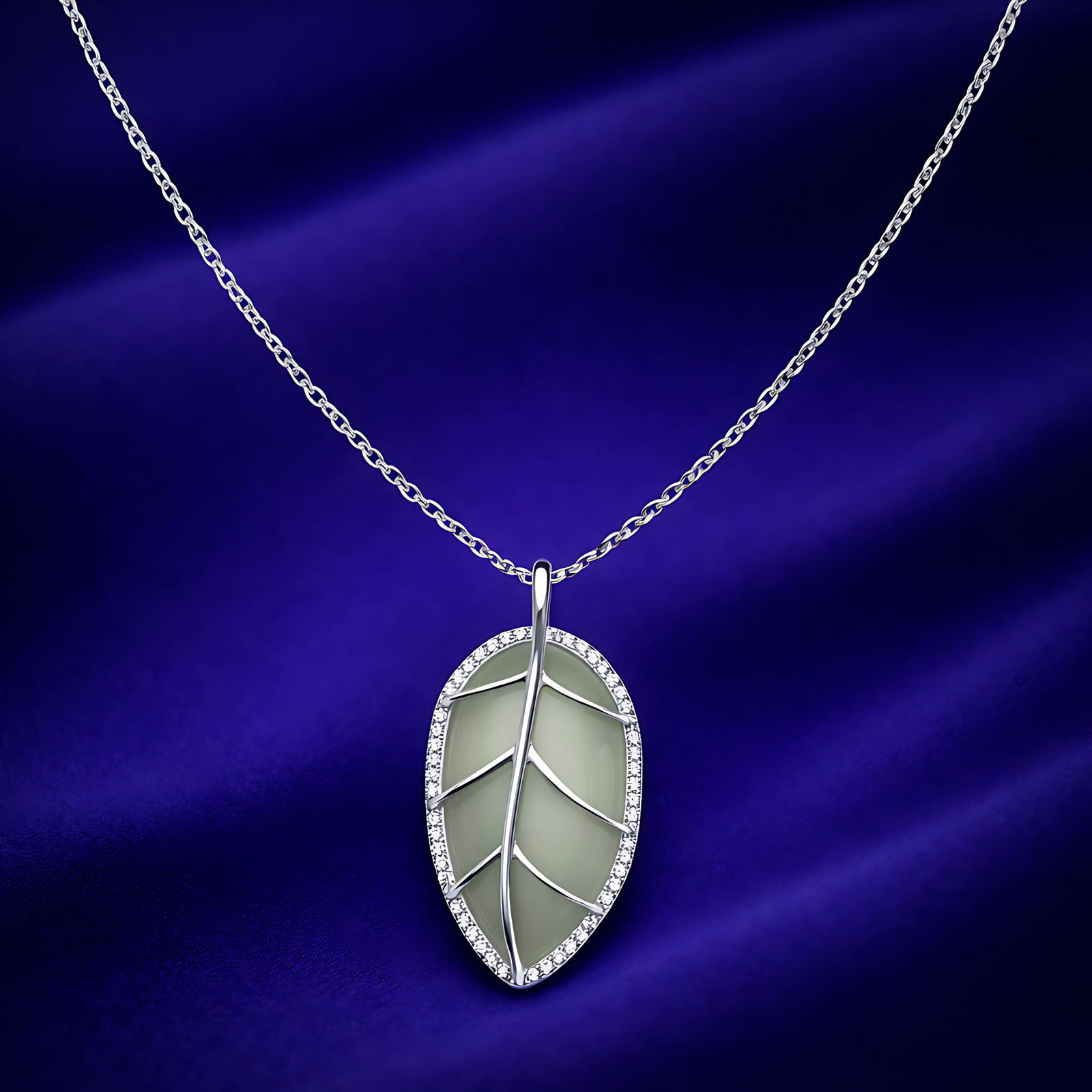 A refined silver-toned necklace featuring a leaf-shaped pendant with a translucent sage-green inlay and a shimmering pavé crystal border.