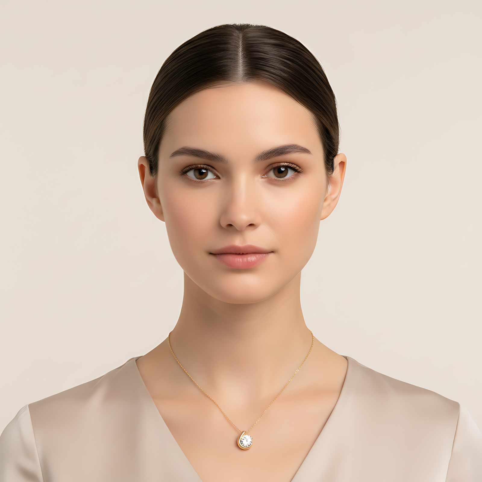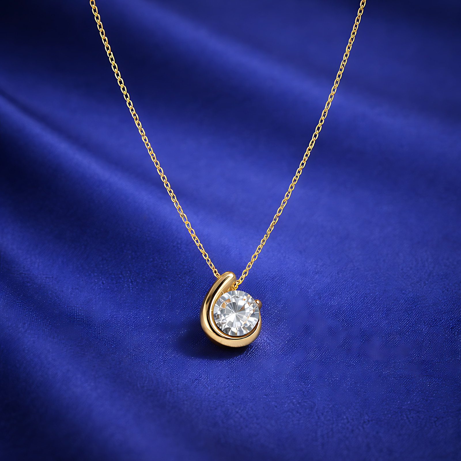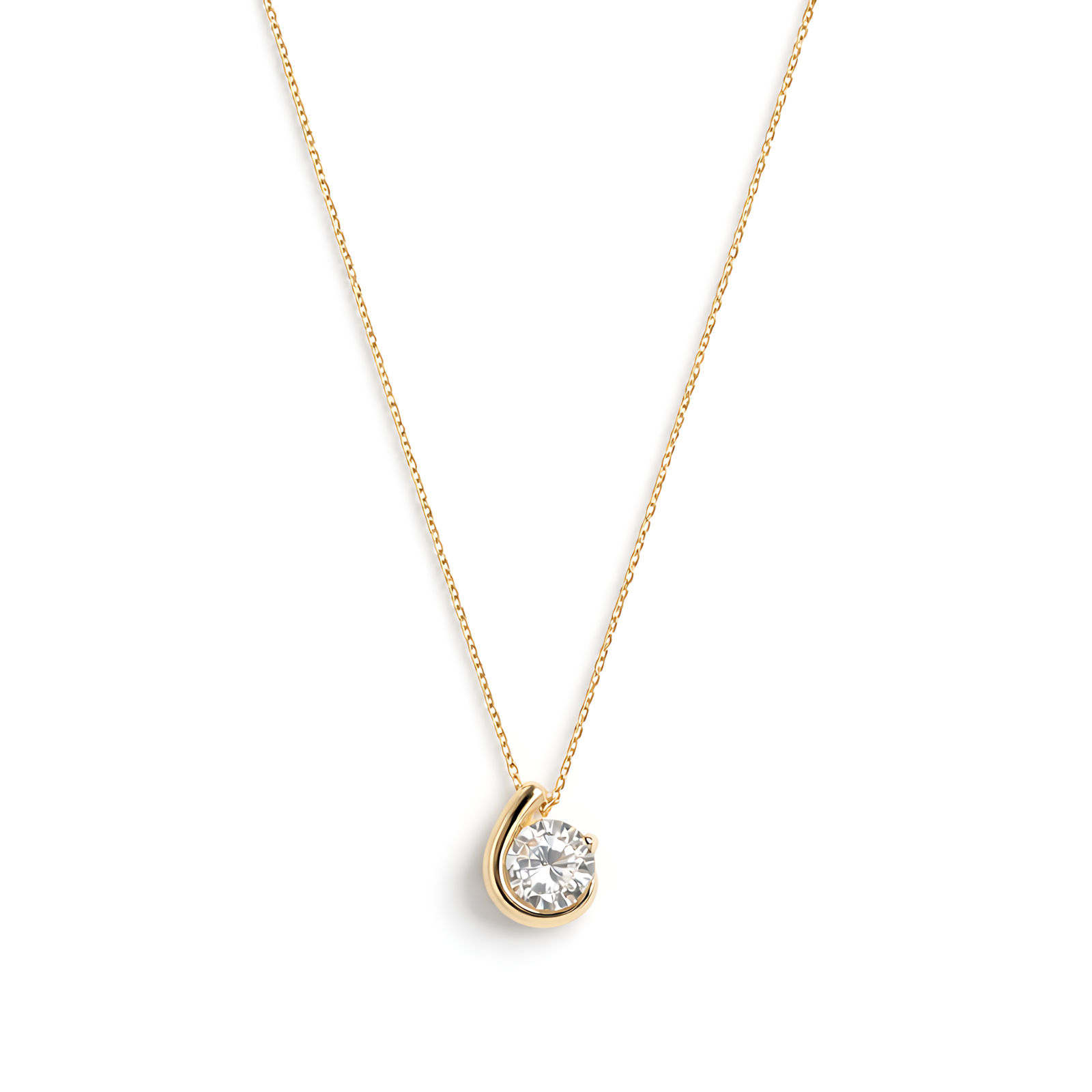 A minimalist gold-toned necklace featuring a single brilliant round-cut crystal nestled within a polished, fluid teardrop swirl.