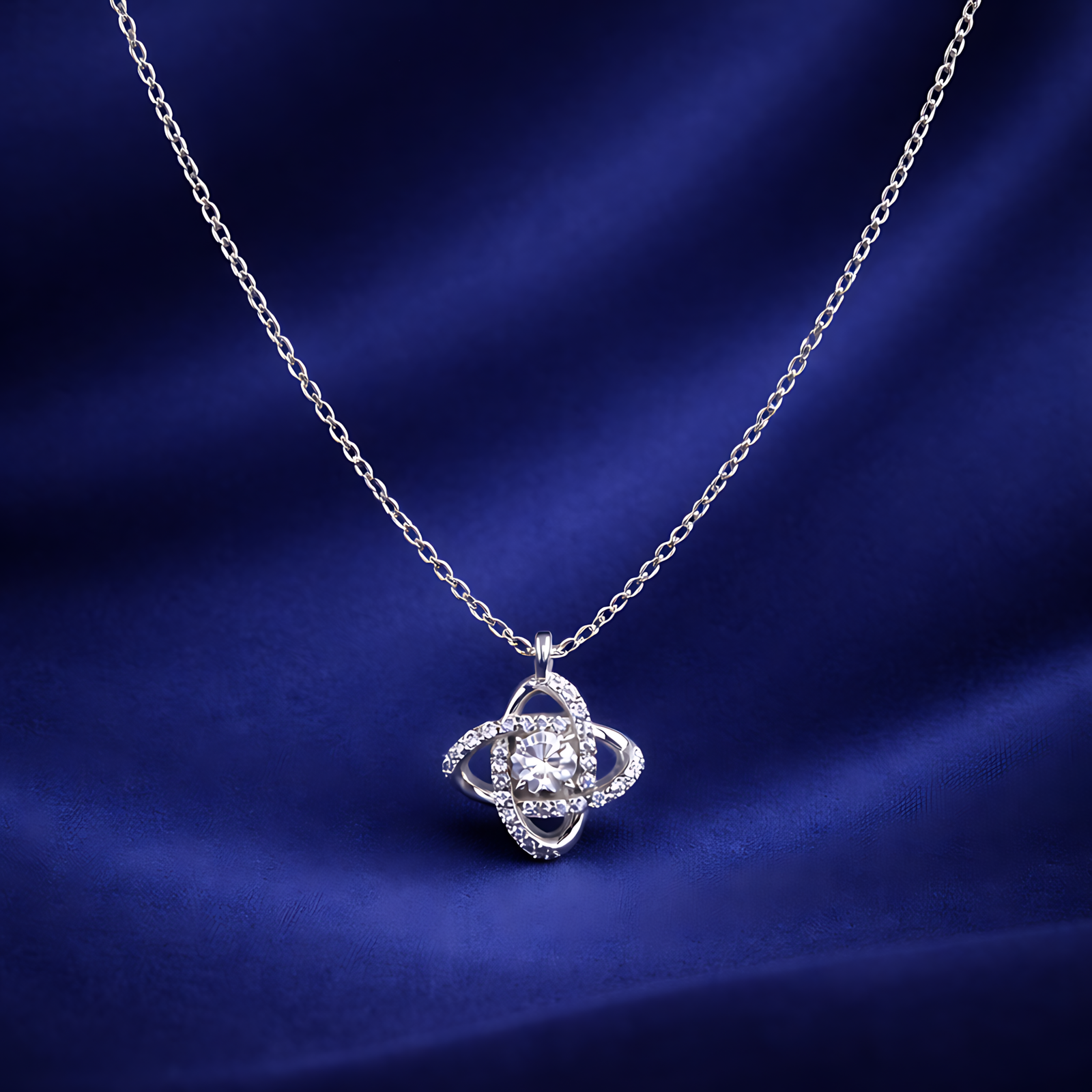 A dainty silver-toned necklace featuring a floral-inspired pendant with a central brilliant stone surrounded by crystal-set petals.