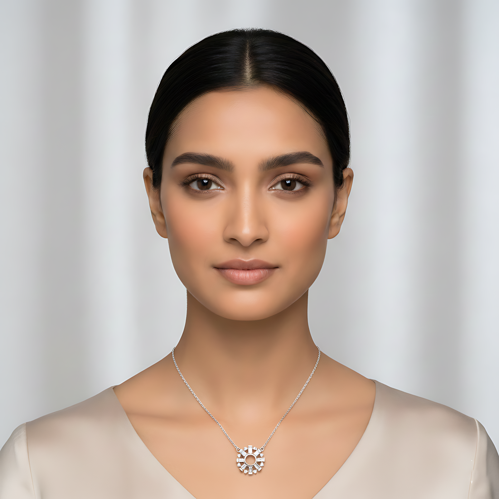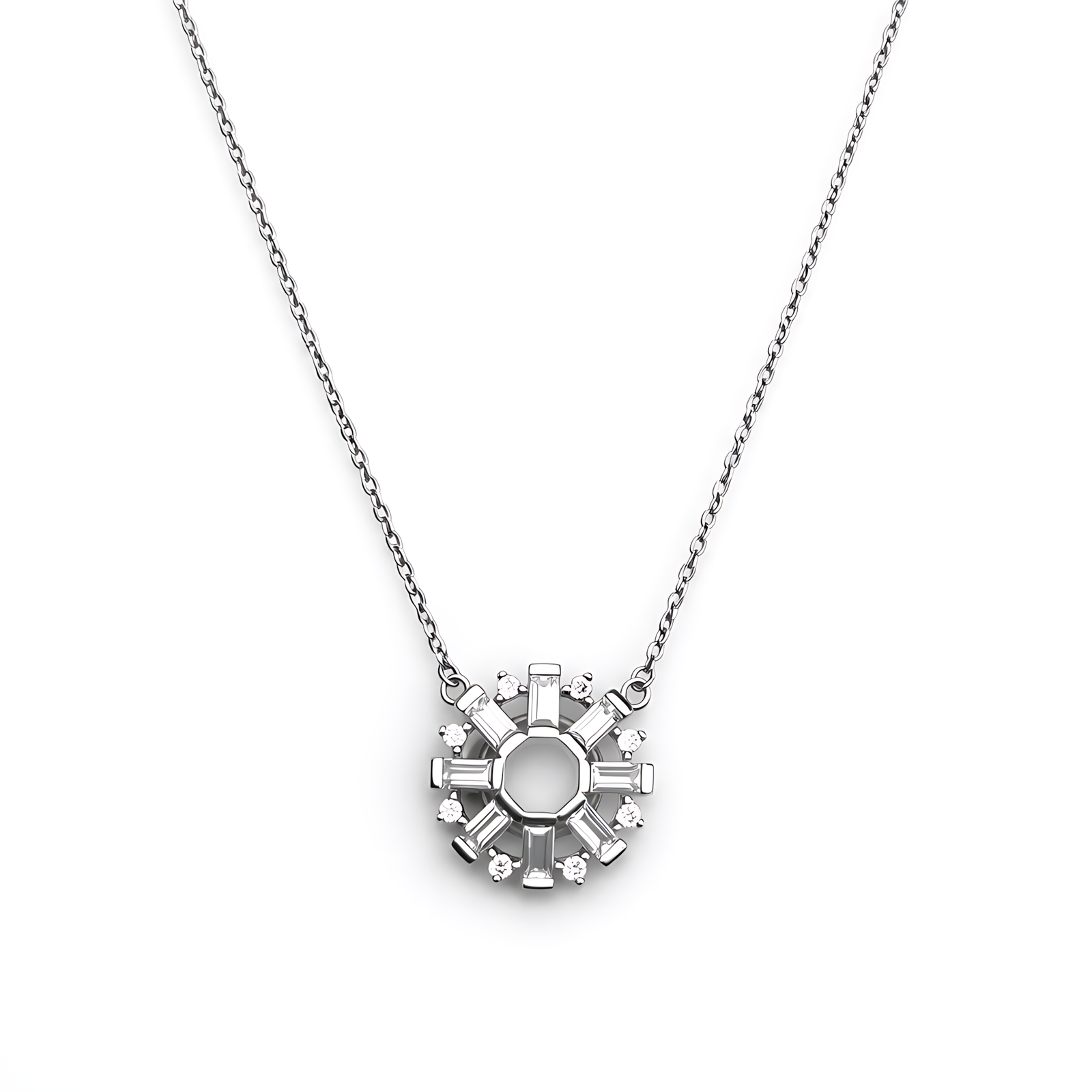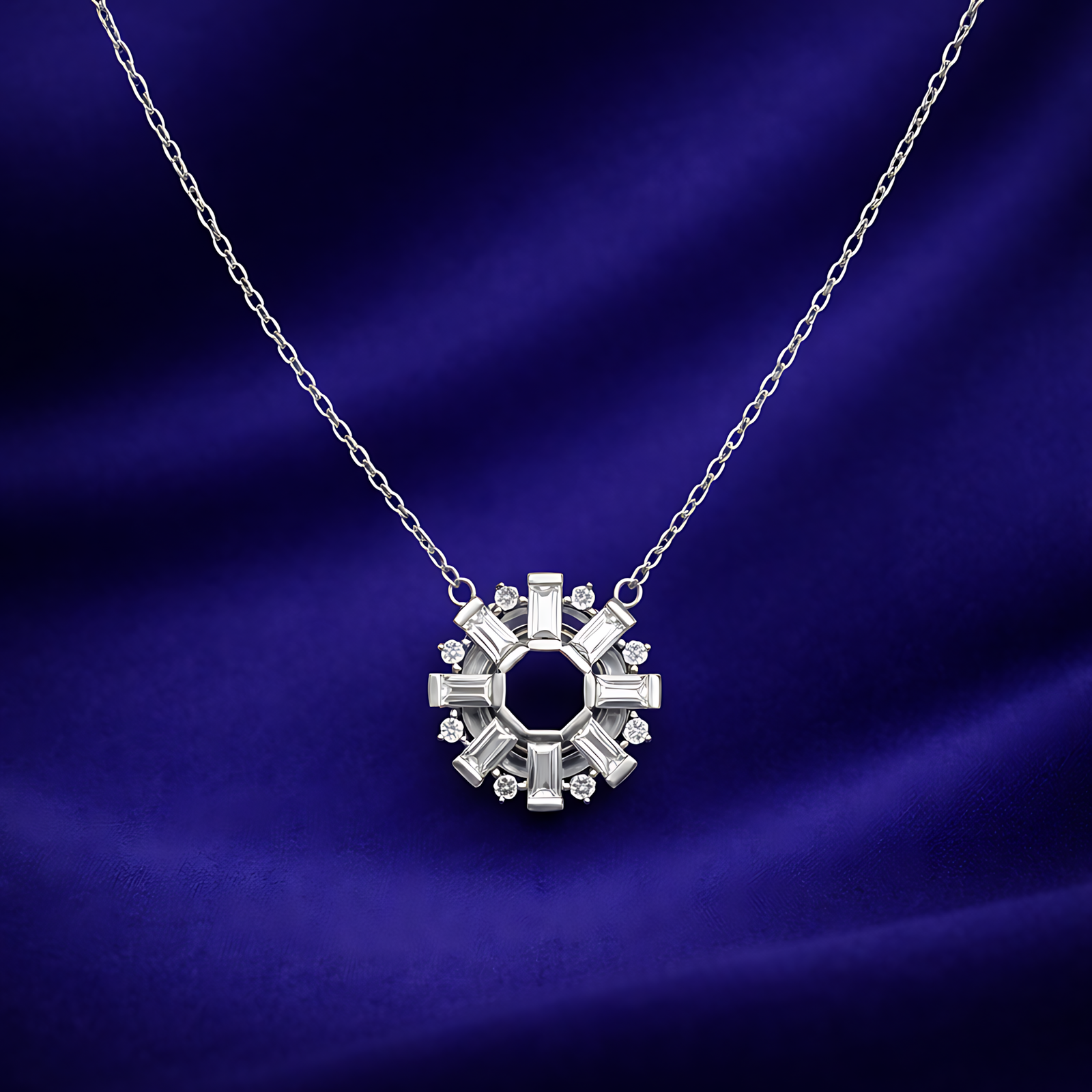 A bold silver-toned necklace featuring a circular pendant with radiating rectangular crystal “spokes” resembling a stylized sun or gear.