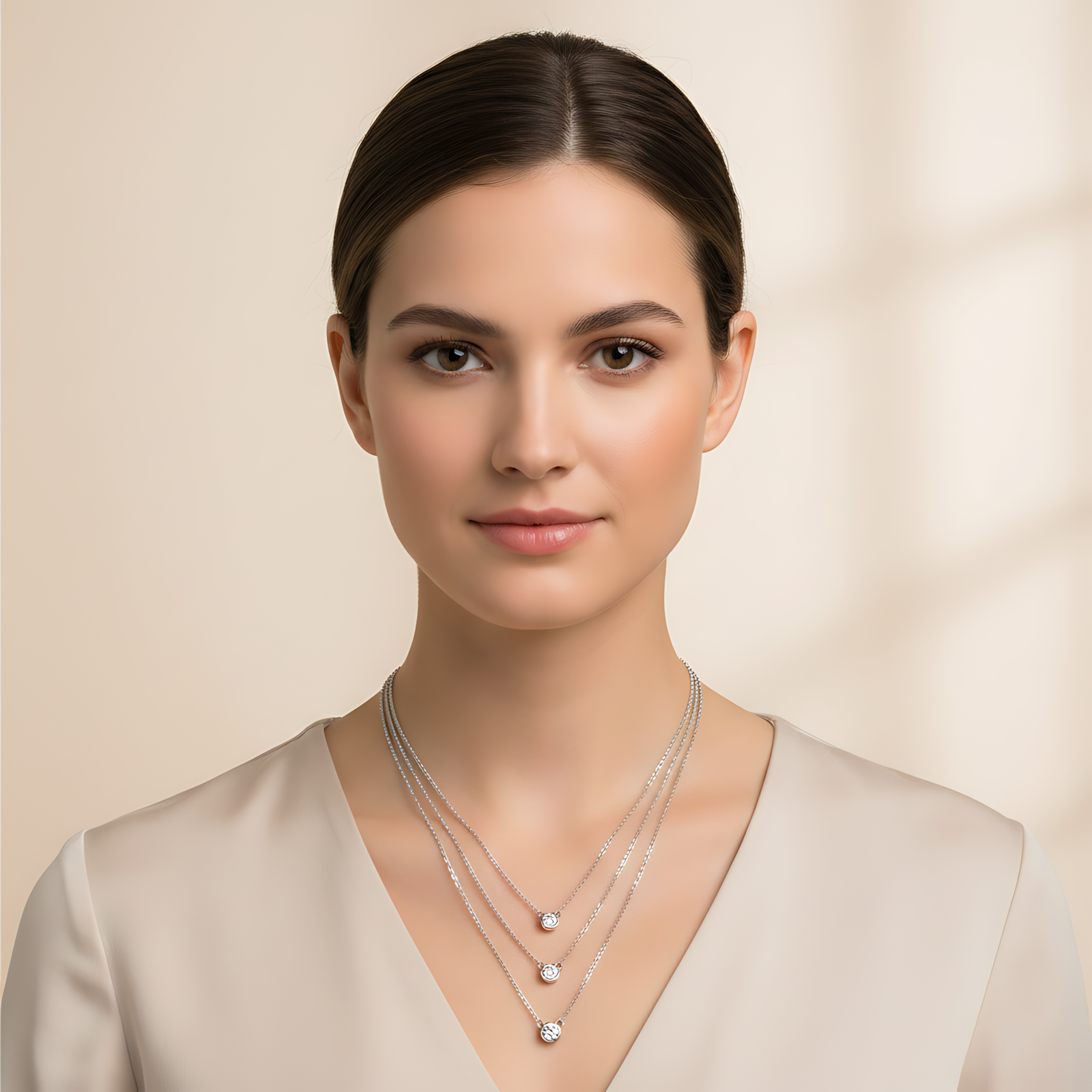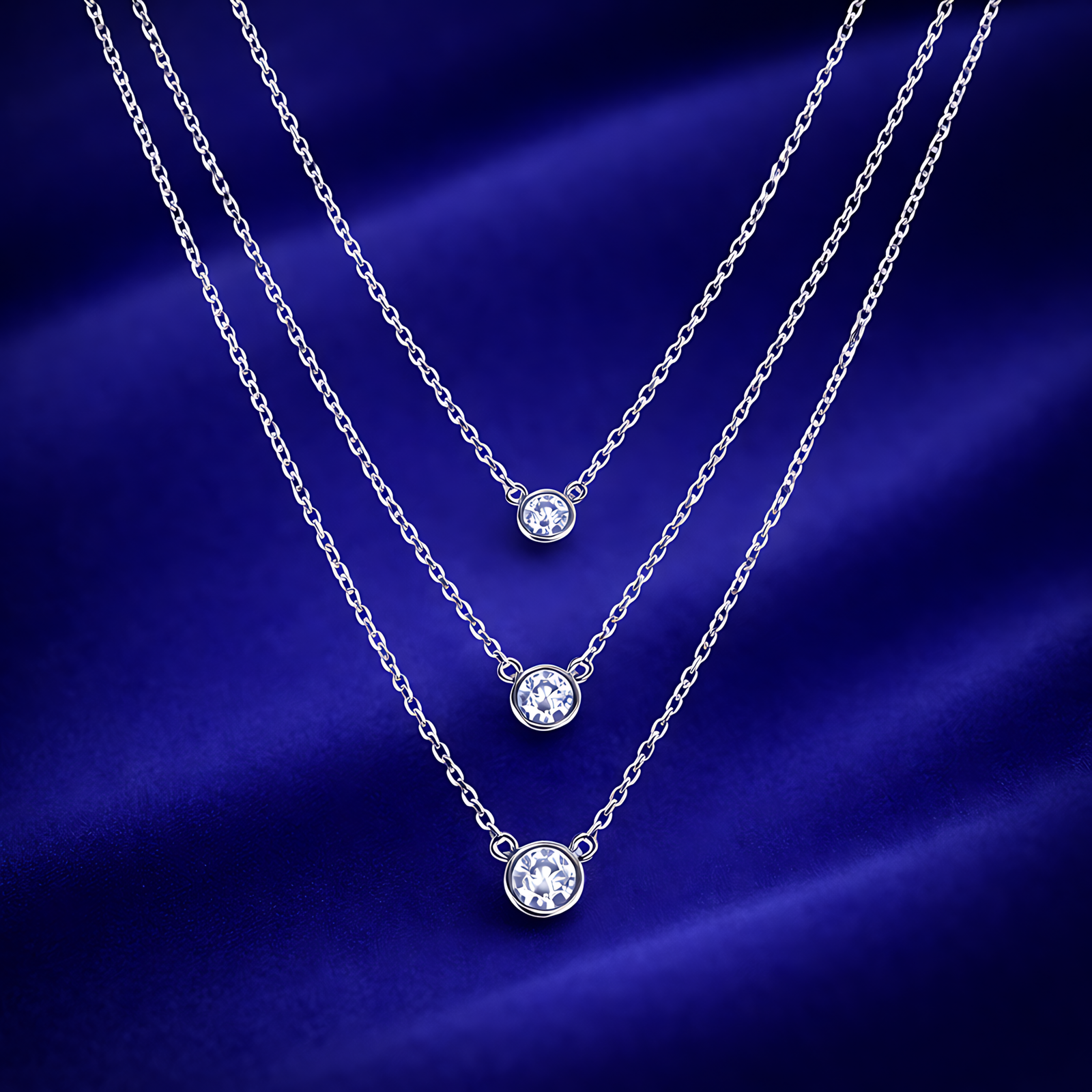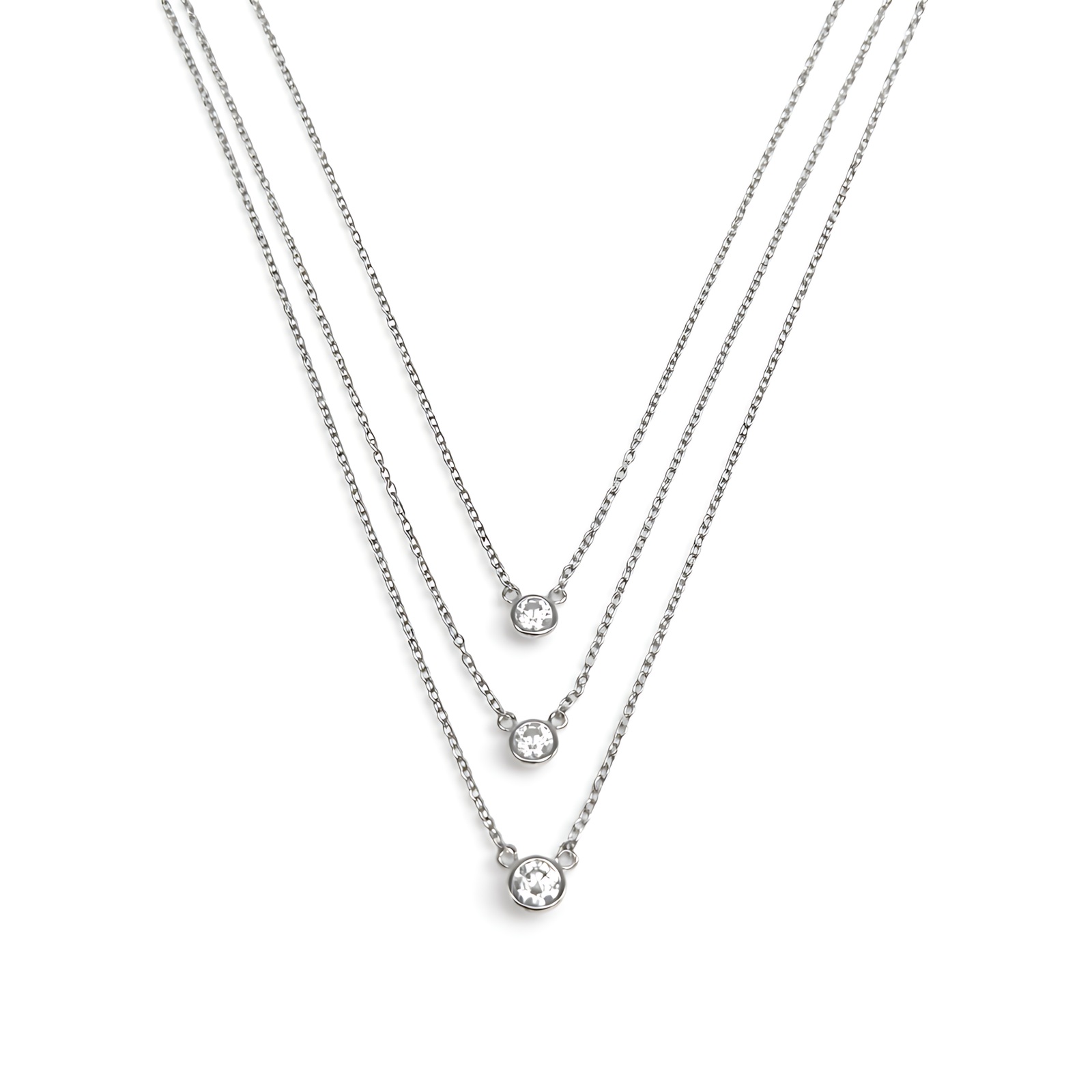 A sophisticated silver-toned layered necklace featuring three delicate chains of varying lengths, each adorned with a single bezel-set brilliant-cut crystal.