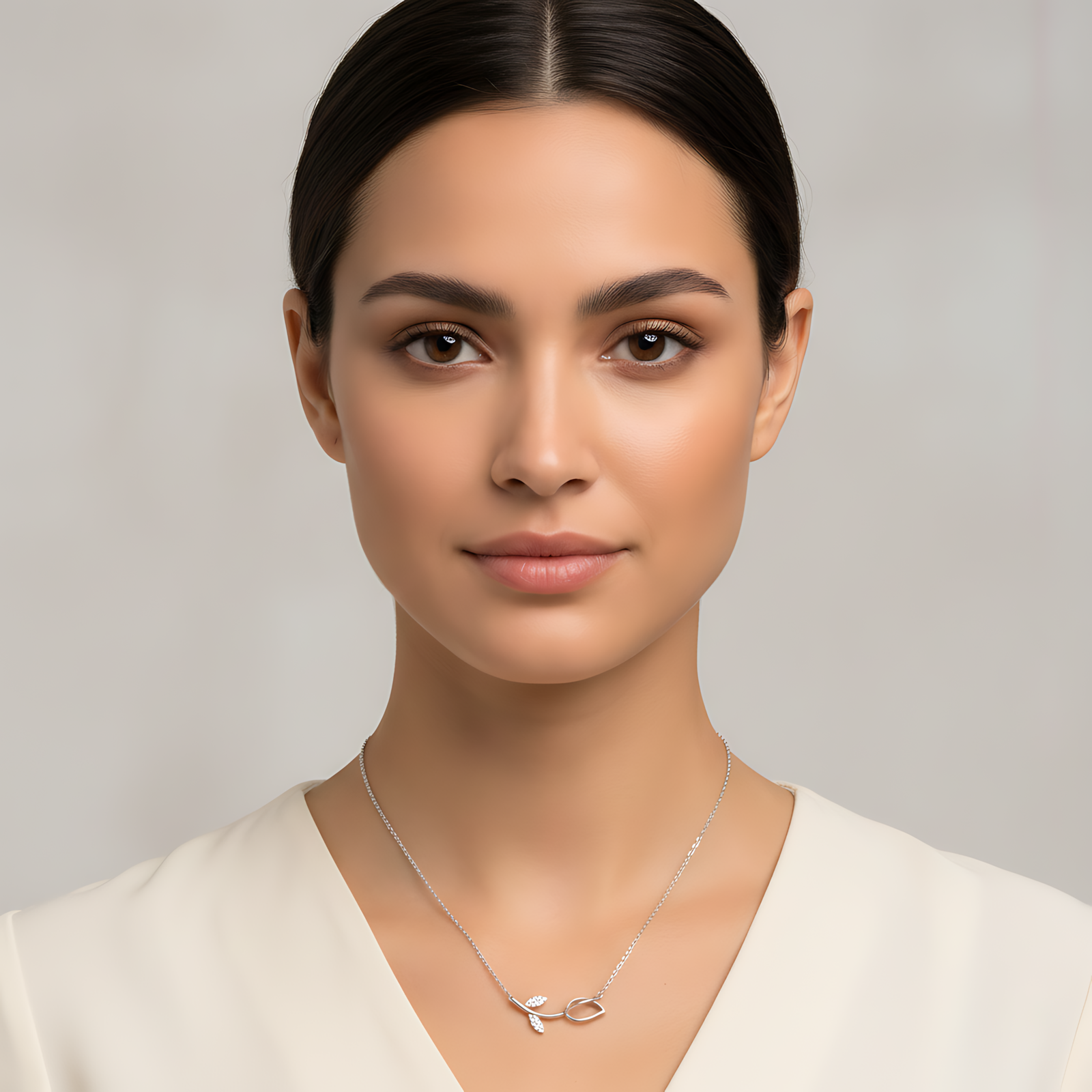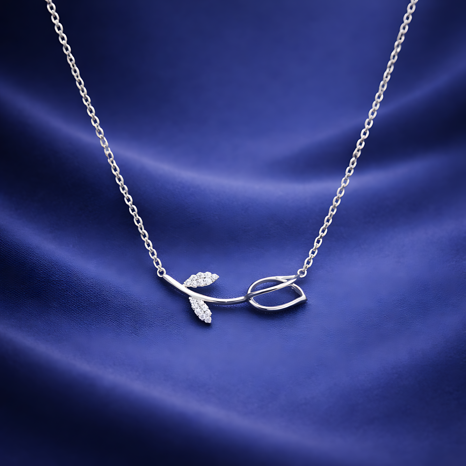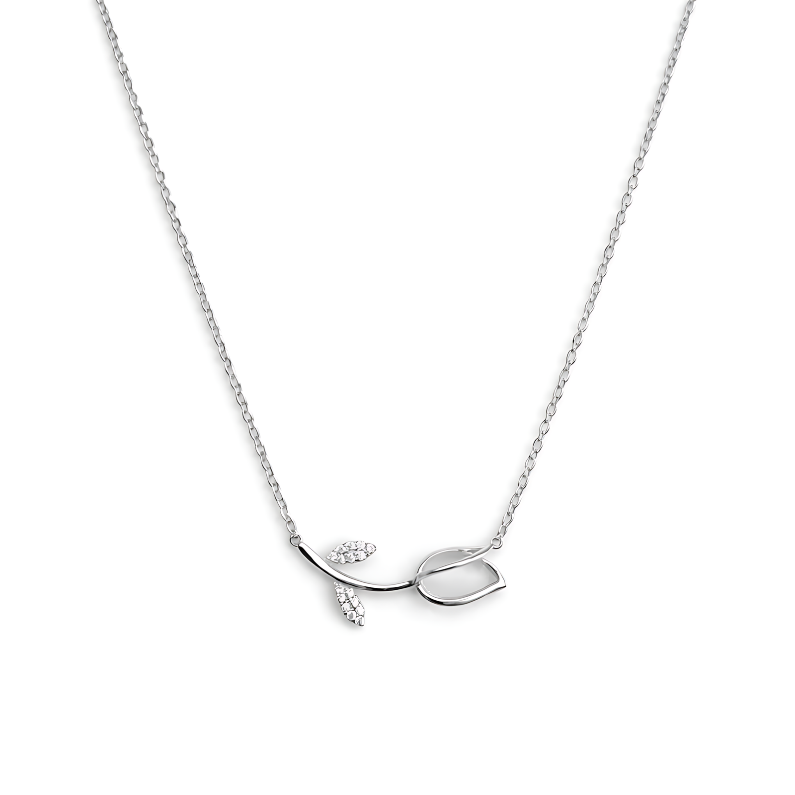 A minimalist silver-toned necklace featuring a horizontal tulip pendant with a polished stem and a small crystal-accented leaf.