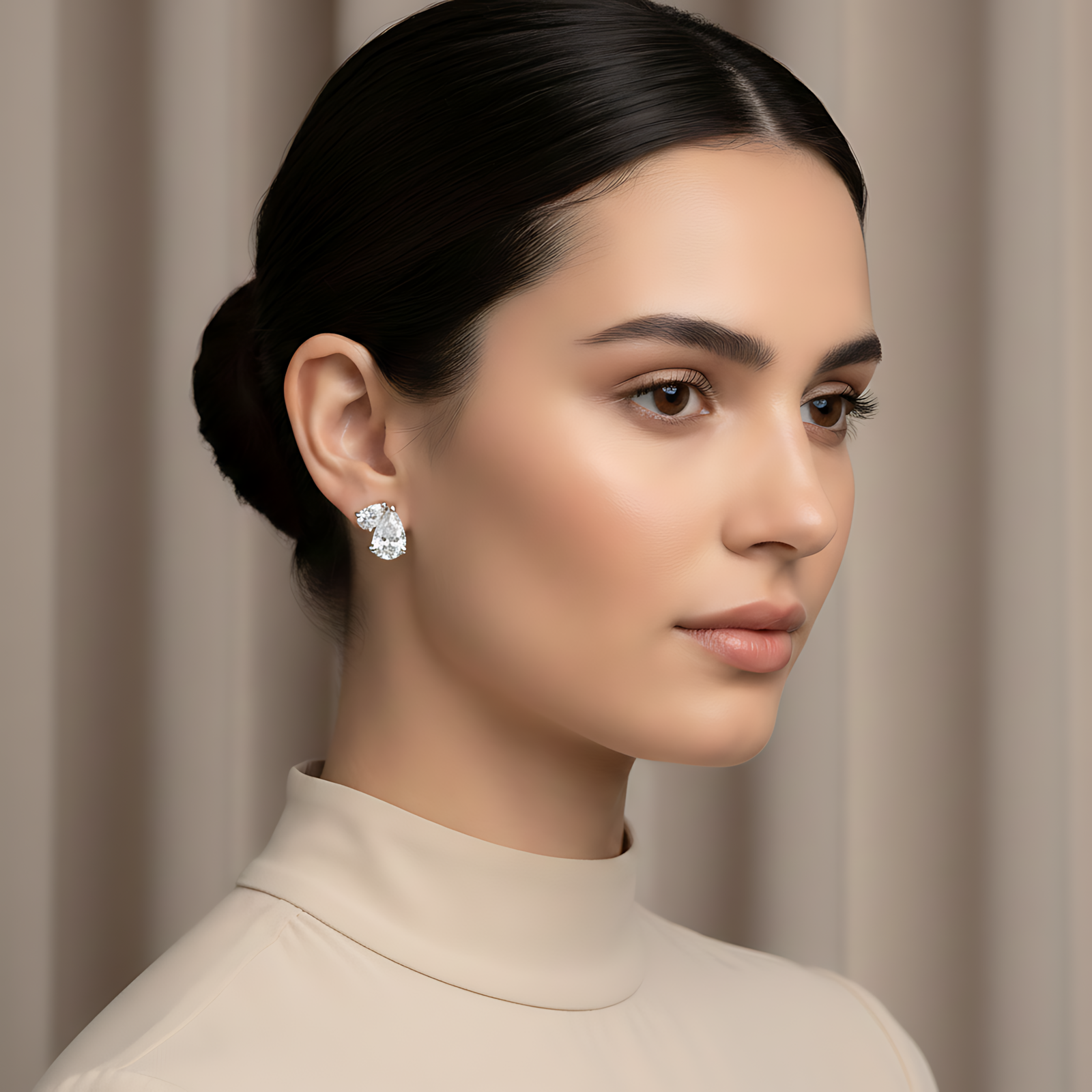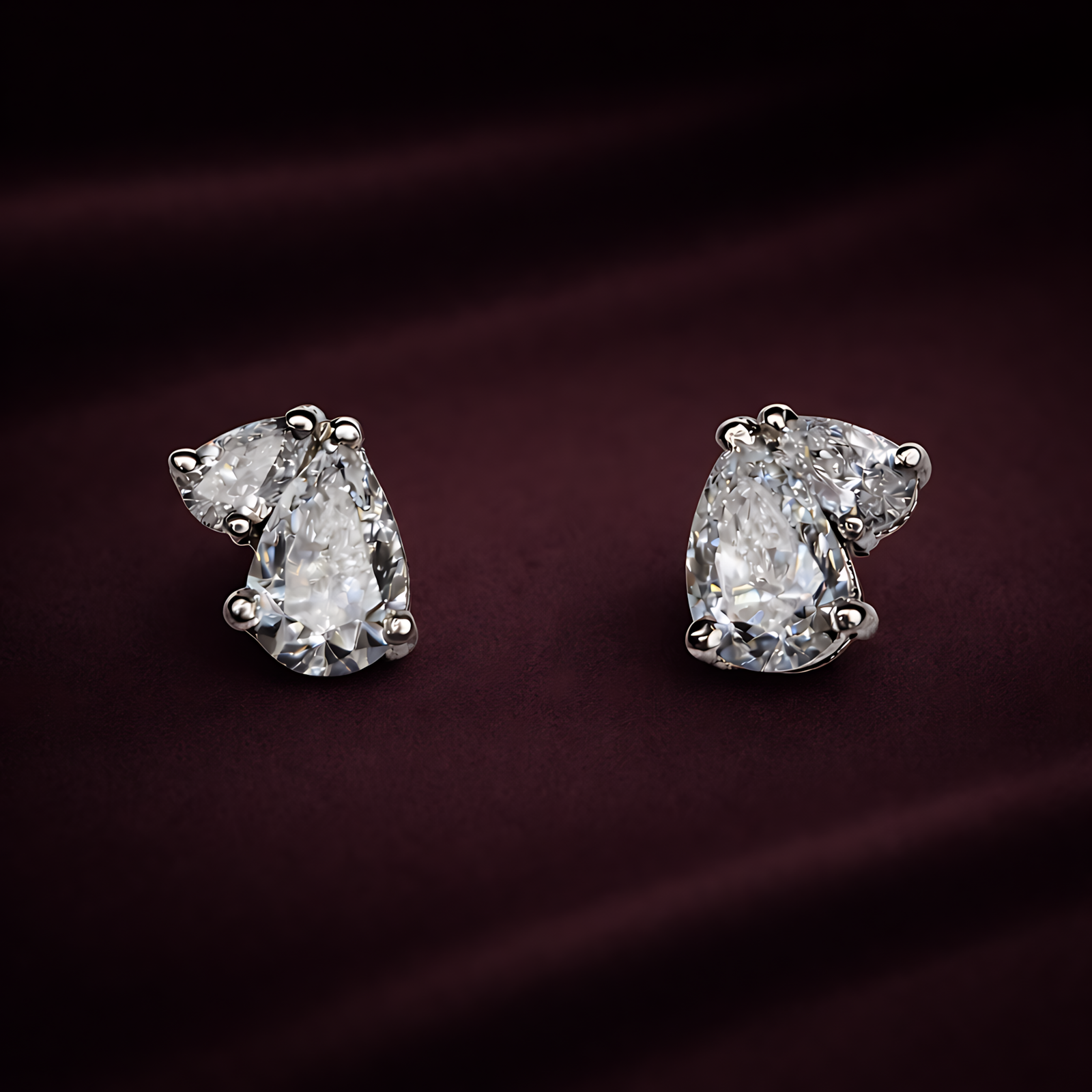 A contemporary earring that pairs two pear-shaped diamonds of different sizes for a chic, asymmetrical look.