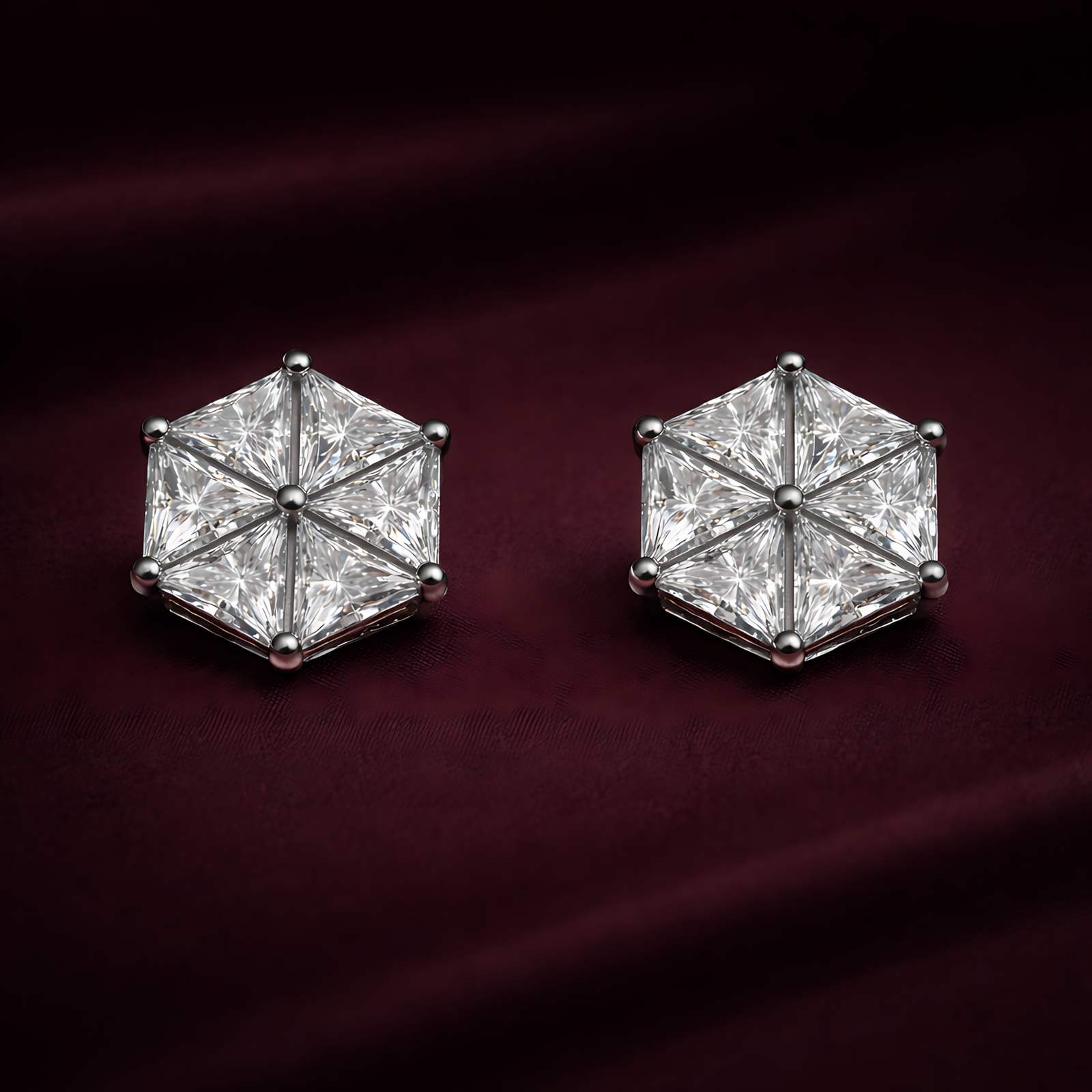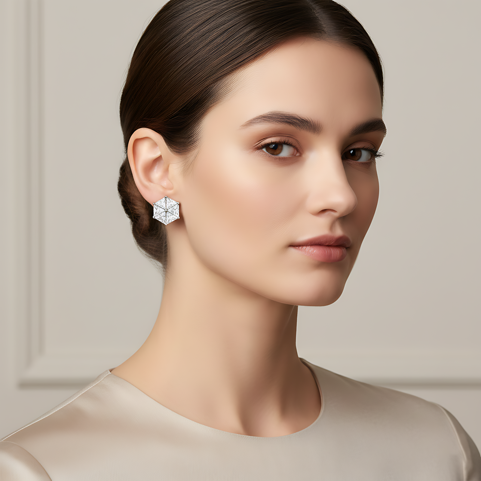 A geometric earring featuring triangular-cut diamonds seamlessly set together to form a sharp, modern hexagon silhouette.