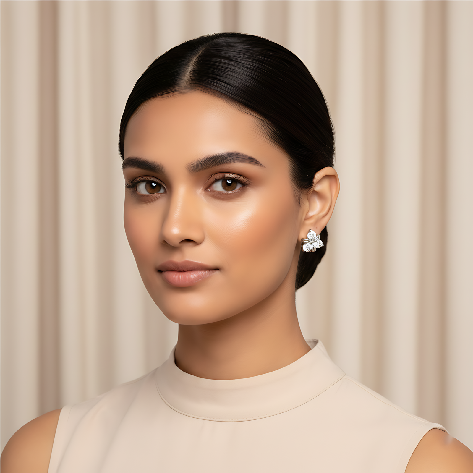 A minimalist yet bright earring featuring three round diamonds held in a tight triangular formation for a subtle glow.