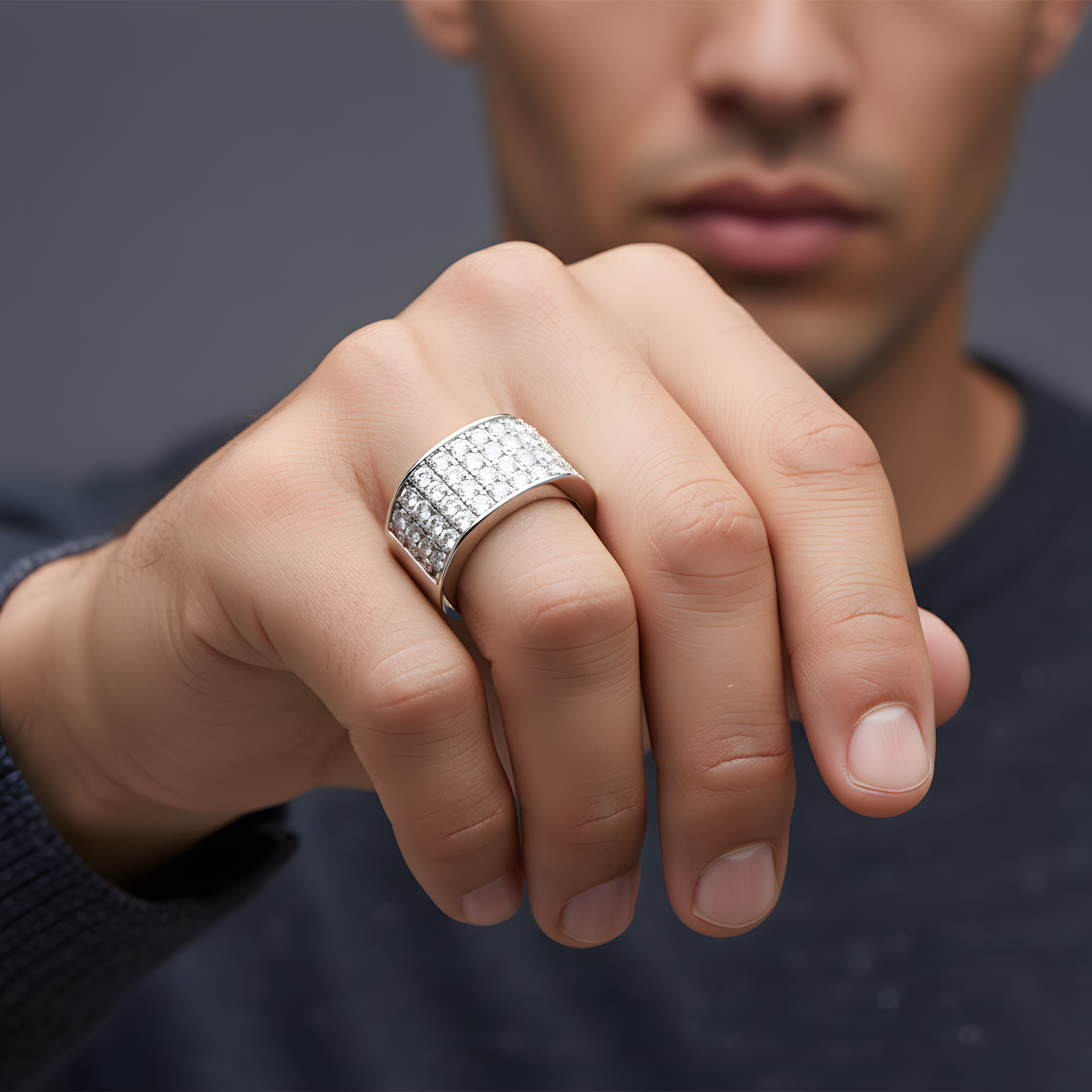A bold and substantial Ring designed with five continuous rows of brilliant-cut stones set into a wide, polished silver frame.