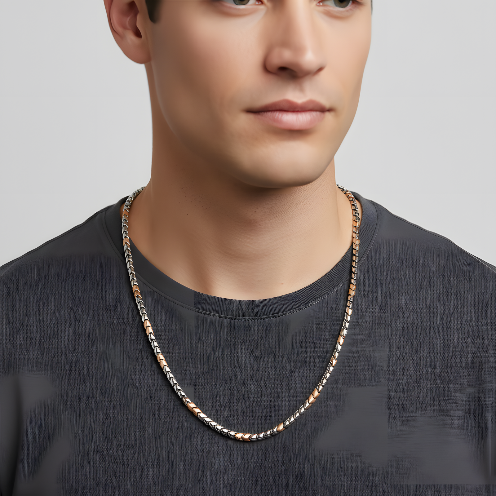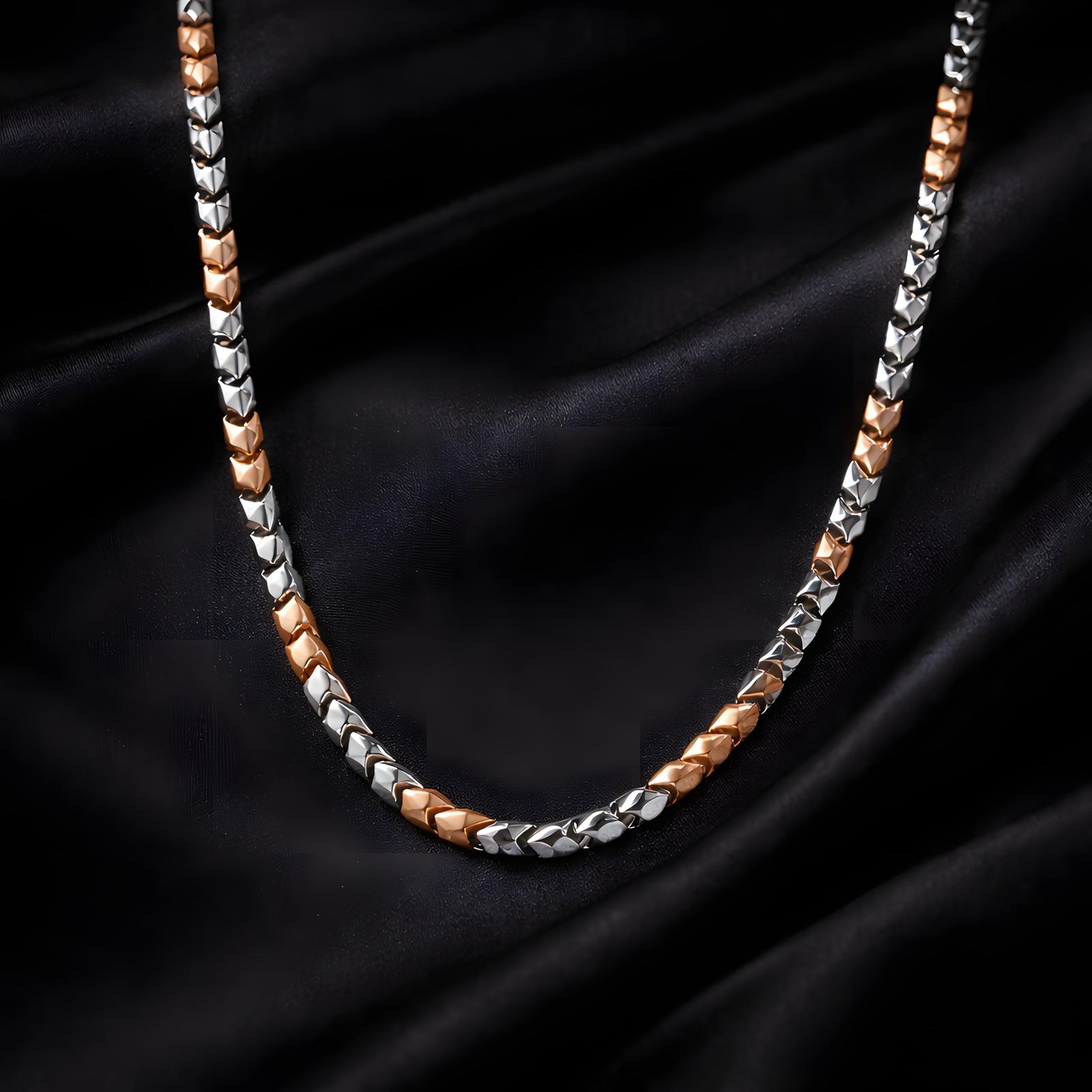 A modern, bold chain showcasing alternating silver and rose-gold toned geometric links for a striking, contemporary contrast.