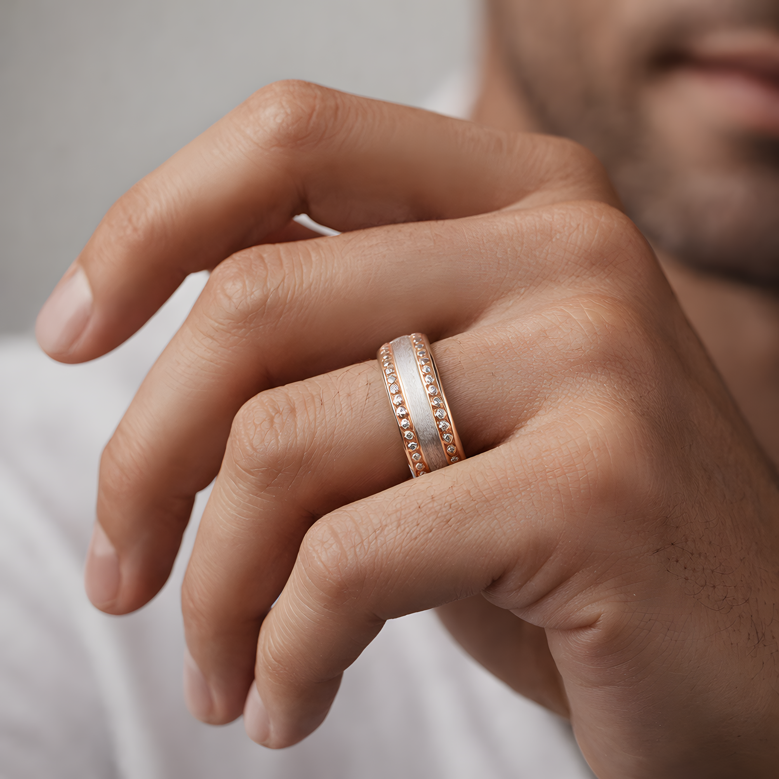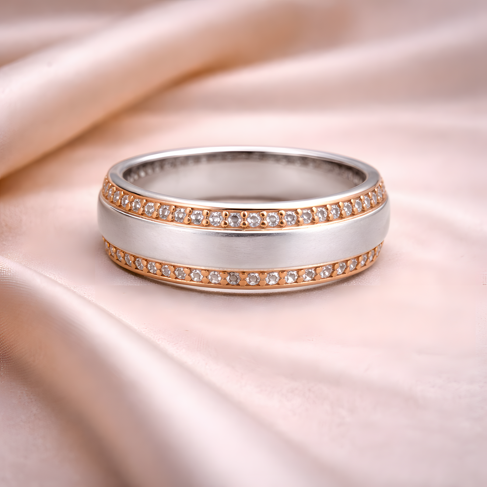 A sophisticated Ring featuring a central silver track of pavé stones framed by elegant rose-gold toned borders for a refined contrast.