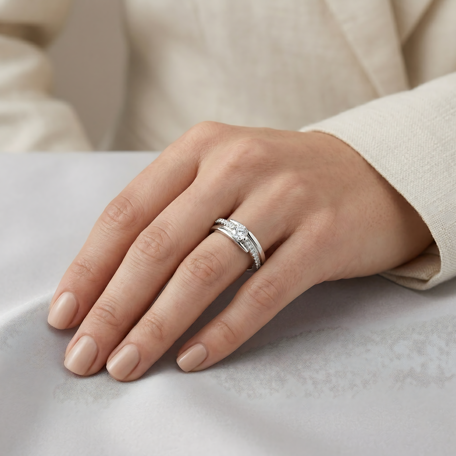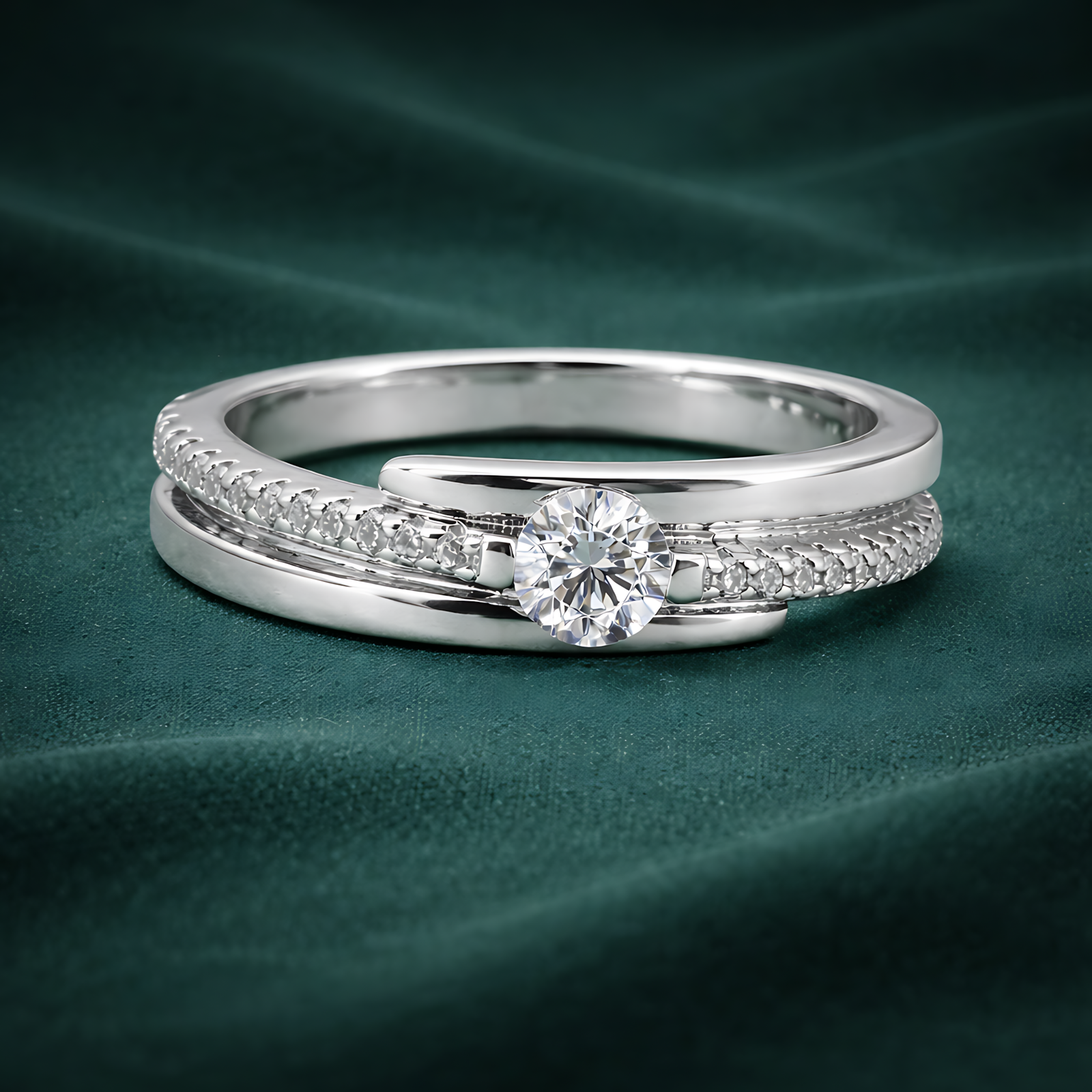 This modern ring features an elegant bypass design where one band is sleekly polished and the other is lined with shimmering pave-set stones. A brilliant round-cut solitaire sits at the center, nestled between the intersecting bands for a dynamic and sophisticated look.
