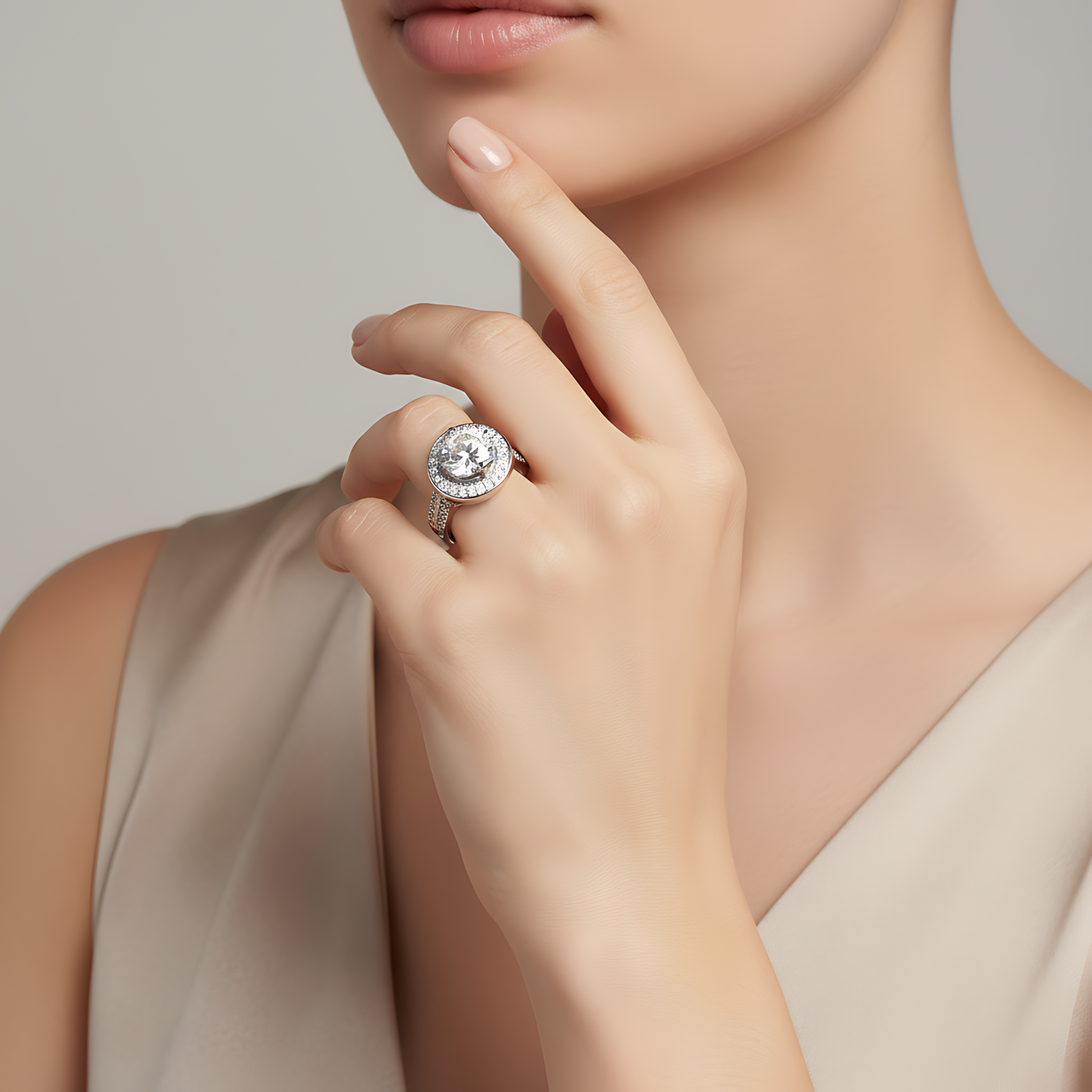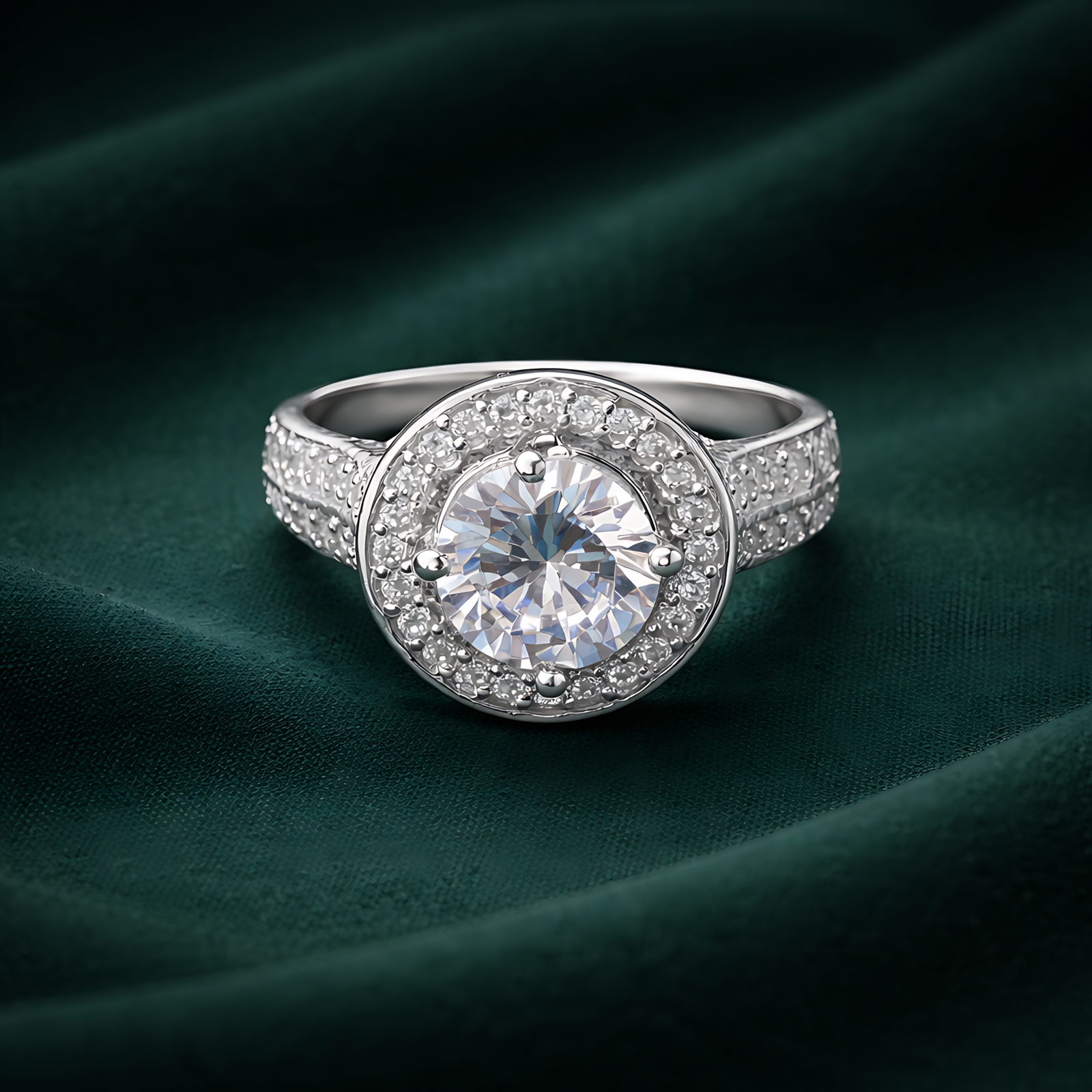 A classic silver-toned ring featuring a large, round brilliant-cut center crystal surrounded by a shimmering double-row crystal ring setting and a pavé-accented band.