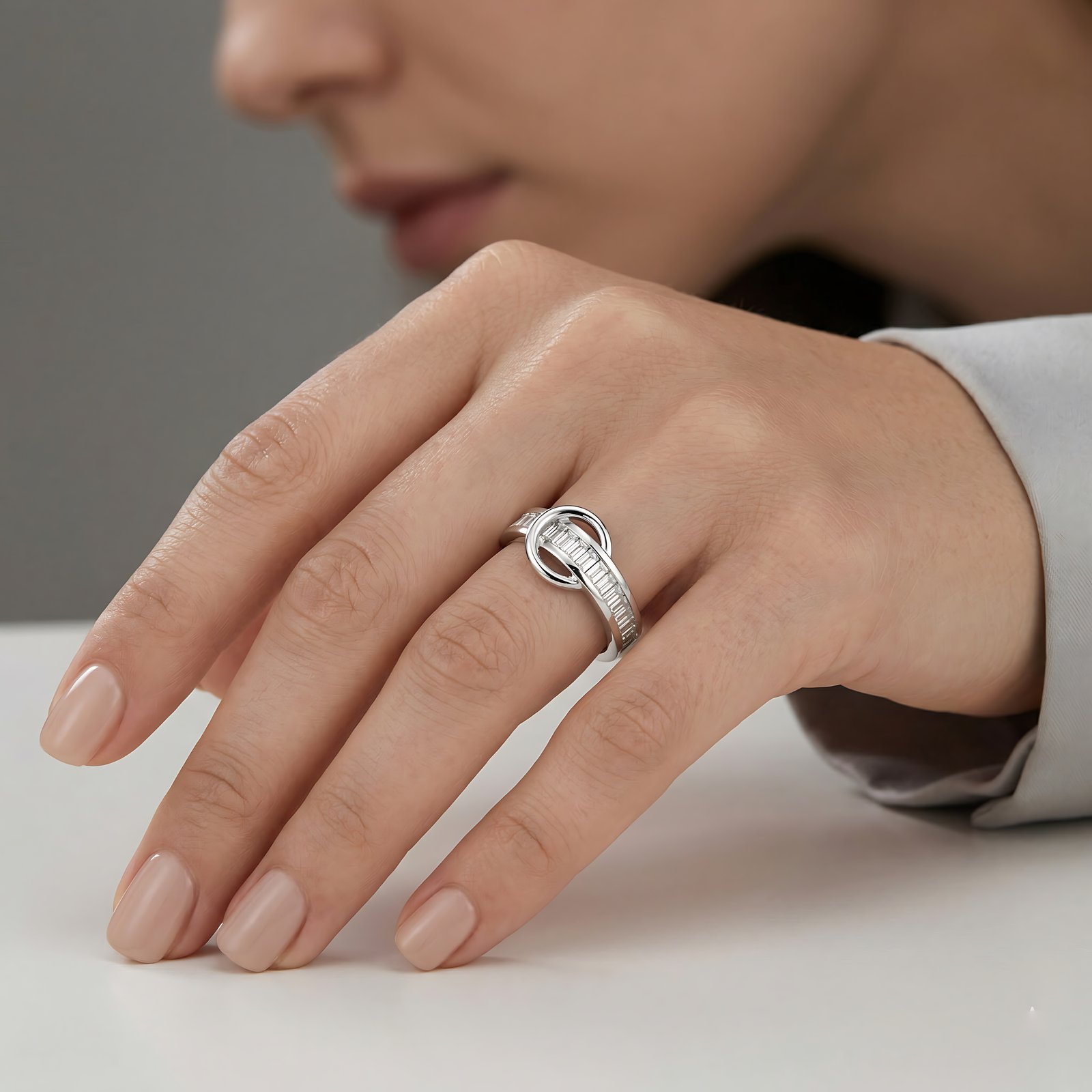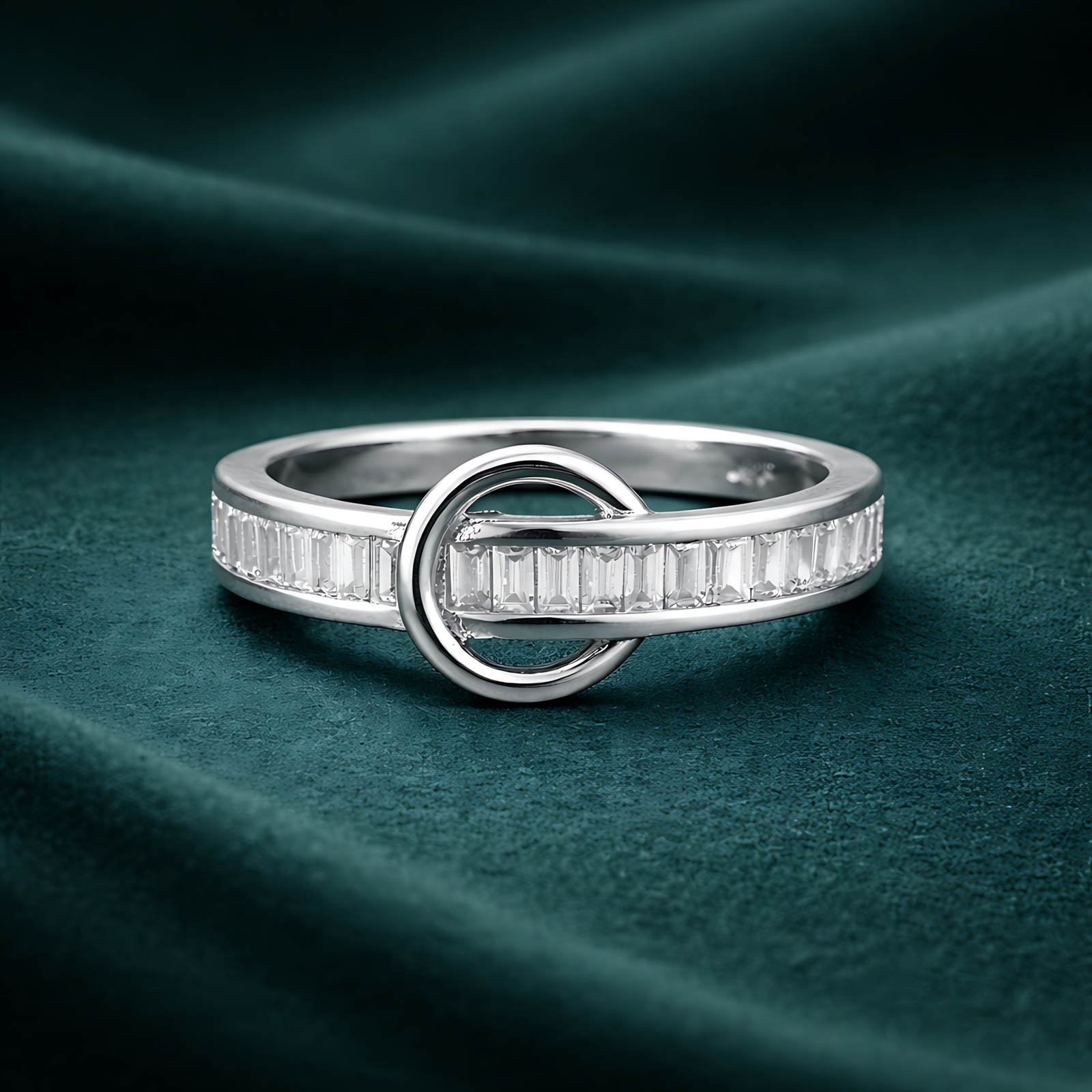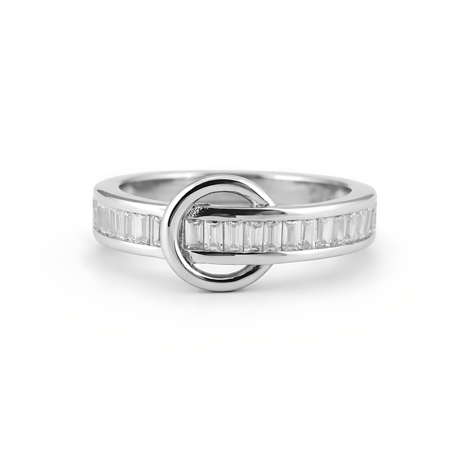 A bold statement piece featuring a wide band densely set with clear baguette-cut stones for maximum brilliance. The design is uniquely accented by a polished silver circular loop that mimics a buckle for a high-fashion, contemporary look.