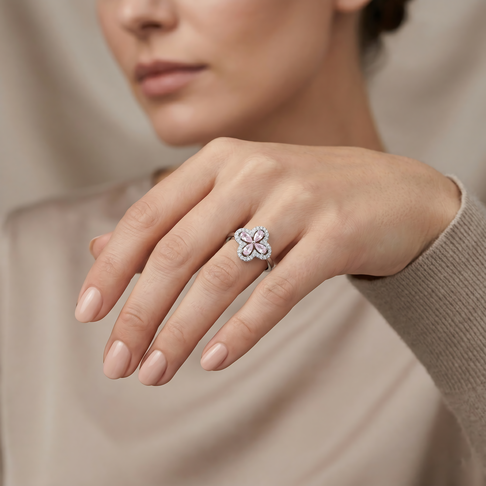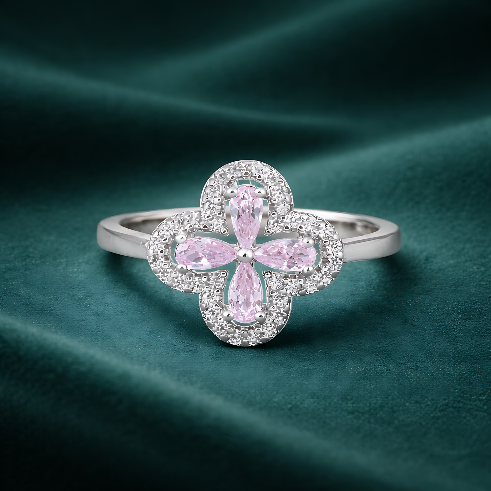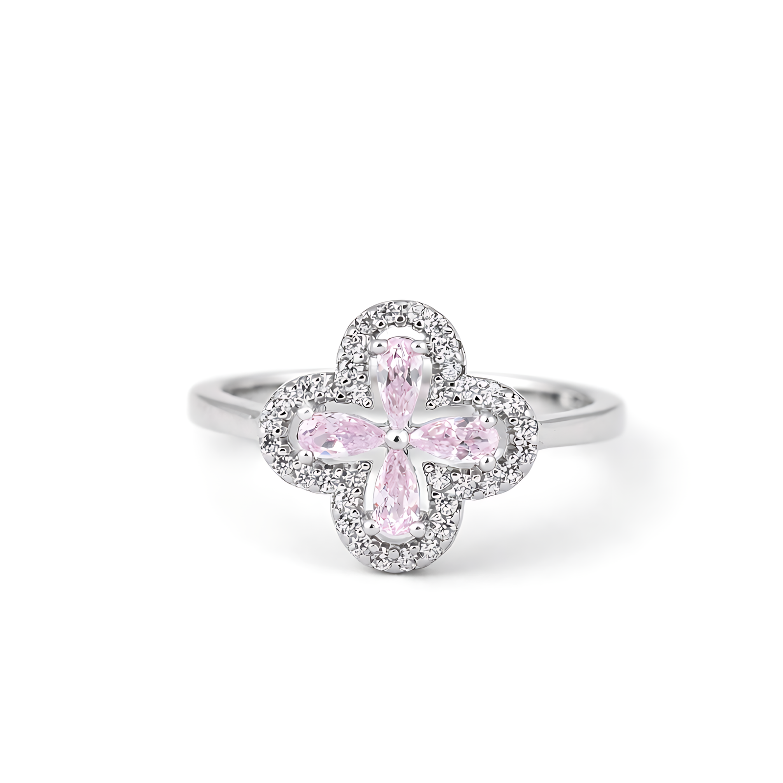 This elegant ring features a four-leaf clover motif centered with pink pear-cut stones, encircled by a shimmering halo of clear pave-set crystals. It offers a sophisticated floral design on a slim, polished silver band for a touch of timeless charm.