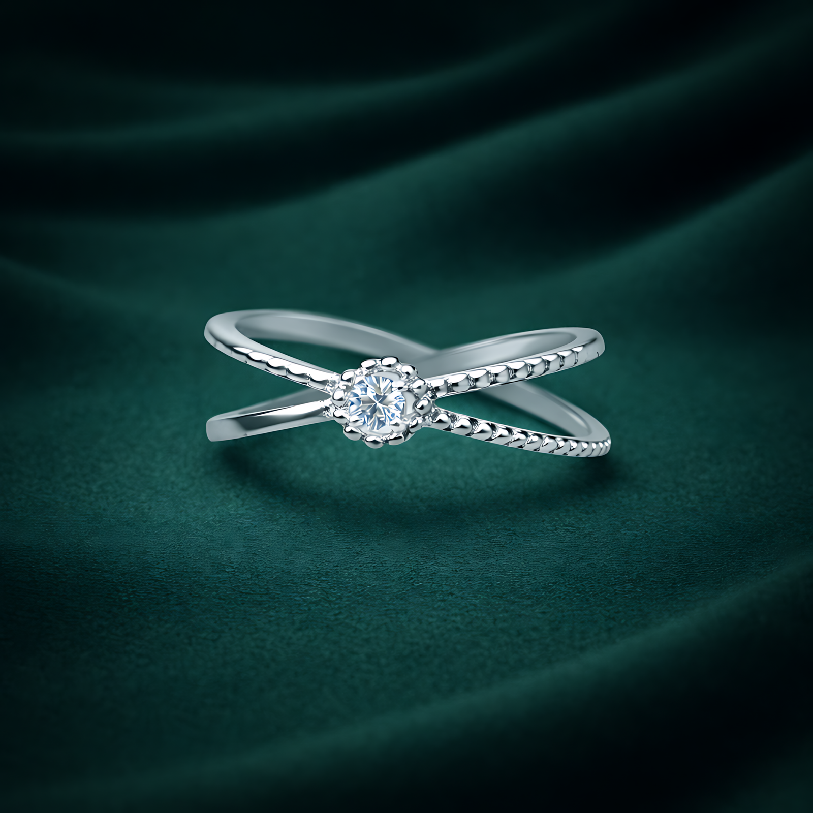 A modern silver-toned ring featuring a delicate “X” shape created by two intersecting pavé-set bands, centered with a brilliant round-cut crystal solitaire.