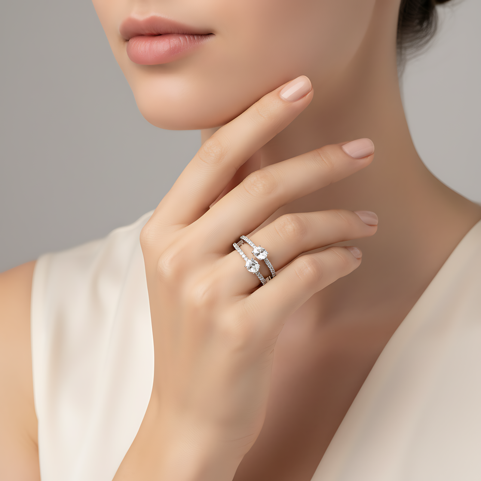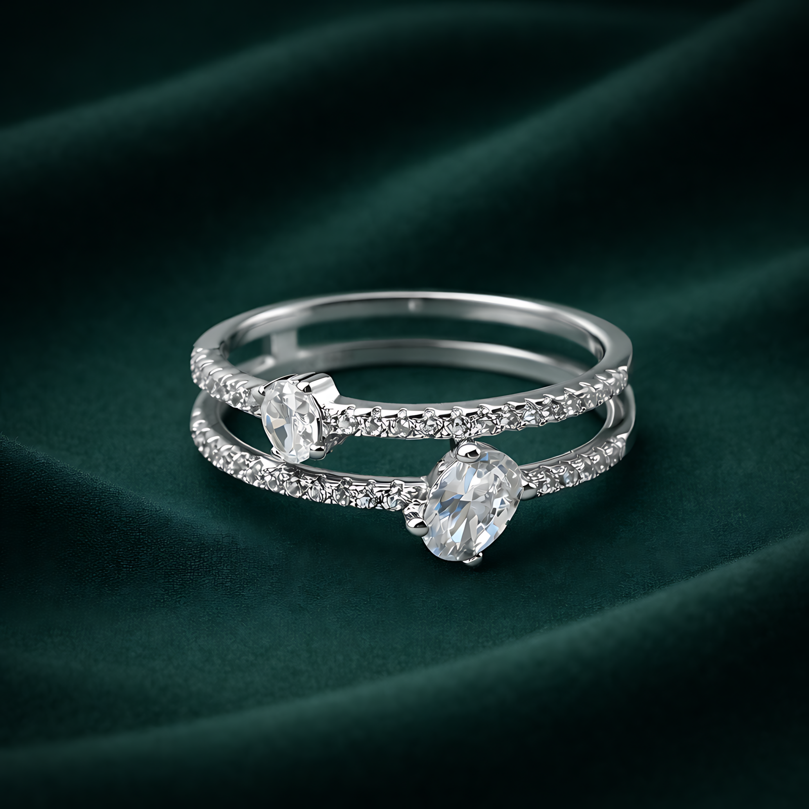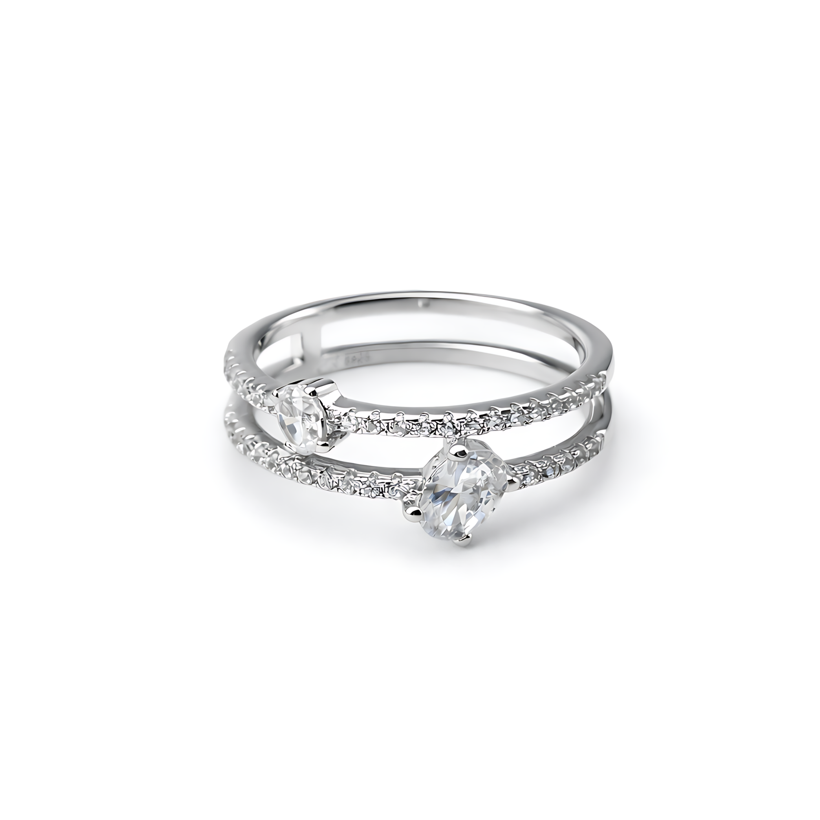 A delicate silver-toned ring featuring a contemporary open double-band design, each tier accented with shimmering pavé crystals and a central oval-cut solitaire.