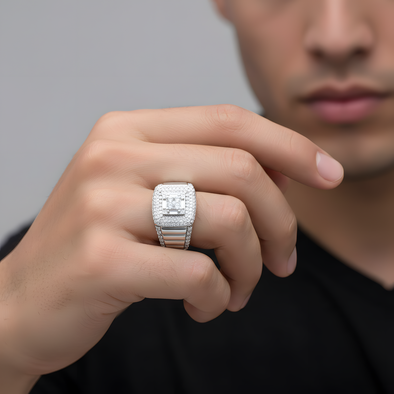 A premium masculine Ring featuring a raised square platform encrusted with stones, surrounded by a shimmering halo border and textured shoulders.