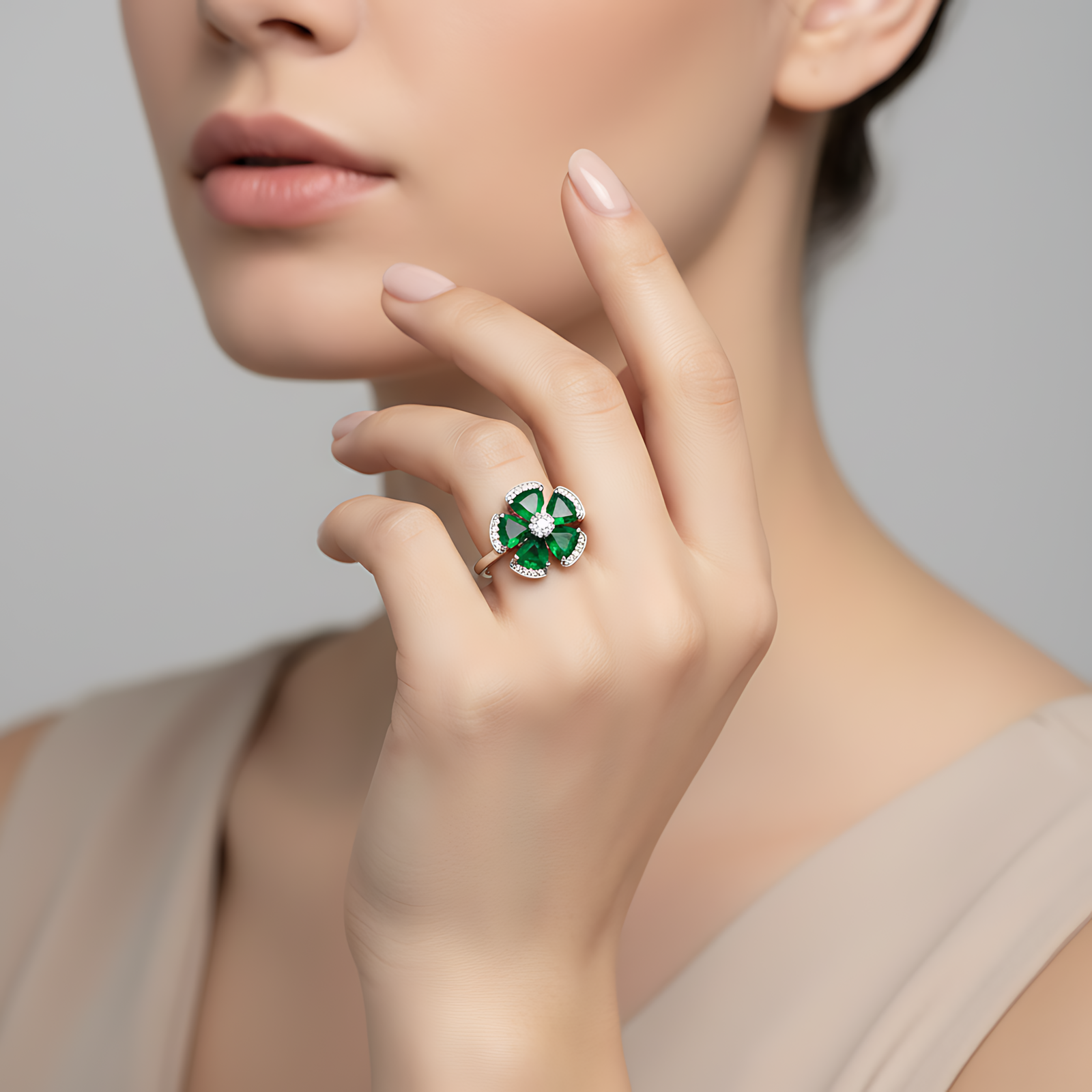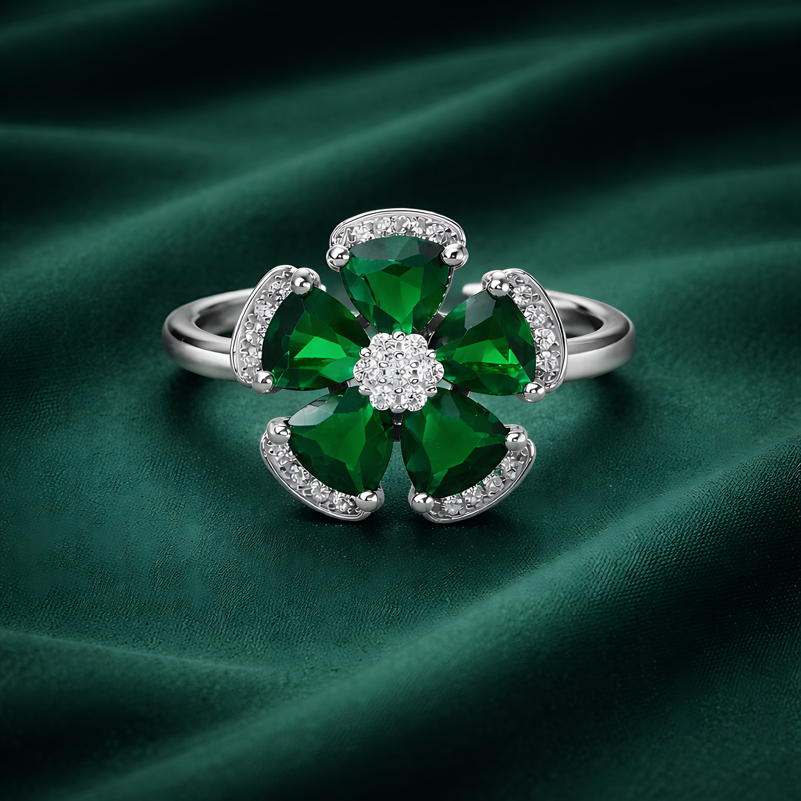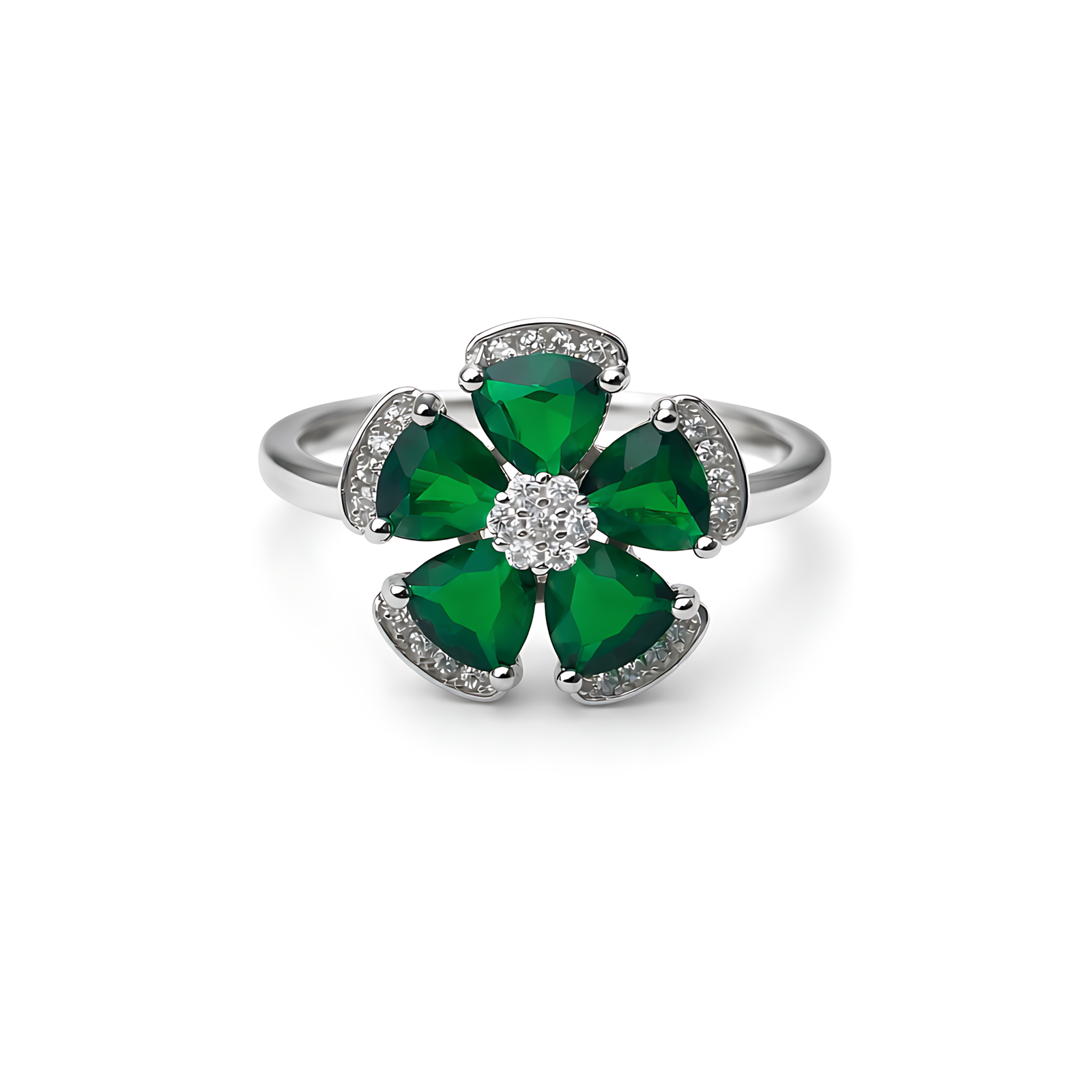 A sophisticated silver-toned ring featuring a five-petal floral design crafted from heart-cut emerald green stones with a central crystal cluster.