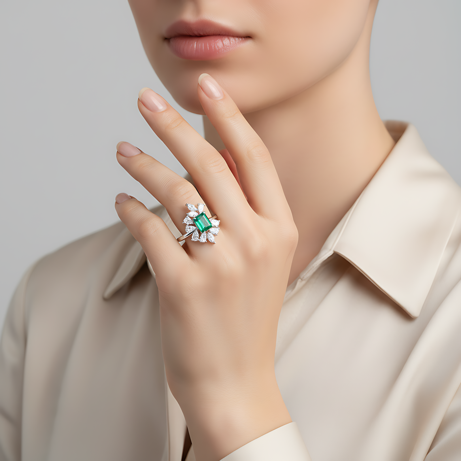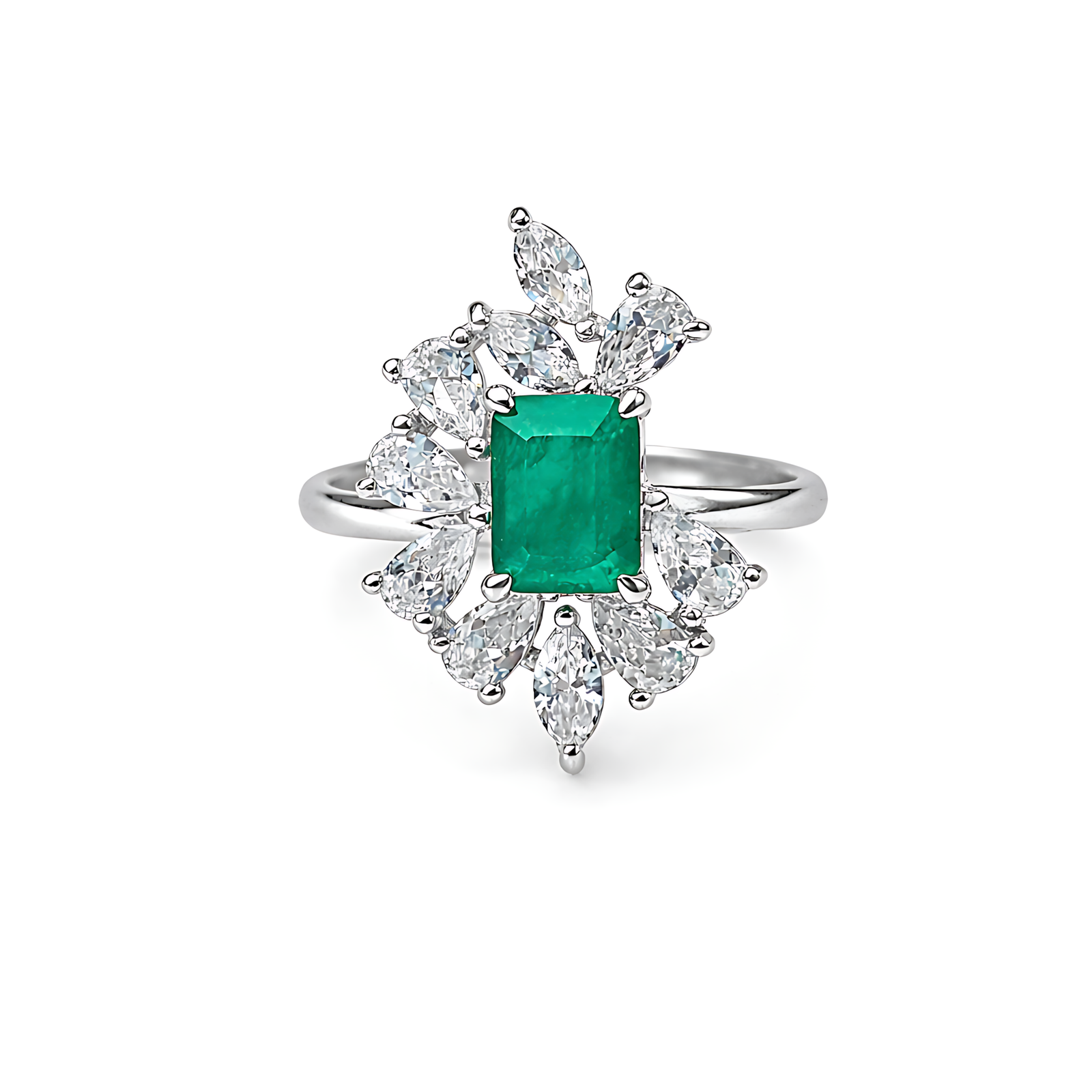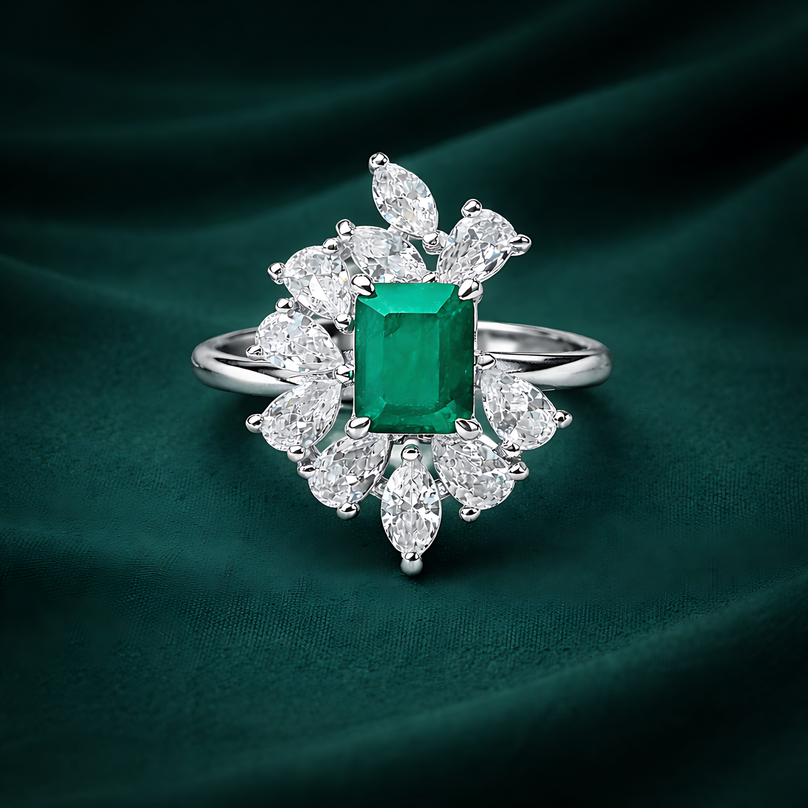 A regal silver-toned statement ring featuring a central emerald-cut green stone, framed on one side by a cascading fan of marquise and pear-cut clear crystals.