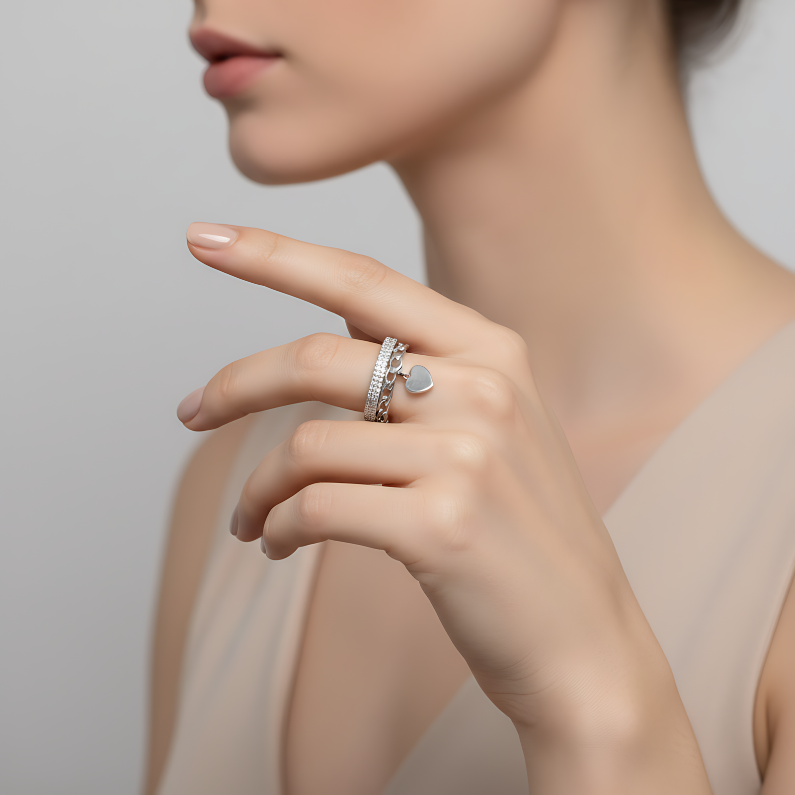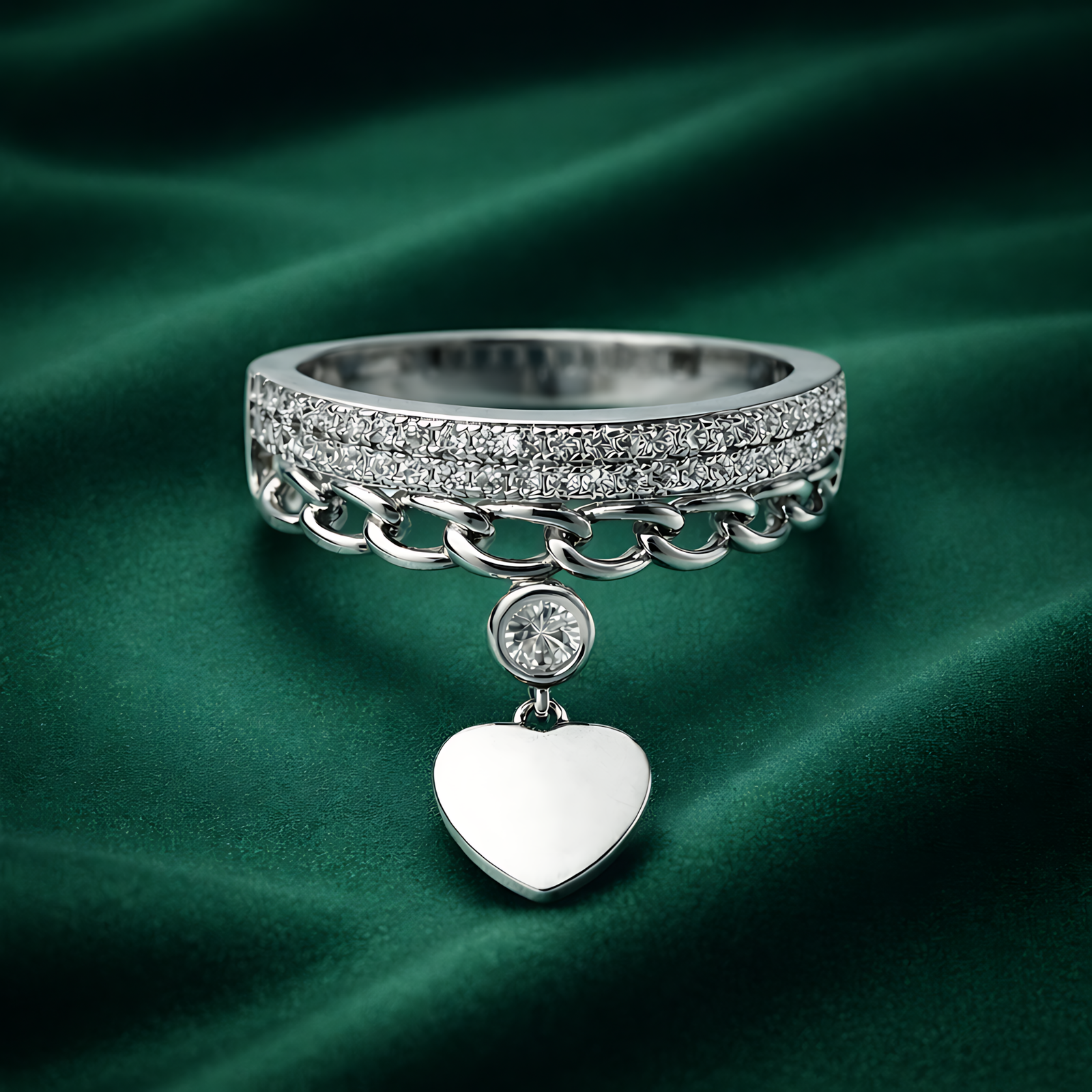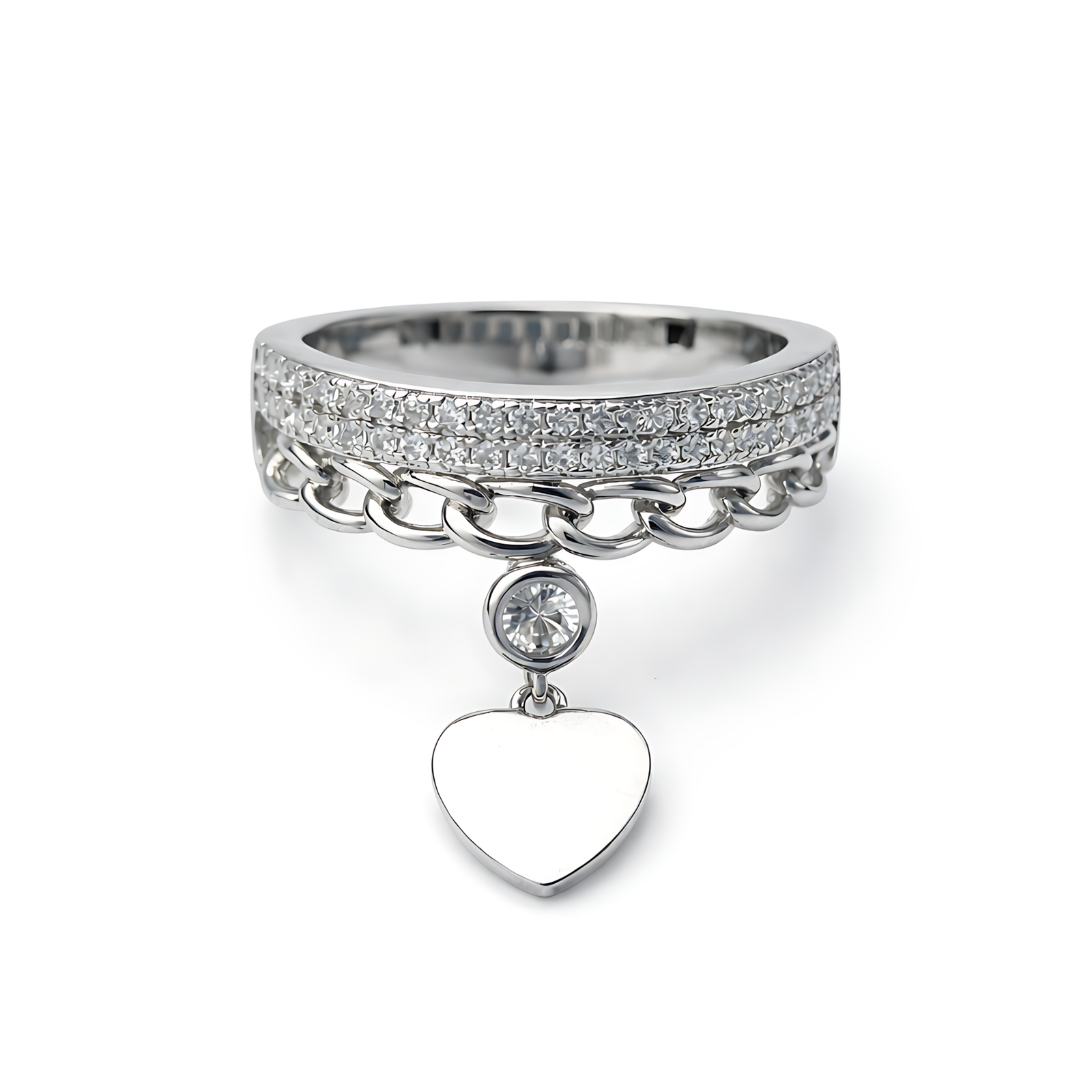A unique silver-toned statement ring featuring a wide pavé-set band paired with a delicate curb chain lower tier, finished with a dangling bezel-set crystal and a polished silver heart.