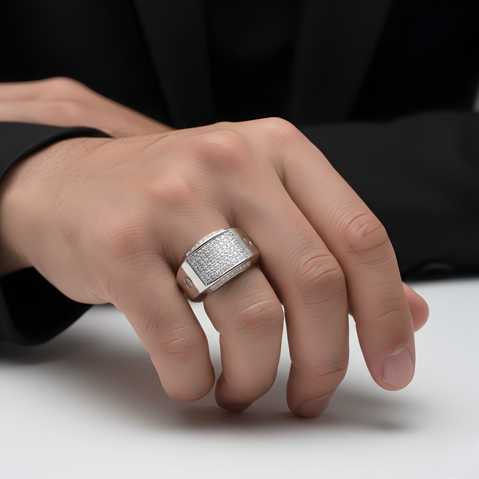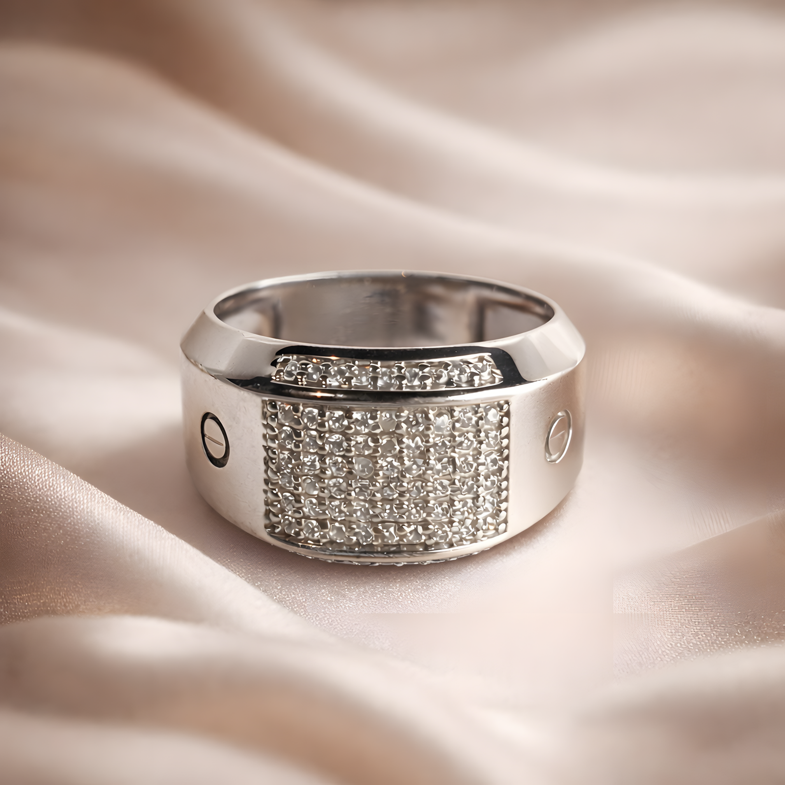A robust masculine Ring featuring a wide, rectangular face encrusted with pavé stones and accented by distinct circular hardware detailing on the sides.