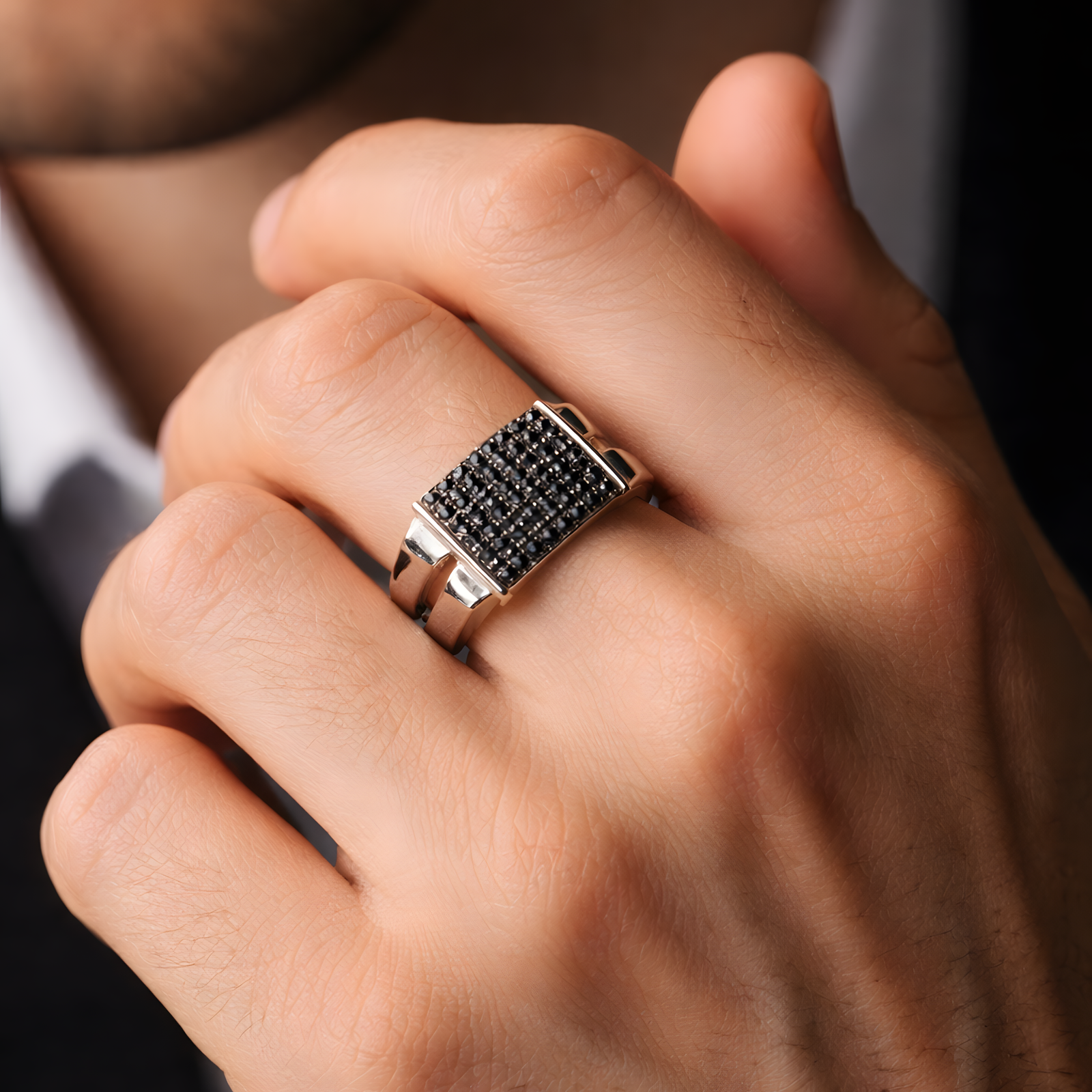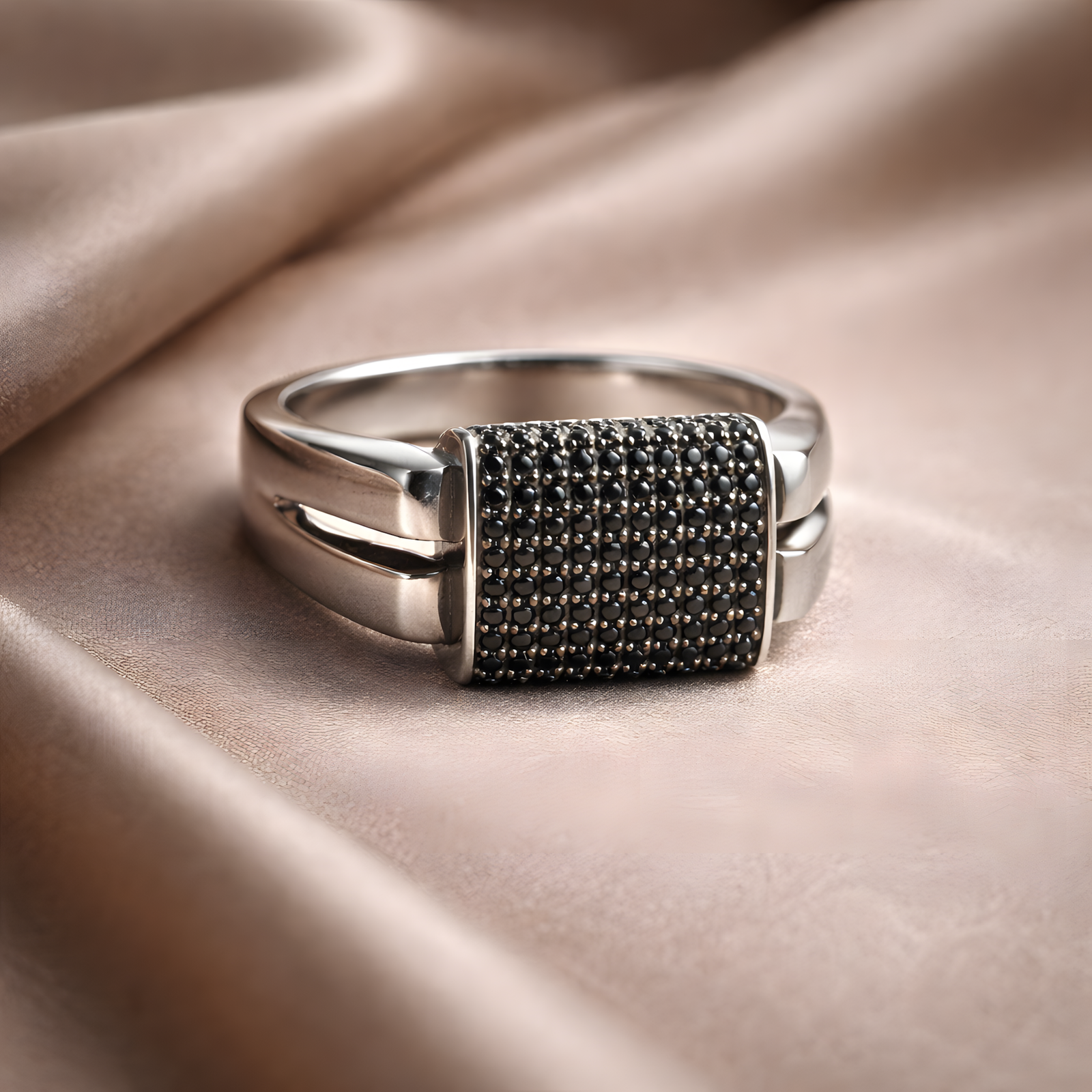 A striking industrial-style Ring featuring a prominent square face fully encrusted with black pavé stones and a unique split-shank design.