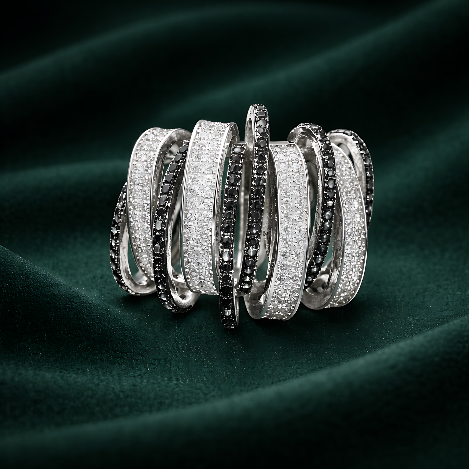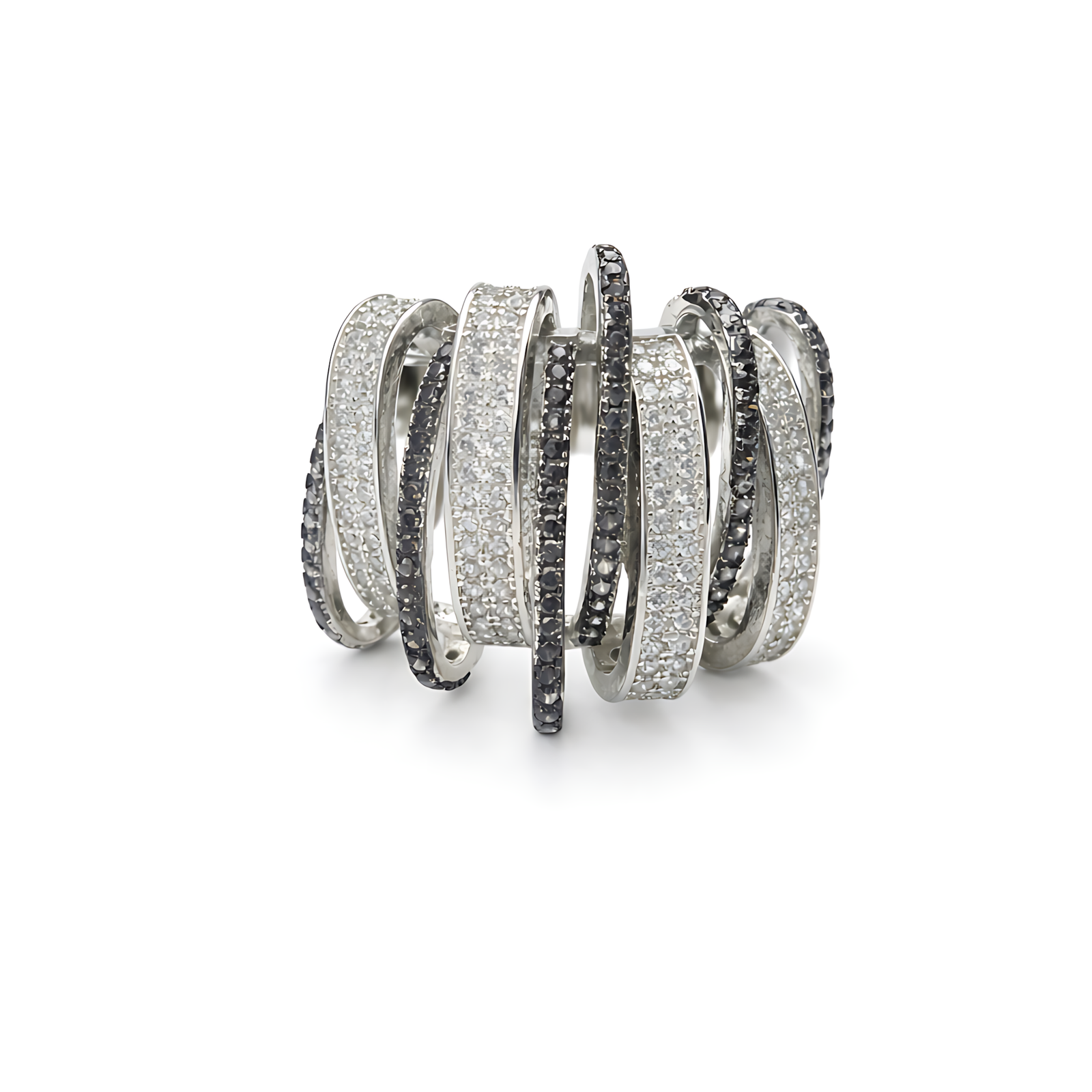 A bold silver-toned statement ring featuring a series of interlocking, irregular bands encrusted with alternating white and black pavé crystals for a textured, multi-layered look.
