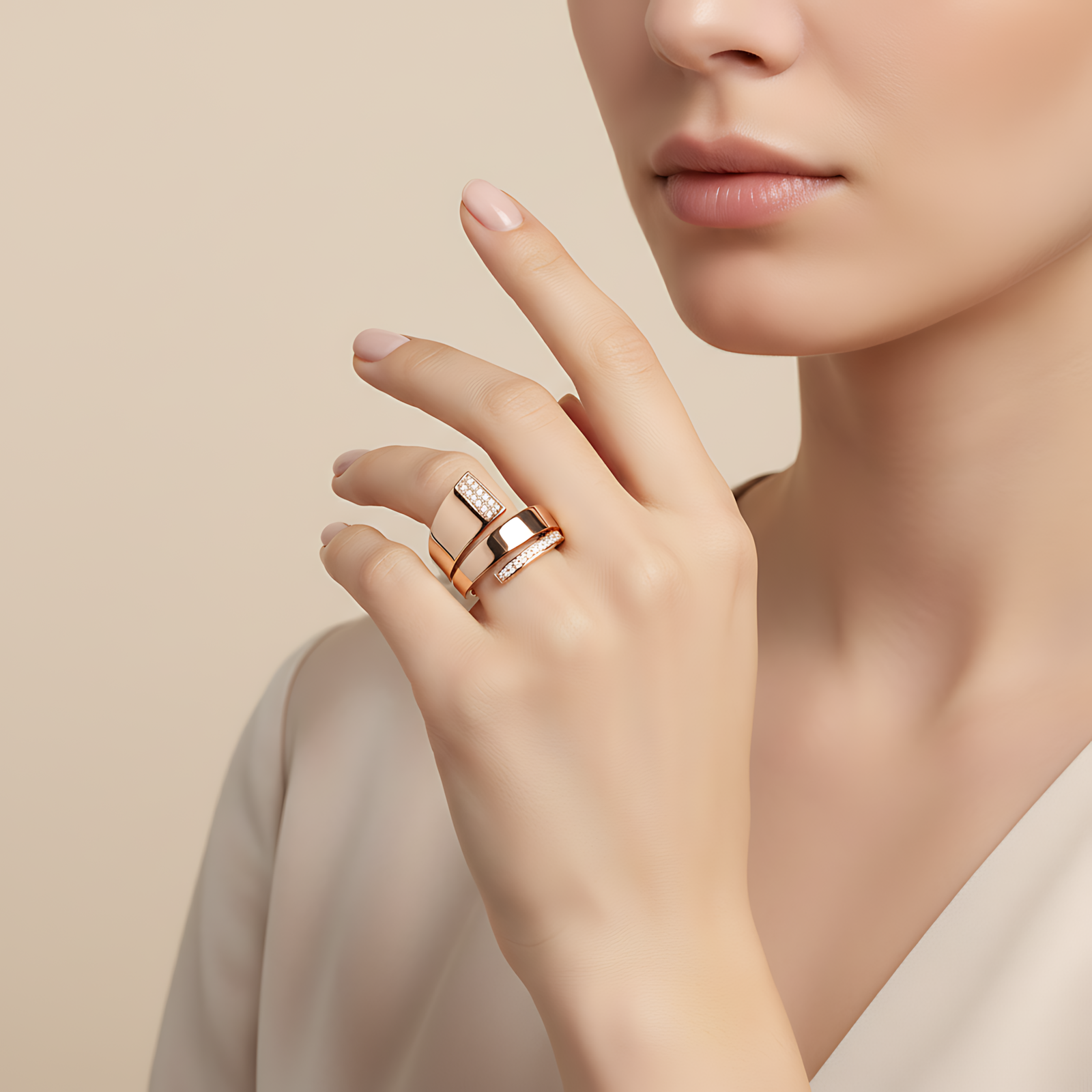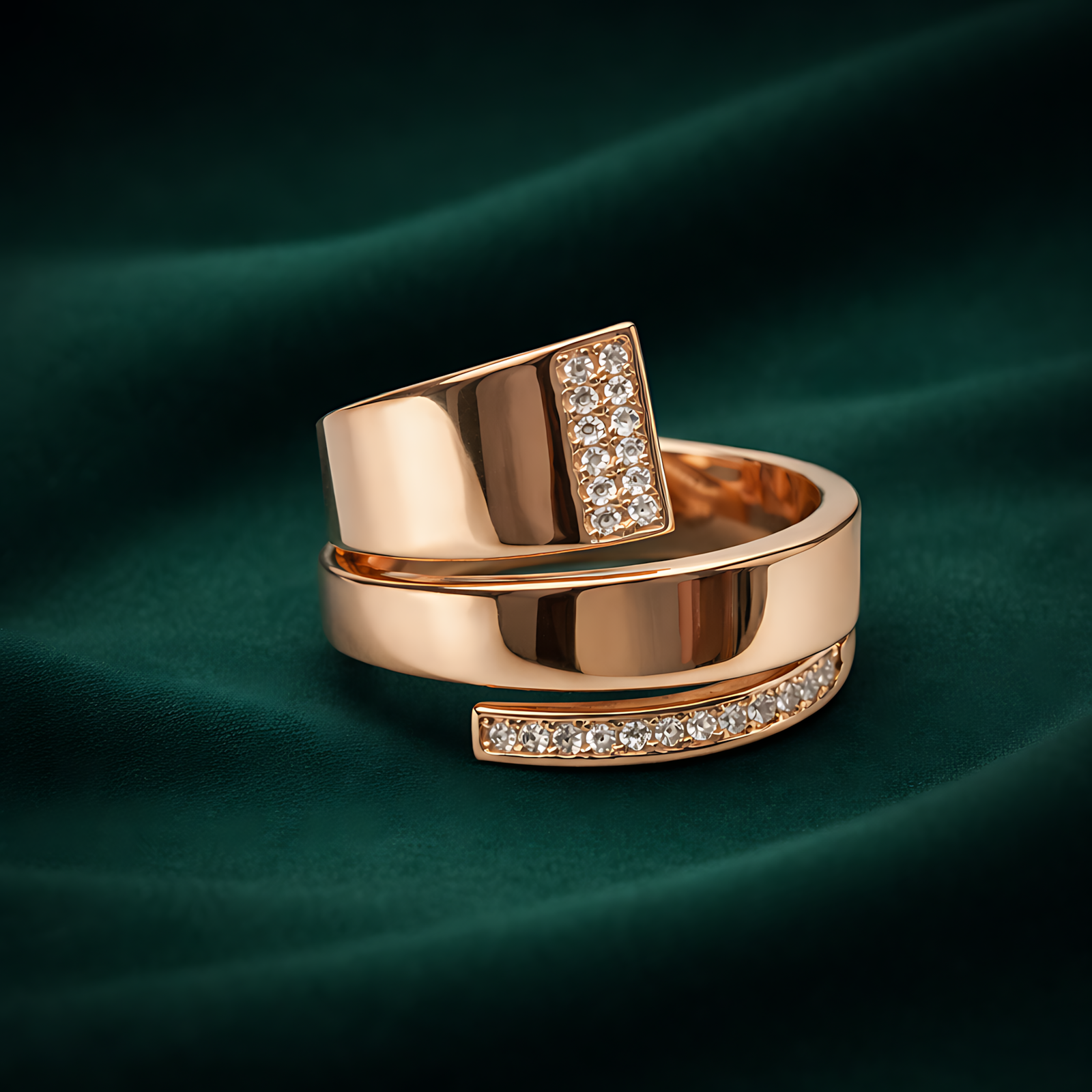 A modern rose gold-toned wrap ring featuring a wide polished band that spirals around the finger, accented with a rectangular pavé crystal bar and a shimmering crystal-set edge.