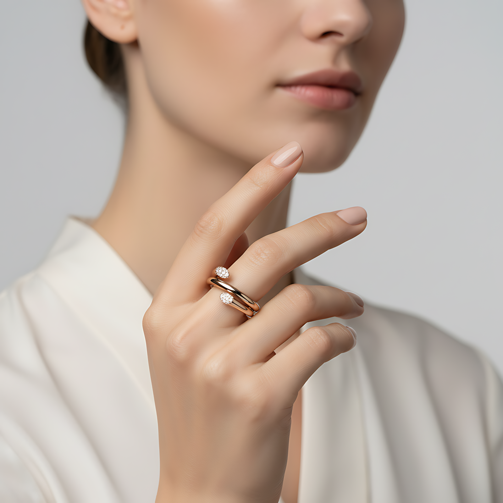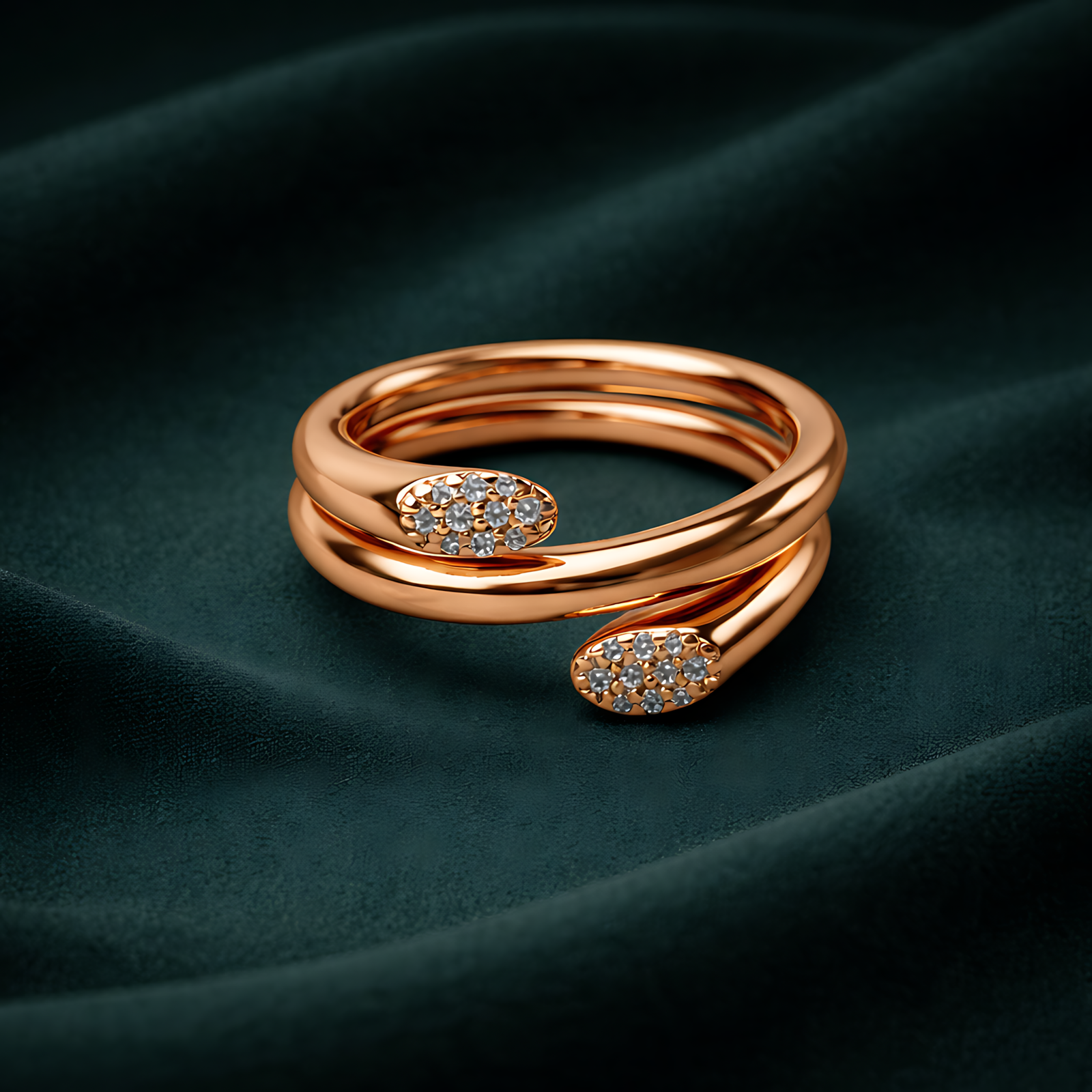 A sleek rose gold-toned wrap ring featuring a triple-layered spiral design tipped with shimmering pavé crystal accents.