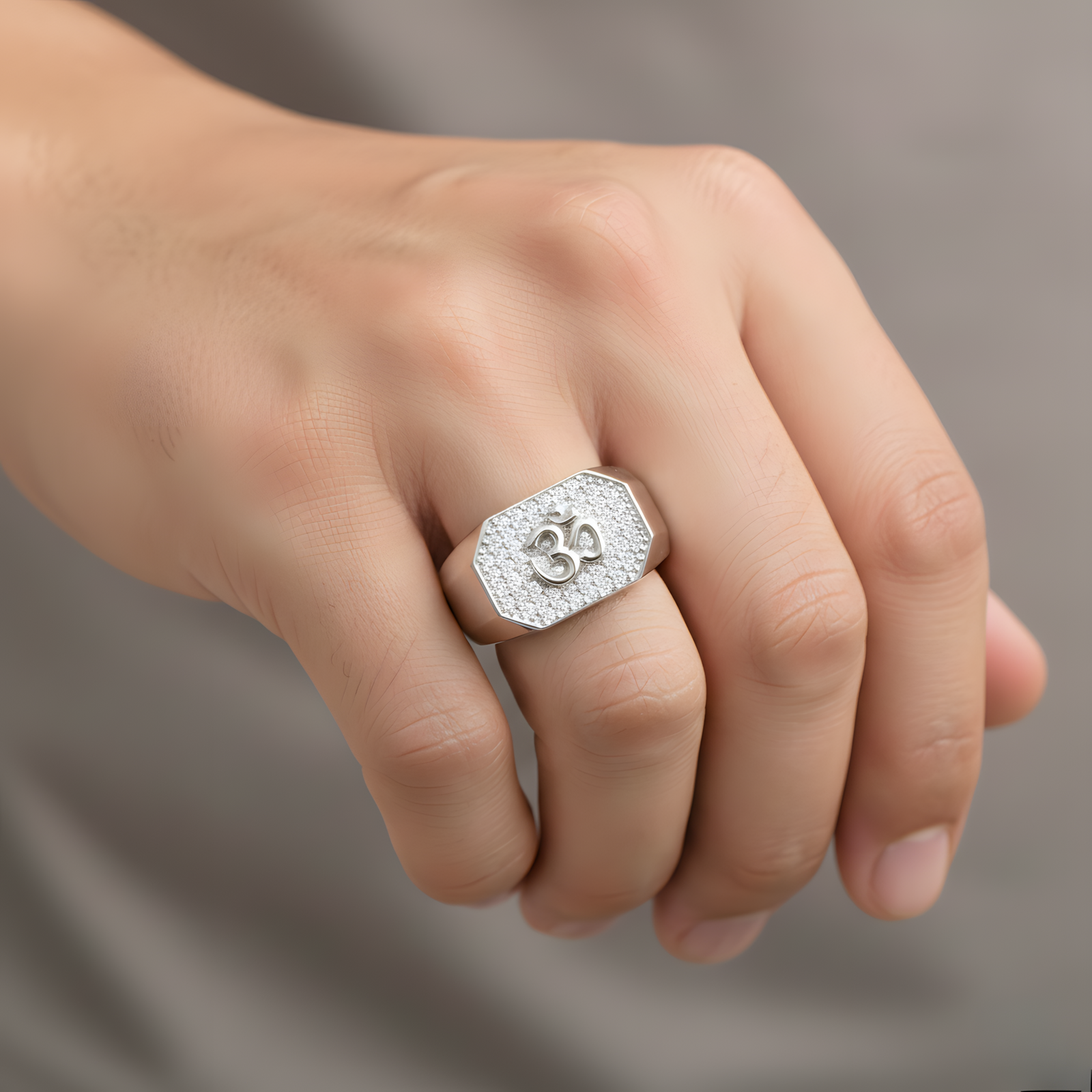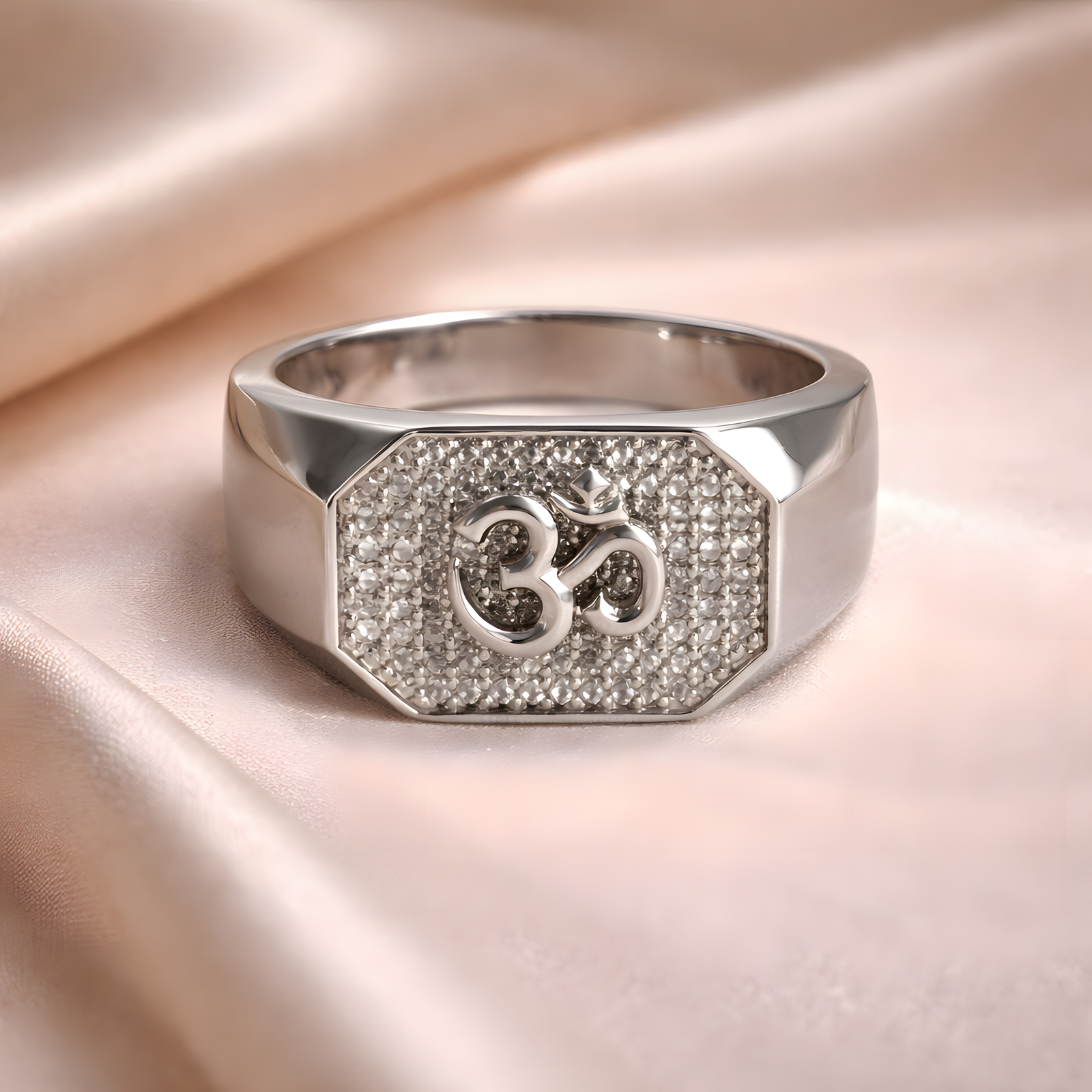 A spiritual and bold Ring showcasing a central “Om” symbol layered over a dense bed of shimmering pavé diamonds on a polished silver setting.
