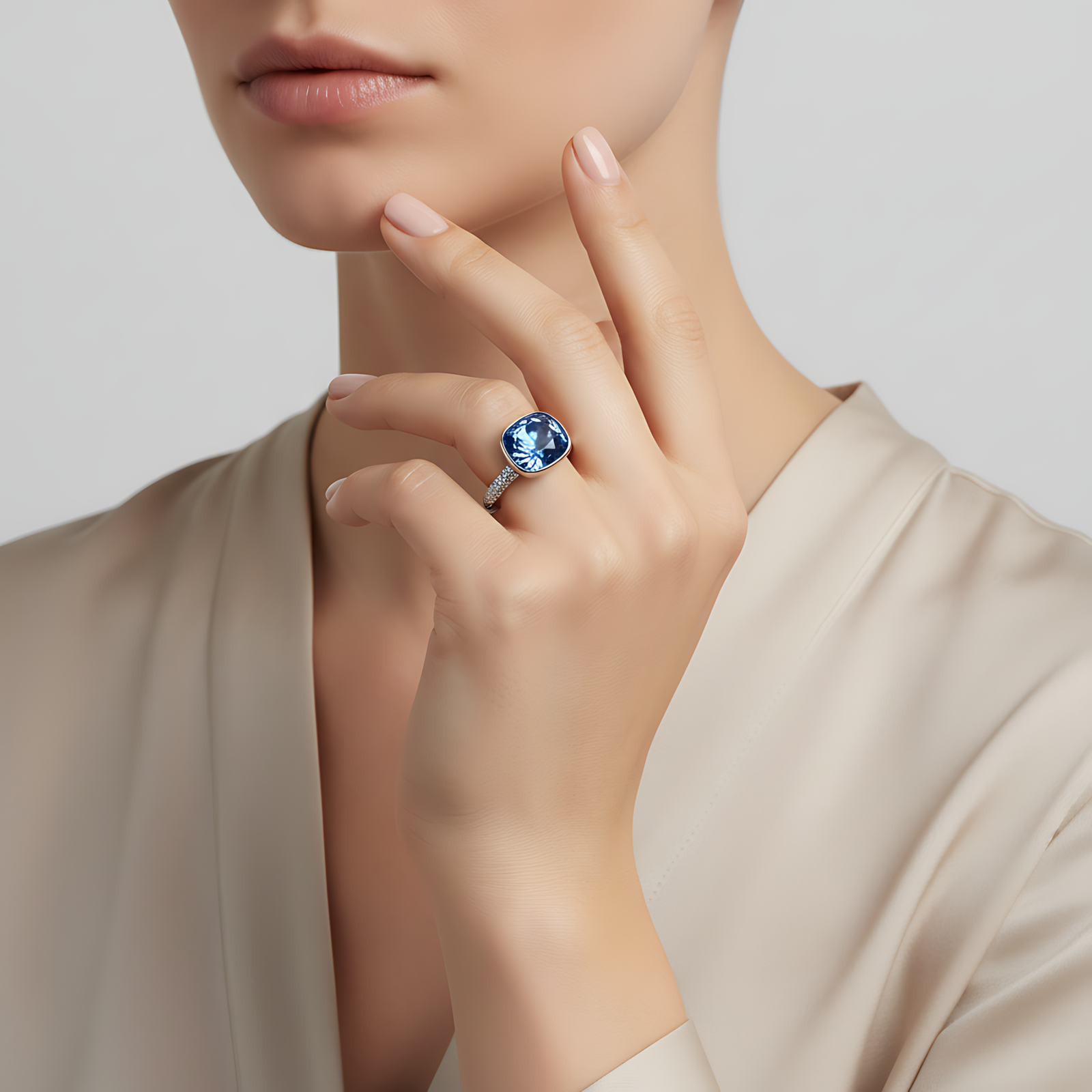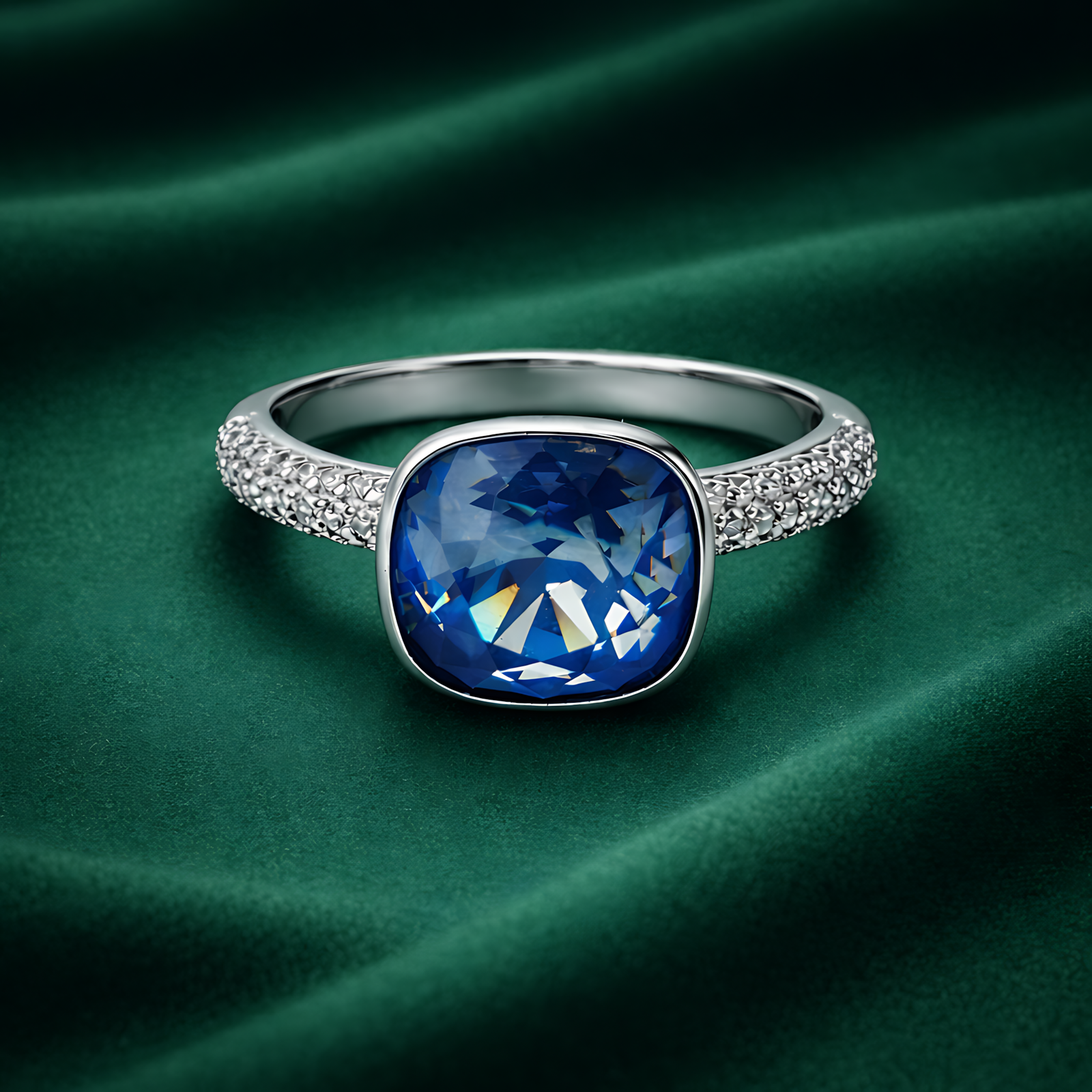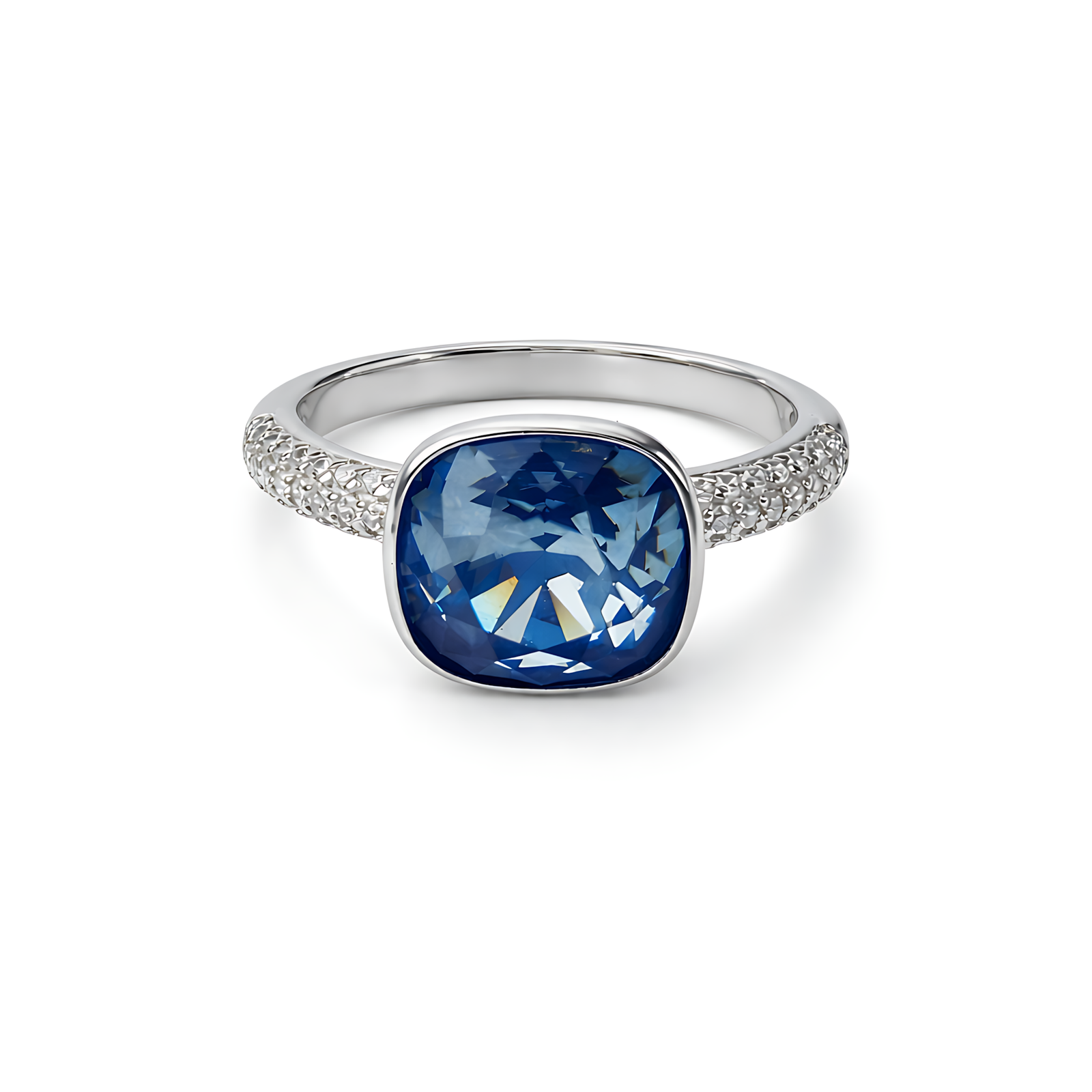 A bold silver-toned ring featuring a large, brilliant cushion-cut sapphire blue center stone set on a shimmering pavé-encrusted band.