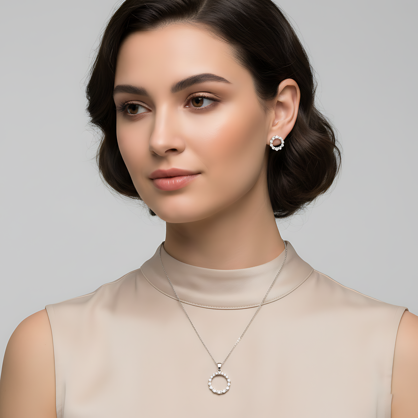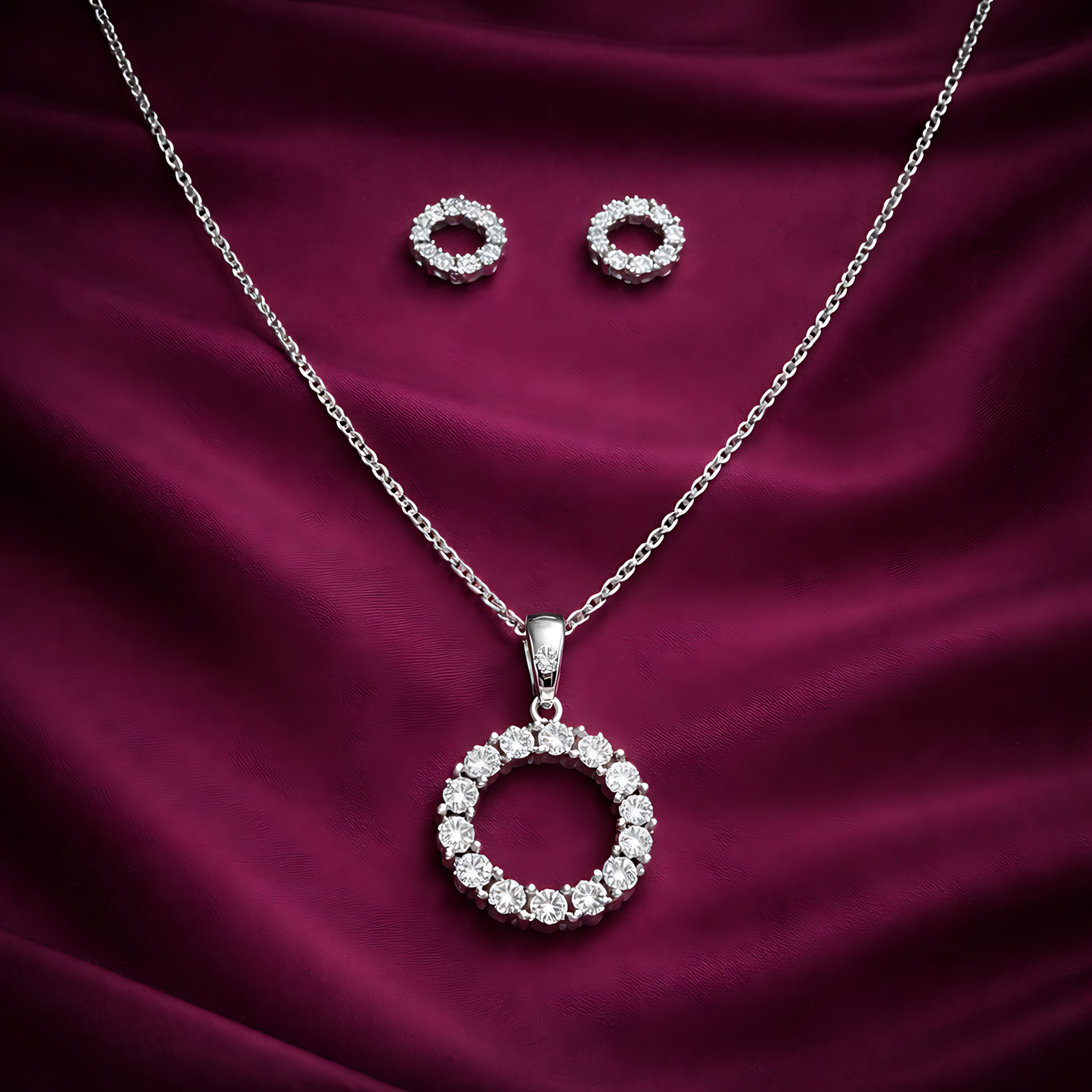 This is an elegant jewelry set featuring a sleek silver-toned chain paired with a circular pendant