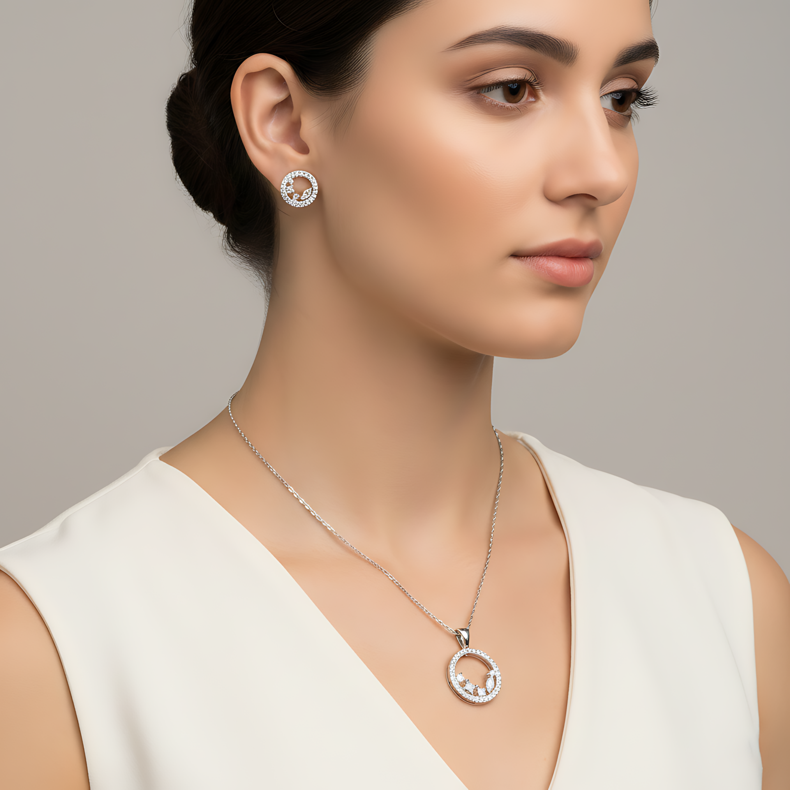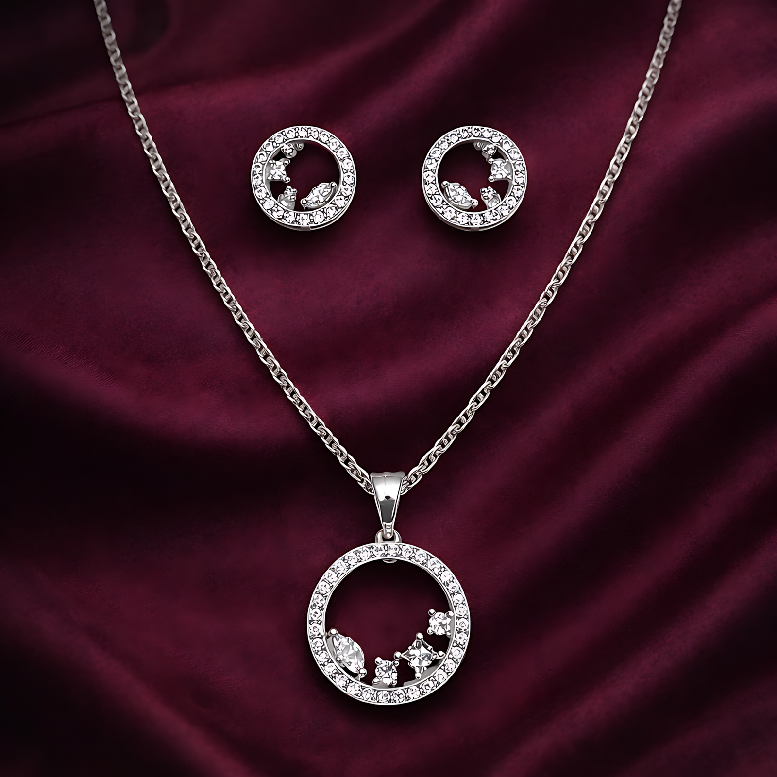 A classic circular pendant with matching studs, crafted in silver for timeless sparkle.