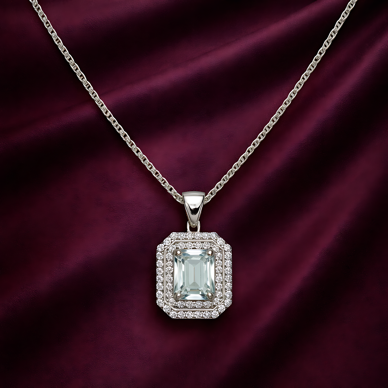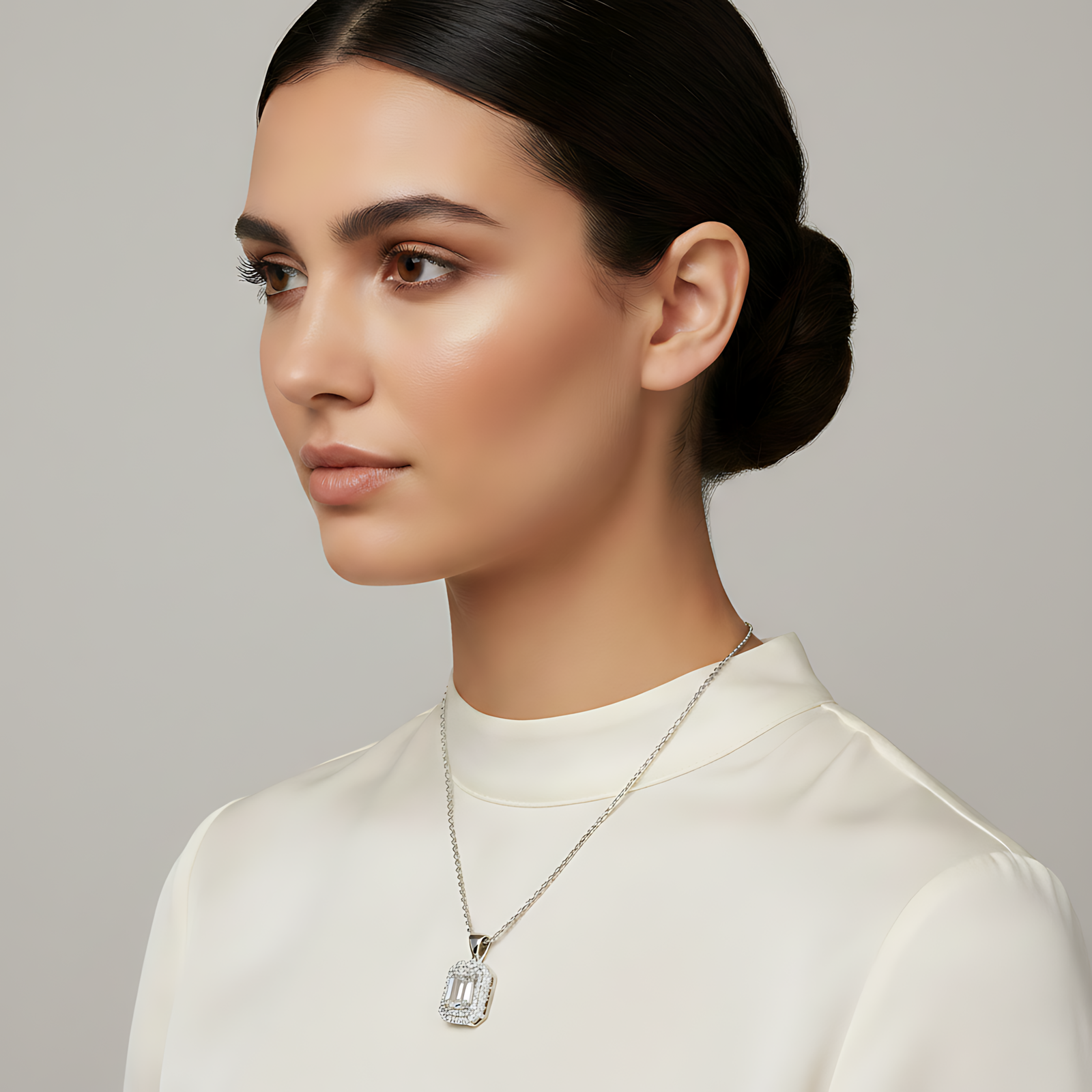 A striking rectangular-cut center stone encased in two concentric borders of brilliant accents, offering a bold, architectural look with maximum light reflection.