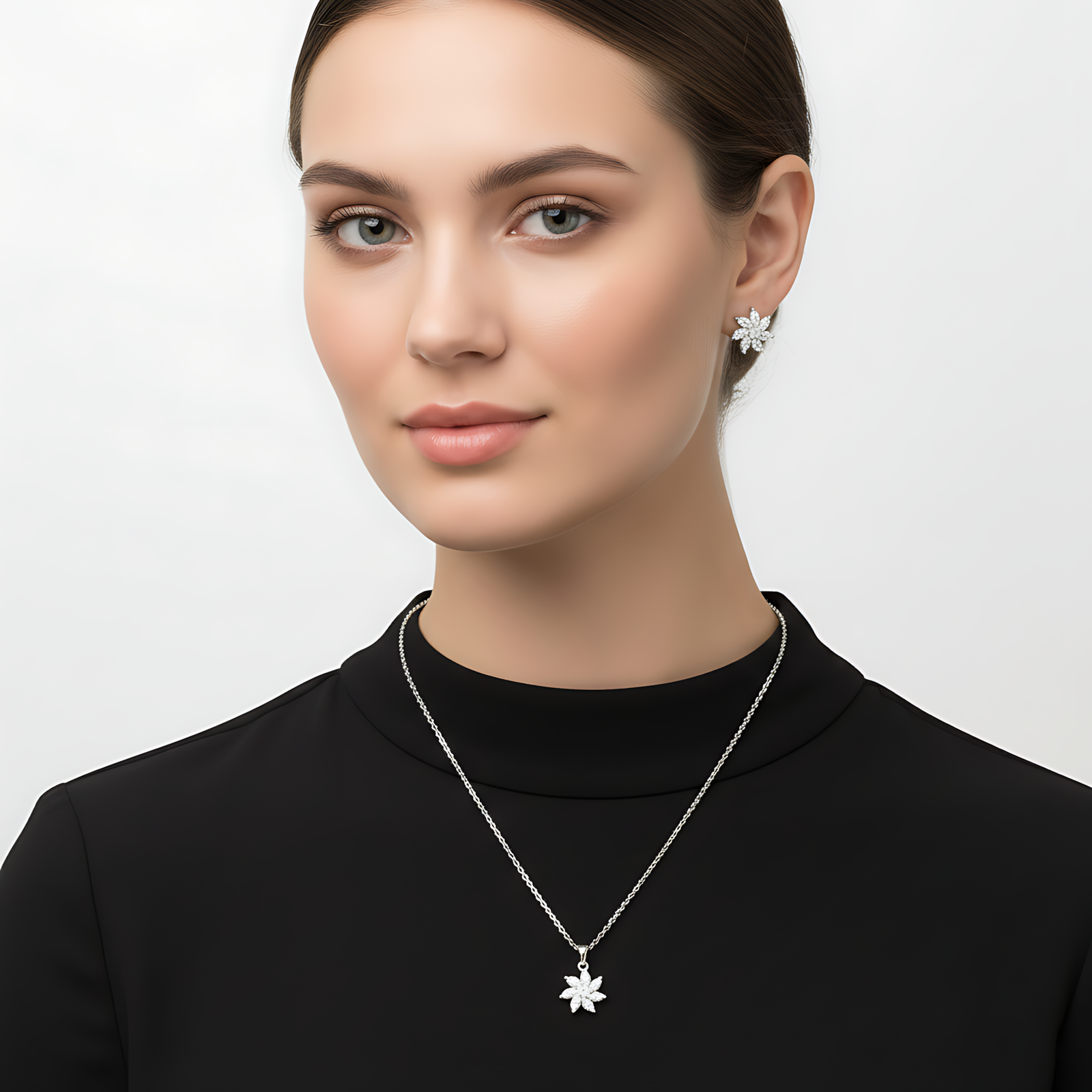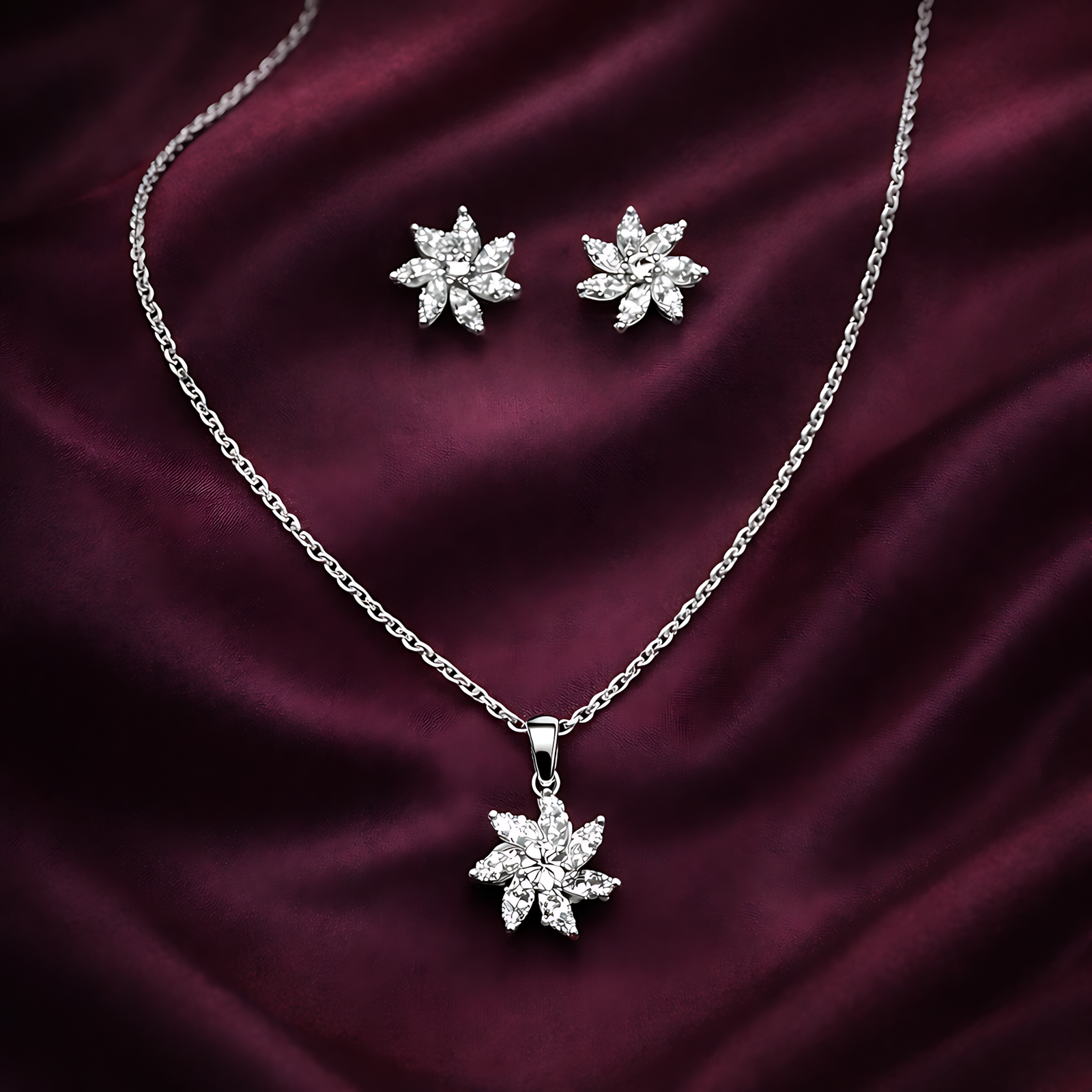 A delicate star-shaped pendant with matching studs, crafted in silver for subtle everyday sparkle.